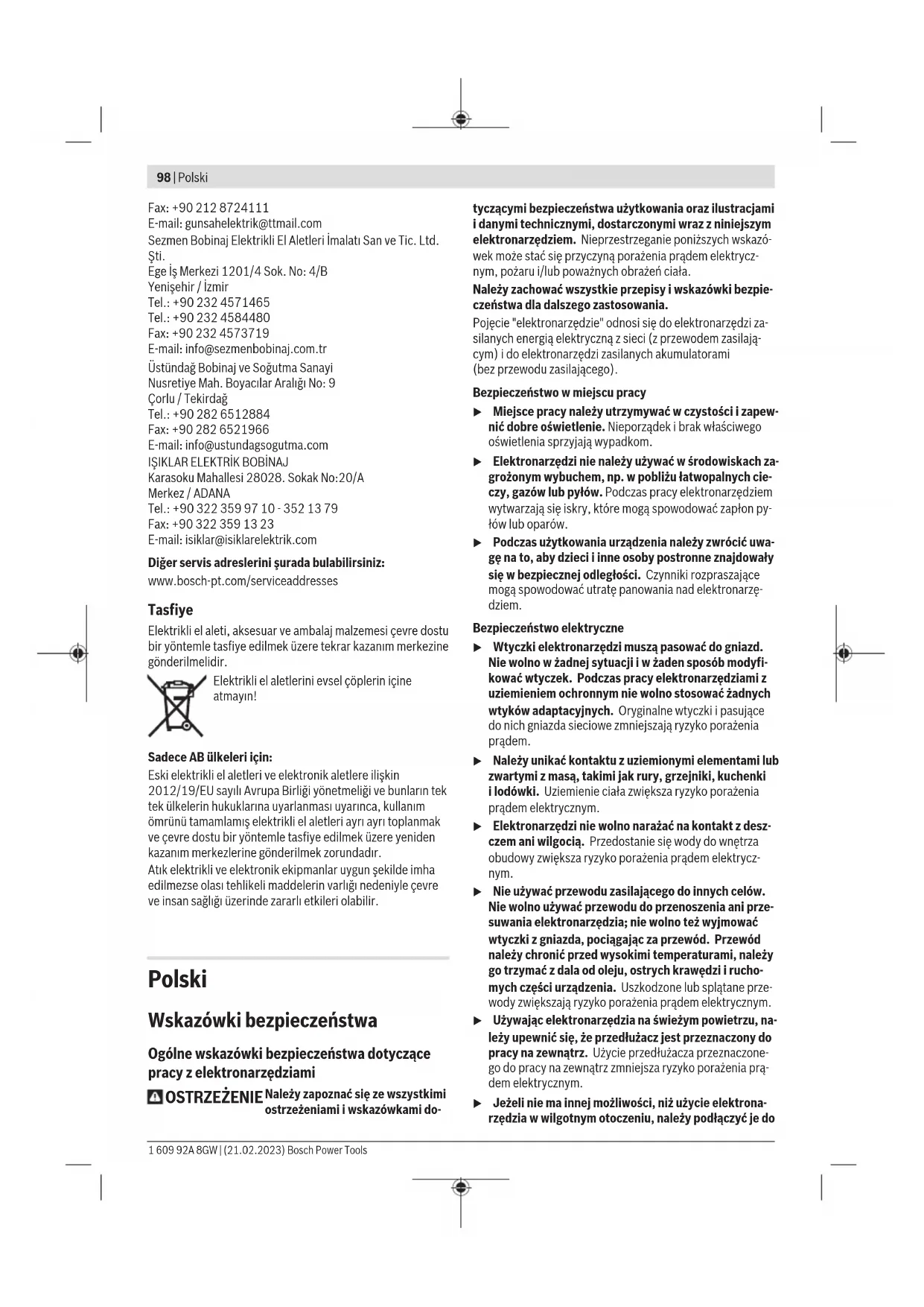 Karasoku Mahallesi 28028. Sokak No:20/A Merkez / ADANA Tel.: +903223599710 -3521379 Fax: +903223591323 E-mail: isiklar@isiklarelektrik.com Diğer servis adreslerini şurada bulabilirsiniz: www.bosch-pt.com/serviceaddresses Tasfiye Elektrikli el aleti, aksesuar ve ambalaj malzemesi çevre dostu bir yöntemle tasfiye edilmek üzere tekrar kazanım merkezine gönderilmelidir. Elektrikli el aletlerini evsel çöplerin içine atmayın! Sadece AB ülkeleri için: Eski elektrikli el aletleri ve elektronik aletlere ilişkin 2012/19/EU sayılı Avrupa Birliği yönetmeliği ve bunların tek tek ülkelerin hukuklarına uyarlanması uyarınca, kullanım ömrünü tamamlamış elektrikli el aletleri ayrı ayrı toplanmak ve çevre dostu bir yöntemle tasfiye edilmek üzere yeniden kazanım merkezlerine gönderilmek zorundadır. Atık elektrikli ve elektronik ekipmanlar uygun şekilde imha edilmezse olası tehlikeli maddelerin varlığı nedeniyle çevre ve insan sağlığı üzerinde zararlı etkileri olabilir. Polski Wskazówki bezpieczeństwa Ogólne wskazówki bezpieczeństwa dotyczące pracy z elektronarzędziami OSTRZEŻENIE Należy zapoznać się ze wszystkimi ostrzeżeniami i wskazówkami do- tyczącymi bezpieczeństwa użytkowania oraz ilustracjami i danymi technicznymi, dostarczonymi wraz z niniejszym elektronarzędziem. Nieprzestrzeganie poniższych wskazó- wek może stać się przyczyną porażenia prądem elektrycz- nym, pożaru i/lub poważnych obrażeń ciała. Należy zachować wszystkie przepisy i wskazówki bezpie- czeństwa dla dalszego zastosowania. Pojęcie "elektronarzędzie" odnosi się do elektronarzędzi za- silanych energią elektryczną z sieci (z przewodem zasilają- cym) i do elektronarzędzi zasilanych akumulatorami (bezprzewodu zasilającego). Bezpieczeństwo w miejscu pracy u Miejsce pracy należy utrzymywać w czystości i zapew- nić dobre oświetlenie. Nieporządek i brak właściwego oświetlenia sprzyjają wypadkom. u Elektronarzędzi nie należy używać w środowiskach za- grożonym wybuchem, np. w pobliżu łatwopalnych cie- czy, gazów lub pyłów. Podczas pracy elektronarzędziem wytwarzają się iskry, które mogą spowodować zapłon py- łów lub oparów. u Podczas użytkowania urządzenia należy zwrócić uwa- gę na to, aby dzieci i inne osoby postronne znajdowały się w bezpiecznej odległości. Czynniki rozpraszające mogą spowodować utratę panowania nad elektronarzę- dziem. Bezpieczeństwo elektryczne u Wtyczki elektronarzędzi muszą pasować do gniazd. Nie wolno w żadnej sytuacji i w żaden sposób modyfi- kować wtyczek. Podczas pracy elektronarzędziami z uziemieniem ochronnym nie wolno stosować żadnych wtyków adaptacyjnych. Oryginalne wtyczki i pasujące do nich gniazda sieciowe zmniejszają ryzyko porażenia prądem. u Należy unikać kontaktu z uziemionymi elementami lub zwartymi z masą, takimi jak rury, grzejniki, kuchenki ilodówki. Uziemienie ciała zwiększa ryzyko porażenia prądem elektrycznym. u Elektronarzędzi nie wolno narażać na kontakt z desz- czem ani wilgocią. Przedostanie się wody do wnętrza obudowy zwiększa ryzyko porażenia prądem elektrycz- nym. u Nie używać przewodu zasilającego do innych celów. Nie wolno używać przewodu do przenoszenia ani prze- suwania elektronarzędzia; nie wolno też wyjmować wtyczki z gniazda, pociągając za przewód. Przewód należy chronić przed wysokimi temperaturami, należy go trzymać zdala od oleju, ostrych krawędzi i rucho- mych części urządzenia. Uszkodzone lub splątane prze- wody zwiększają ryzyko porażenia prądem elektrycznym. u Używając elektronarzędzia na świeżym powietrzu, na- leży upewnić się, że przedłużacz jest przeznaczony do pracy na zewnątrz. Użycie przedłużacza przeznaczone- go do pracy na zewnątrz zmniejsza ryzyko porażenia prą- dem elektrycznym. u Jeżeli nie ma innej możliwości, niż użycie elektrona- rzędzia w wilgotnym otoczeniu, należy podłączyć je do 1 609 92A 8GW | (21.02.2023) Bosch Power ToolsPolski | 99 źródła zasilania wyposażonego w wyłącznik ochronny różnicowoprądowy. Zastosowanie wyłącznika ochron- nego różnicowoprądowego zmniejsza ryzyko porażenia prądem elektrycznym. Bezpieczeństwo osób u Podczas pracy z elektronarzędziem należy zachować czujność, każdą czynność wykonywać ostrożnie i z rozwagą. Nie przystępować do pracy elektronarzę- dziem w stanie zmęczenia lub będąc pod wpływem narkotyków, alkoholu lub leków. Chwila nieuwagi pod- czas pracy może grozić bardzo poważnymi obrażeniami ciała. u Stosować środki ochrony osobistej. Należy zawsze nosić okulary ochronne. Środki ochrony osobistej, np. maska przeciwpyłowa, antypoślizgowe obuwie, kask ochronny czy ochraniacze na uszy, w określonych warun- kach pracy obniżają ryzyko obrażeń ciała. u Należy unikać niezamierzonego uruchomienia narzę- dzia. Przed podłączeniem elektronarzędzia do źródła zasilania i/lub podłączeniem akumulatora, podniesie- niem albo transportem urządzenia, należy upewnić się, że włącznik elektronarzędzia znajduje się w pozy- cji wyłączonej. Przenoszenie elektronarzędzia z palcem opartym na włączniku/wyłączniku lub włożenie do gniaz- da sieciowego wtyczki włączonego narzędzia, może stać się przyczyną wypadków. u Przed włączeniem elektronarzędzia należy usunąć wszystkie narzędzia nastawcze i klucze maszynowe. Narzędzia lub klucze, pozostawione wruchomych czę- ściach urządzenia, mogą spowodować obrażenia ciała. u Należy unikać nienaturalnych pozycji przy pracy. Na- leży dbać o stabilną pozycję przy pracy i zachowanie równowagi. Dzięki temu można będzie łatwiej zapano- wać nad elektronarzędziem w nieprzewidzianych sytu- acjach. u Należy nosić odpowiednią odzież. Nie należy nosić luźnej odzieży ani biżuterii. Włosy i odzież należy trzy- mać z dala od ruchomych części. Luźna odzież, biżuteria lub długie 