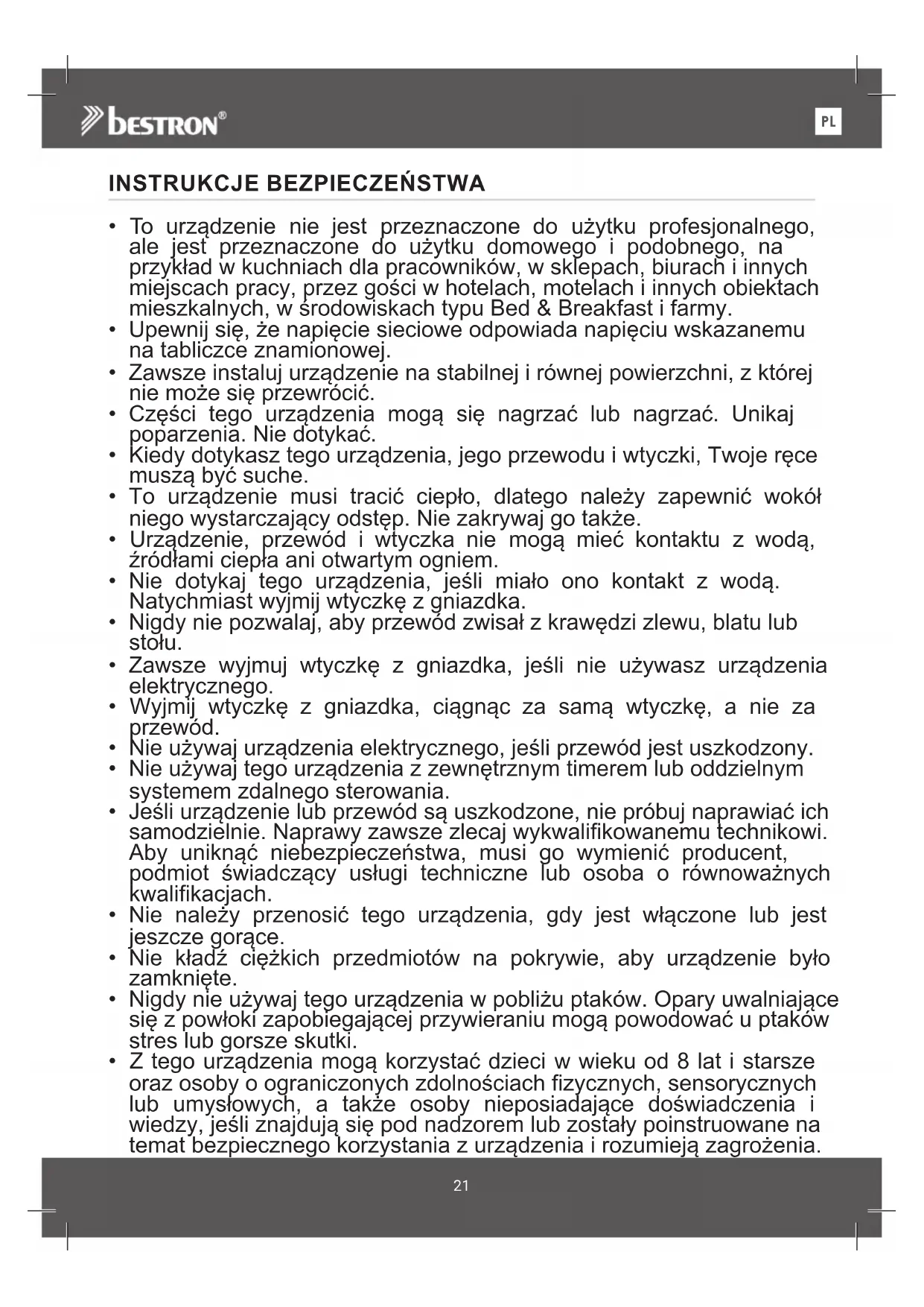 - Z tego urządzenia mogą korzystać dzieci w wieku od 8 lat i starsze oraz osoby o ograniczonych zdolnościach zycznych, sensorycznych lub umysłowych, a także osoby nieposiadające doświadczenia i wiedzy, jeśli znajdują się pod nadzorem lub zostały poinstruowane na temat bezpiecznego korzystania z urządzenia i rozumieją zagrożenia.PL