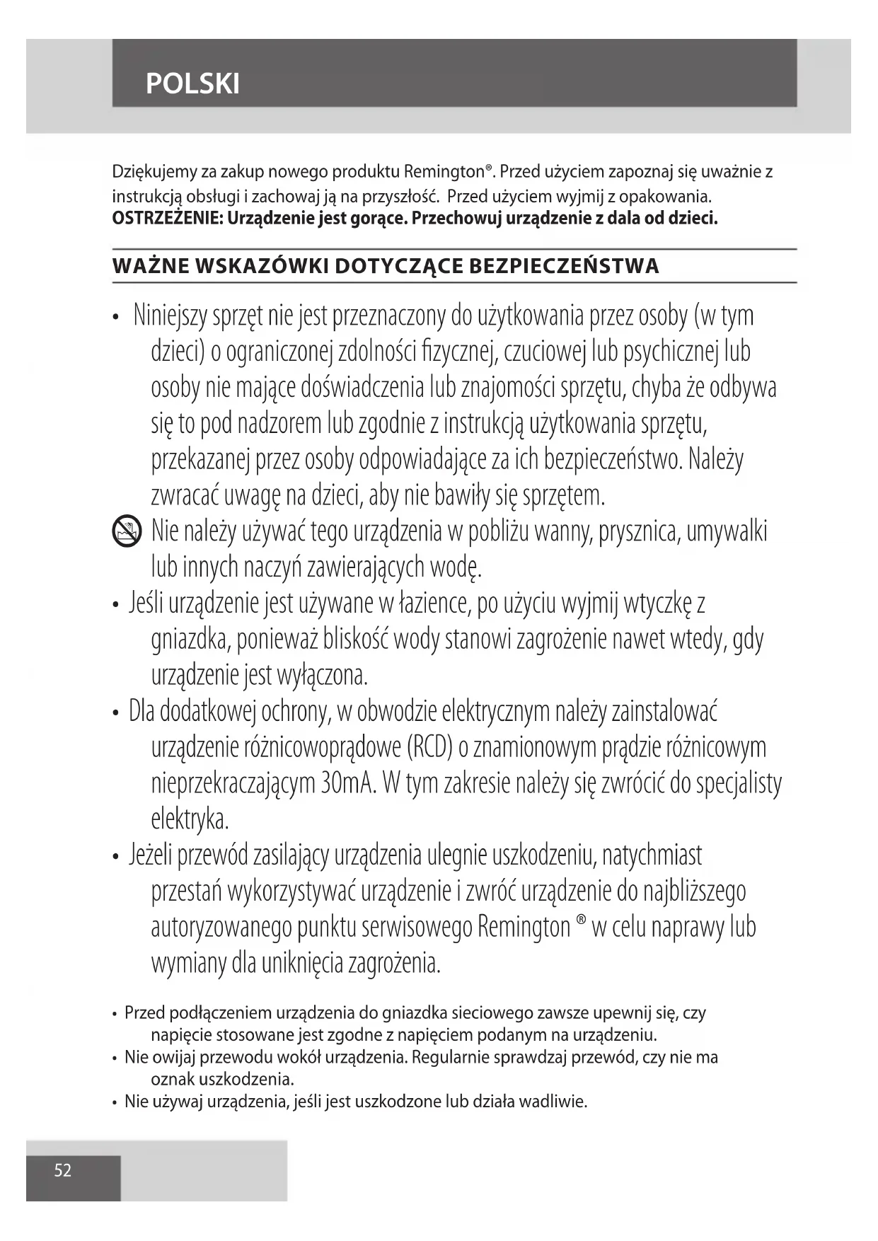 AE52 Dziękujemy za zakup nowego produktu Remington®. Przed użyciem zapoznaj się uważnie z instrukcją obsługi i zachowaj ją na przyszłość. Przed użyciem wyjmij z opakowania. OSTRZEŻENIE: Urządzenie jest gorące. Przechowuj urządzenie z dala od dzieci. WAŻNE WSKAZÓWKI DOTYCZĄCE BEZPIECZEŃSTWA