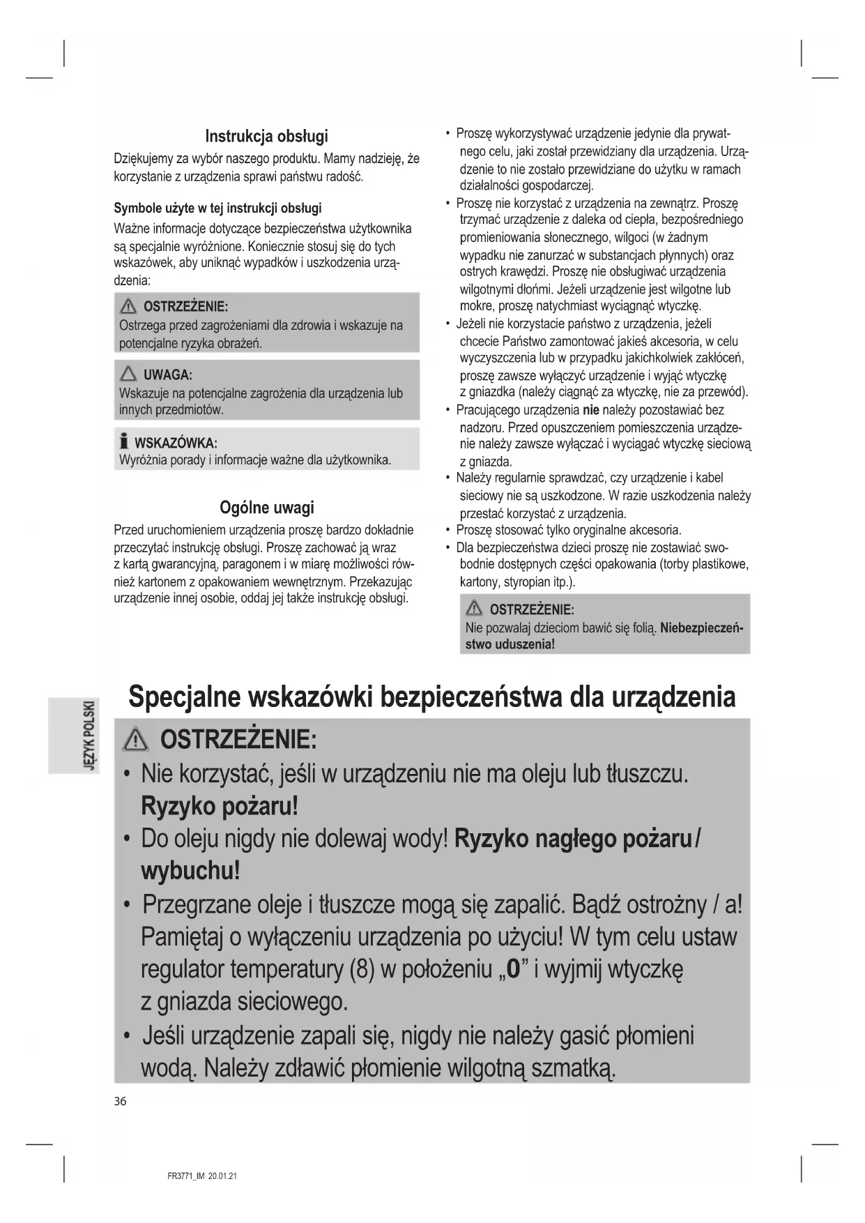 - Jeśli urządzenie zapali się, nigdy nie należy gasić płomieni wodą. Należy zdławić płomienie wilgotną szmatką.FR3771_IM 20.01.21