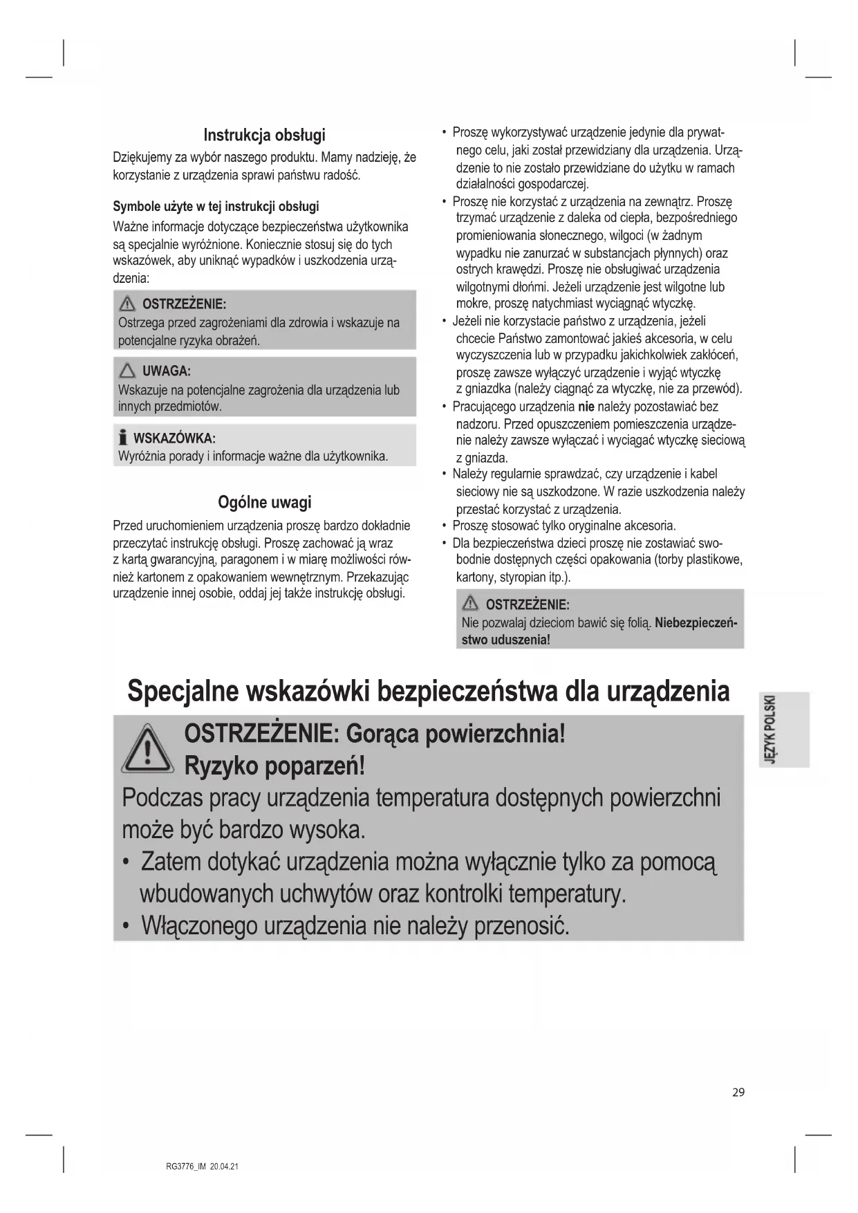 - Dla bezpieczeństwa dzieci proszę nie zostawiać swo- bodnie dostępnych części opakowania (torby plastikowe, kartony, styropian itp.). OSTRZEŻENIE: Nie pozwalaj dzieciom bawić się folią. Niebezpieczeń- stwo uduszenia! Specjalne wskazówki bezpieczeństwa dla urządzenia OSTRZEŻENIE: Gorąca powierzchnia! Ryzyko poparzeń! Podczas pracy urządzenia temperatura dostępnych powierzchni może być bardzo wysoka.
