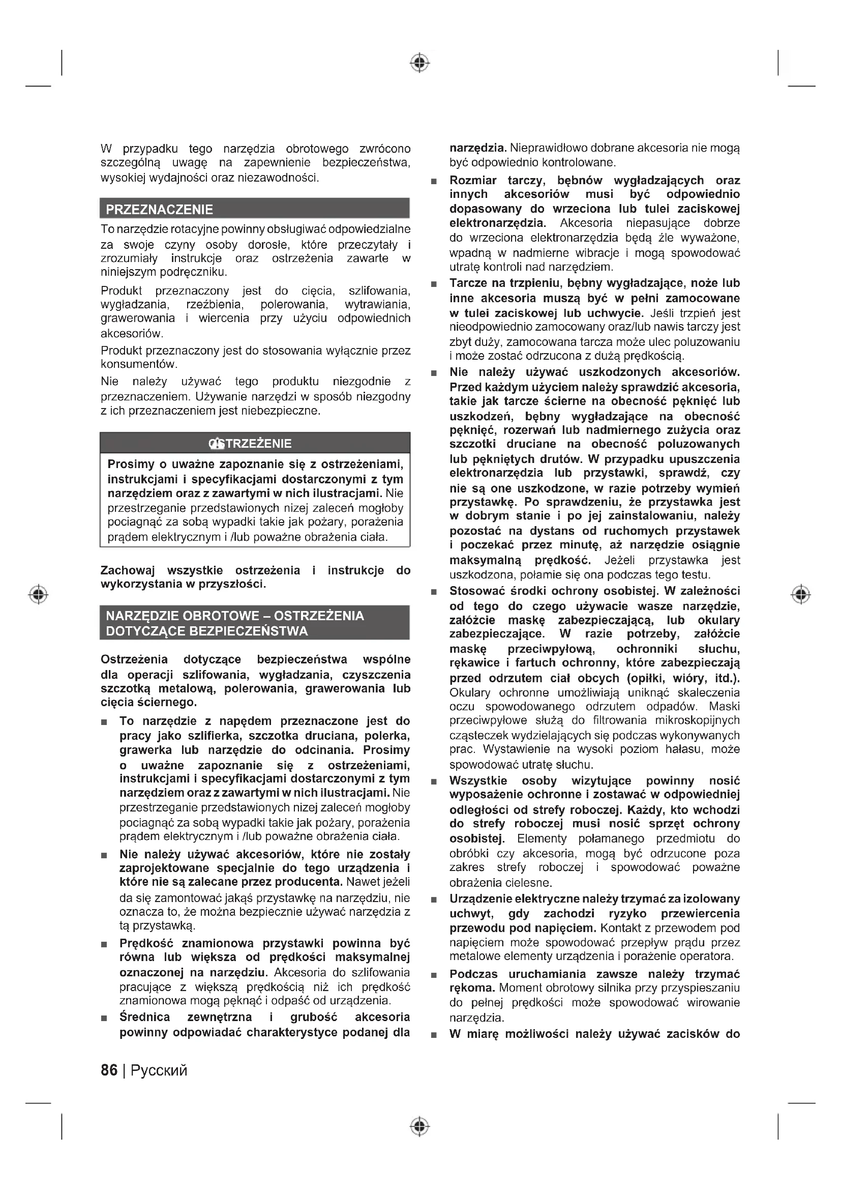 Ostrzeżenia dotyczące bezpieczeństwa wspólne dla operacji szlifowania, wygładzania, czyszczenia szczotką metalową, polerowania, grawerowania lub cięcia ściernego. ■ To narzędzie z napędem przeznaczone jest do pracy jako szlifierka, szczotka druciana, polerka, grawerka lub narzędzie do odcinania. Prosimy o uważne zapoznanie się z ostrzeżeniami, instrukcjami i specyfikacjami dostarczonymi z tym narzędziem oraz z zawartymi w nich ilustracjami. Nie przestrzeganie przedstawionych nizej zaleceń mogłoby pociagnąć za sobą wypadki takie jak pożary, porażenia prądem elektrycznym i /lub poważne obrażenia ciała. ■ Nie należy używać akcesoriów, które nie zostały zaprojektowane specjalnie do tego urządzenia i które nie są zalecane przez producenta. Nawet jeżeli da się zamontować jakąś przystawkę na narzędziu, nie oznacza to, że można bezpiecznie używać narzędzia z tą przystawką. ■ Prędkość znamionowa przystawki powinna być równa lub większa od prędkości maksymalnej oznaczonej na narzędziu. Akcesoria do szlifowania pracujące z większą prędkością niż ich prędkość znamionowa mogą pęknąć i odpaść od urządzenia. ■ Średnica zewnętrzna i grubość akcesoria powinny odpowiadać charakterystyce podanej dla narzędzia. Nieprawidłowo dobrane akcesoria nie mogą być odpowiednio kontrolowane. ■ Rozmiar tarczy, bębnów wygładzających oraz innych akcesoriów musi być odpowiednio dopasowany do wrzeciona lub tulei zaciskowej elektronarzędzia. Akcesoria niepasujące dobrze do wrzeciona elektronarzędzia będą źle wyważone, wpadną w nadmierne wibracje i mogą spowodować utratę kontroli nad narzędziem. ■ Tarcze na trzpieniu, bębny wygładzające, noże lub inne akcesoria muszą być w pełni zamocowane w tulei zaciskowej lub uchwycie. Jeśli trzpień jest nieodpowiednio zamocowany oraz/lub nawis tarczy jest zbyt duży, zamocowana tarcza może ulec poluzowaniu i może zostać odrzucona z dużą prędkością. ■ Nie należy używać uszkodzonych akcesoriów. Przed każdym użyciem należy sprawdzić akcesoria, takie jak tarcze ścierne na obecność pęknięć lub uszkodzeń, bębny wygładzające na obecność pęknięć, rozerwań lub nadmiernego zużycia oraz szczotki druciane na obecność poluzowanych lub pękniętych drutów. W przypadku upuszczenia elektronarzędzia lub przystawki, sprawdź, czy nie są one uszkodzone, w razie potrzeby wymień przystawkę. Po sprawdzeniu, że przystawka jest w dobrym stanie i po jej zainstalowaniu, należy pozostać na dystans od ruchomych przystawek i poczekać przez minutę, aż narzędzie osiągnie maksymalną prędkość. Jeżeli przystawka jest uszkodzona, połamie się ona podczas tego testu. ■ Stosować środki ochrony osobistej. W zależności od tego do czego używacie wasze narzędzie, załóżcie maskę zabezpieczającą, lub okulary zabezpieczające. W razie potrzeby, załóżcie maskę przeciwpyłową, ochronniki słuchu, rękawice i fartuch ochronny, które zabezpieczają przed odrzutem ciał obcych (opiłki, wióry, itd.). Okulary ochronne umożliwiają uniknąć skaleczenia oczu spowodowanego odrzutem odpadów. Maski przeciwpyłowe służą do filtrowania mikroskopijnych cząsteczek wydzielających się podczas wykonywanych prac. Wystawienie na wysoki poziom hałasu, może spowodować utratę słuchu. ■ Wszystkie osoby wizytujące powinny nosić wyposażenie ochronne i zostawać w odpowiedniej odległości od strefy roboczej. Każdy, kto wchodzi do strefy roboczej musi nosić sprzęt ochrony osobistej. Elementy połamanego przedmiotu do obróbki czy akcesoria, mogą być odrzucone poza zakres strefy roboczej i spowodować poważne obrażenia cielesne. ■ Urządzenie elektryczne należy trzymać za izolowany uchwyt, gdy zachodzi ryzyko przewiercenia przewodu pod napięciem. Kontakt z przewodem pod napięciem może spowodować przepływ prądu przez metalowe elementy urządzenia i porażenie operatora. ■ Podczas uruchamiania zawsze należy trzymać rękoma. Moment obrotowy silnika przy przyspieszaniu do pełnej prędkości może spowodować wirowanie narzędzia. ■ W miarę możliwości należy używać zacisków do87 Русский |