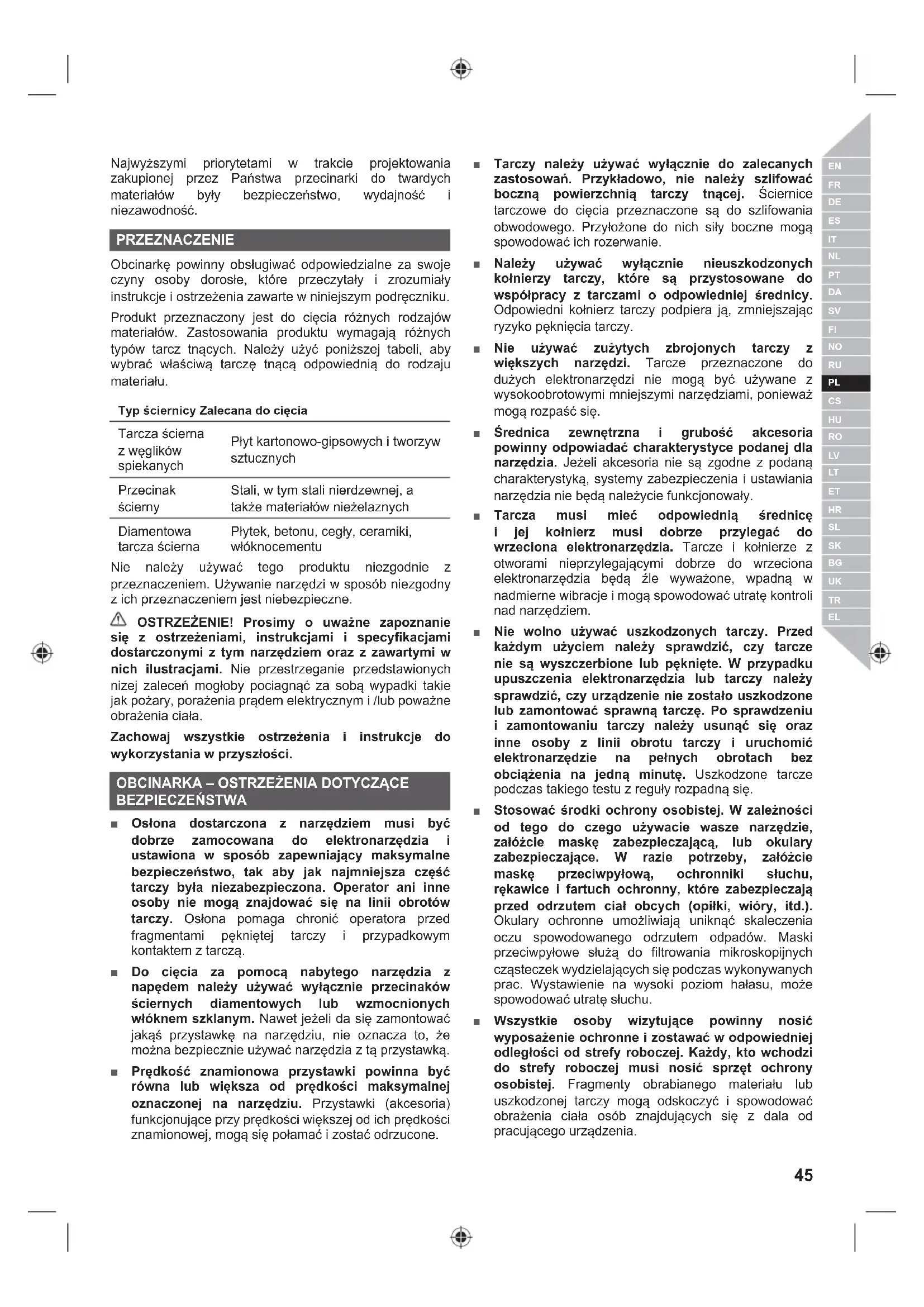 BEZPIECZEŃSTWA ■ Osłona dostarczona z narzędziem musi być dobrze zamocowana do elektronarzędzia i ustawiona w sposób zapewniający maksymalne bezpieczeństwo, tak aby jak najmniejsza część tarczy była niezabezpieczona. Operator ani inne osoby nie mogą znajdować się na linii obrotów tarczy. Osłona pomaga chronić operatora przed fragmentami pękniętej tarczy i przypadkowym kontaktem z tarczą. ■ Do cięcia za pomocą nabytego narzędzia z napędem należy używać wyłącznie przecinaków ściernych diamentowych lub wzmocnionych włóknem szklanym. Nawet jeżeli da się zamontować jakąś przystawkę na narzędziu, nie oznacza to, że można bezpiecznie używać narzędzia z tą przystawką. ■ Prędkość znamionowa przystawki powinna być równa lub większa od prędkości maksymalnej oznaczonej na narzędziu. Przystawki (akcesoria) funkcjonujące przy prędkości większej od ich prędkości znamionowej, mogą się połamać i zostać odrzucone. ■ Tarczy należy używać wyłącznie do zalecanych zastosowań. Przykładowo, nie należy szlifować boczną powierzchnią tarczy tnącej. Ściernice tarczowe do cięcia przeznaczone są do szlifowania obwodowego. Przyłożone do nich siły boczne mogą spowodować ich rozerwanie. ■ Należy używać wyłącznie nieuszkodzonych kołnierzy tarczy, które są przystosowane do współpracy z tarczami o odpowiedniej średnicy. Odpowiedni kołnierz tarczy podpiera ją, zmniejszając ryzyko pęknięcia tarczy. ■ Nie używać zużytych zbrojonych tarczy z większych narzędzi. Tarcze przeznaczone do dużych elektronarzędzi nie mogą być używane z wysokoobrotowymi mniejszymi narzędziami, ponieważ mogą rozpaść się. ■ Średnica zewnętrzna i grubość akcesoria powinny odpowiadać charakterystyce podanej dla narzędzia. Jeżeli akcesoria nie są zgodne z podaną charakterystyką, systemy zabezpieczenia i ustawiania narzędzia nie będą należycie funkcjonowały. ■ Tarcza musi mieć odpowiednią średnicę i jej kołnierz musi dobrze przylegać do wrzeciona elektronarzędzia. Tarcze i kołnierze z otworami nieprzylegającymi dobrze do wrzeciona elektronarzędzia będą źle wyważone, wpadną w nadmierne wibracje i mogą spowodować utratę kontroli nad narzędziem. ■ Nie wolno używać uszkodzonych tarczy. Przed każdym użyciem należy sprawdzić, czy tarcze nie są wyszczerbione lub pęknięte. W przypadku upuszczenia elektronarzędzia lub tarczy należy sprawdzić, czy urządzenie nie zostało uszkodzone lub zamontować sprawną tarczę. Po sprawdzeniu i zamontowaniu tarczy należy usunąć się oraz inne osoby z linii obrotu tarczy i uruchomić elektronarzędzie na pełnych obrotach bez obciążenia na jedną minutę. Uszkodzone tarcze podczas takiego testu z reguły rozpadną się. ■ Stosować środki ochrony osobistej. W zależności od tego do czego używacie wasze narzędzie, załóżcie maskę zabezpieczającą, lub okulary zabezpieczające. W razie potrzeby, załóżcie maskę przeciwpyłową, ochronniki słuchu, rękawice i fartuch ochronny, które zabezpieczają przed odrzutem ciał obcych (opiłki, wióry, itd.). Okulary ochronne umożliwiają uniknąć skaleczenia oczu spowodowanego odrzutem odpadów. Maski przeciwpyłowe służą do filtrowania mikroskopijnych cząsteczek wydzielających się podczas wykonywanych prac. Wystawienie na wysoki poziom hałasu, może spowodować utratę słuchu. ■ Wszystkie osoby wizytujące powinny nosić wyposażenie ochronne i zostawać w odpowiedniej odległości od strefy roboczej. Każdy, kto wchodzi do strefy roboczej musi nosić sprzęt ochrony osobistej. Fragmenty obrabianego materiału lub uszkodzonej tarczy mogą odskoczyć i spowodować obrażenia ciała osób znajdujących się z dala od pracującego urządzenia.46 | Polski ■ Kiedy pracujecie na powierzchni mogącej skrywać przewody elektryczne, trzymajcie narzędzie wyłącznie za izolowane i nieśliskie części. Kontakt z przewodem pod napięciem może spowodować przepływ prądu przez metalowe elementy urządzenia i porażenie operatora. ■ Nie odkładajcie narzędzia zanim przystawka nie będzie zupełnie zatrzymana. Obracająca się tarcza może pociągnąć obrabianą powierzchnię i użytkownik może stracić kontrolę nad elektronarzędziem. ■ Nie należy używać narzędzia podczas transportu. Obracająca się przystawka mogłaby zostać pochwycona przez ubrania i doprowadzić do poważnego zranienia. ■ Należy regularnie czyścić szczeliny wentylacyjne narzędzia. Wentylacja silnika wprowadza kurz do wewnątrz obudowy silnika, co może być przyczyną nadmiernego nagromadzenia cząsteczek stalowych i spowodować porażenie prądem elektrycznym. ■ Nigdy nie używajcie waszego narzędzia w pobliżu produktów łatwopalnych. Iskry mogłyby spowodować podpalenie narzędzia. Zjawisko odbicia i związane z nim ostrzeżenia Odrzut polega na gwałtownym odskoku na skutek zaklinowania lub zablokowania obracającej się tarczy. Zaklinowanie lub zablokowanie powoduje gwałtowne utknięcie obracającej się tarczy, co w rezultacie powoduje niekontrolowane przesunięcie się elektronarzędzia w kierunku przeciwnym do obrotów tarczy. Np. przytarta lub zakleszczona tarcza ścierna, której krawędź zagłębiona w szczelinie na skutek ruchu obrotowego próbuje wydostać się z zakleszczenia może odskoczyć od obrabianego przedmiotu, powodując gwałtowny odrzut elektronarzędzia. Ściernica może odskoczyć w kierunku lub z dala od operatora, w zależności od kierunku ruchu koła w punkcie zakleszczenia. W przypadku odbicia, tarcza ścierna może również się połamać. Można go uniknąć podejmując środki ostrożności. ■ Trzymajcie mocno narzędzie dwoma rękami i ustawcie ciało i ramię tak, by móc skontrolować ewentualne odbicie. Posługujcie się uchwytem pomocniczym, jeżeli jest na wyposażeniu waszego narzędzia; zapewni to optymalną kontrolę w przypadku odbicia czy spr