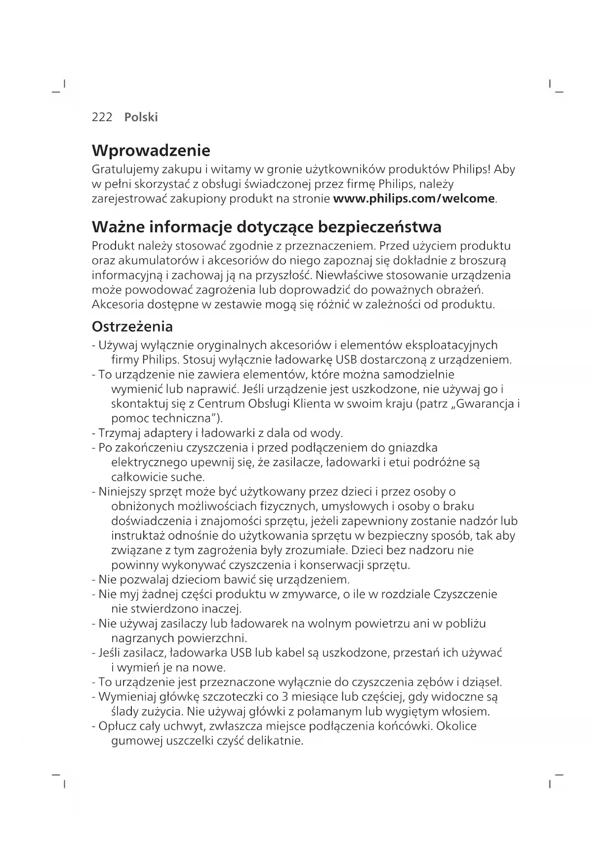 Polski Wprowadzenie Gratulujemy zakupu i witamy w gronie użytkowników produktów Philips! Aby w pełni skorzystać z obsługi świadczonej przez firmę Philips, należy zarejestrować zakupiony produkt na stronie www.philips.com/welcome. Ważne informacje dotyczące bezpieczeństwa Produkt należy stosować zgodnie z przeznaczeniem. Przed użyciem produktu oraz akumulatorów i akcesoriów do niego zapoznaj się dokładnie z broszurą informacyjną i zachowaj ją na przyszłość. Niewłaściwe stosowanie urządzenia może powodować zagrożenia lub doprowadzić do poważnych obrażeń. Akcesoria dostępne w zestawie mogą się różnić w zależności od produktu. Ostrzeżenia - Używaj wyłącznie oryginalnych akcesoriów i elementów eksploatacyjnych firmy Philips. Stosuj wyłącznie ładowarkę USB dostarczoną z urządzeniem. - To urządzenie nie zawiera elementów, które można samodzielnie wymienić lub naprawić. Jeśli urządzenie jest uszkodzone, nie używaj go i skontaktuj się z Centrum Obsługi Klienta w swoim kraju (patrz „Gwarancja i pomoc techniczna”). - Trzymaj adaptery iładowarki zdala od wody. - Po zakończeniu czyszczenia iprzed podłączeniem do gniazdka elektrycznego upewnij się, że zasilacze, ładowarki ietui podróżne są całkowicie suche. - Niniejszy sprzęt może być użytkowany przez dzieci i przez osoby o obniżonych możliwościach fizycznych, umysłowych i osoby o braku doświadczenia i znajomości sprzętu, jeżeli zapewniony zostanie nadzór lub instruktaż odnośnie do użytkowania sprzętu w bezpieczny sposób, tak aby związane z tym zagrożenia były zrozumiałe. Dzieci bez nadzoru nie powinny wykonywać czyszczenia i konserwacji sprzętu. - Nie pozwalaj dzieciom bawić się urządzeniem. - Nie myj żadnej części produktu wzmywarce, oile wrozdziale Czyszczenie nie stwierdzono inaczej. - Nie używaj zasilaczy lub ładowarek na wolnym powietrzu ani wpobliżu nagrzanych powierzchni. - Jeśli zasilacz, ładowarka USB lub kabel są uszkodzone, przestań ich używać iwymień je na nowe. - To urządzenie jest przeznaczone wyłącznie do czyszczenia zębów i dziąseł. - Wymieniaj główkę szczoteczki co 3 miesiące lub częściej, gdy widoczne są ślady zużycia. Nie używaj główki z połamanym lub wygiętym włosiem. - Opłucz cały uchwyt, zwłaszcza miejsce podłączenia końcówki. Okolice gumowej uszczelki czyść delikatnie.223 Polski - Przed wlozeniem glówki szczotkujacej i szczoteczki do zebów do etui podróznego upewnij sie, ze sa suche. - Unikać kontaktu z produktami zawierającymi olejki eteryczne lub olej kokosowy. Kontakt może spowodować wypadnięcie włosia. - Maksymalna wysokość użytkowania wynosi 4500 metrów n.p.m. - Informacje dotyczące substancji REACH, zawartych w produktach Philips, można znaleźć na stronie www.philips.com/REACH Ostrzeżenia medyczne - Należy zaprzestać korzystania zurządzenia iskonsultować się zdentystą/lekarzem, jeśli po użyciu wystąpi nadmierne lub długotrwałe krwawienie, lub jeśli wtrakcie użytkowania występuje dyskomfort lub ból. - Jeśli masz wszczepiony rozrusznik serca lub inne urządzenie, przed użyciem skontaktuj się z lekarzem lub producentem tego urządzenia. - To urządzenie jest urządzeniem do higieny osobistej inie jest przeznaczone do współużytkowania przez wielu użytkowników. Instrukcje dotyczące bezpieczeństwa podczas korzystania z akumulatorów - To urządzenie zawiera akumulatory, które może wyjmować jedynie odpowiednio przeszkolona osoba. - Produkt i akumulatory należy chronić przed ogniem i nie wystawiać ich na bezpośrednie działanie promieni słonecznych lub wysokich temperatur. - Jeśli urządzenie nadmiernie się nagrzewa, wydziela nieprzyjemny zapach, zmienia kolor lub jeśli ładowanie trwa znacznie dłużej niż zwykle, zaprzestań korzystania z urządzenia i ładowania go oraz skontaktuj się z firmą Philips. - Nie umieszczaj urządzeń i ich akumulatorów w kuchenkach mikrofalowych lub na kuchenkach indukcyjnych. - Nie wolno otwierać, modyfikować, przekłuwać, uszkadzać ani rozmontowywać produktu lub akumulatorów, aby nie dopuścić do przegrzania albo uwolnienia toksycznych lub niebezpiecznych substancji. Nie wolno doprowadzać do zwarcia, przeładowywać ani ładować akumulatorów w odwrotnym ustawieniu. - To urządzenie zawiera niewymienny akumulator. Gdy skończy się czas eksploatacji akumulatora, urządzenie należy w odpowiedni sposób zutylizować, zob. punkt dotyczący recyklingu. - Do ładowania używaj tylko zasilaczy Philips WAA1001 lub WAA2001 firmy Philips zcertyfikatem bezpieczeństwa IPX4 oodpowiednich parametrach wejściowych (100–240V~; 50/60Hz; 3,5W) iwyjściowych (5VDC; 2,5W). Lista zasilaczy znajduje się na stronie www.philips.com/support. - Ładuj produkt i używaj go w zakresie temperatur od 0 °C do 40 °C.224 Polski Warunki przechowywania i transportu Temperatura: od -20 °C do +60 °C. Pola elektromagnetyczne (EMF) To urządzenie firmy Philips spełnia wszystkie normy i jest zgodne z wszystkimi przepisami dotyczącymi narażenia na działanie pól elektromagnetycznych.