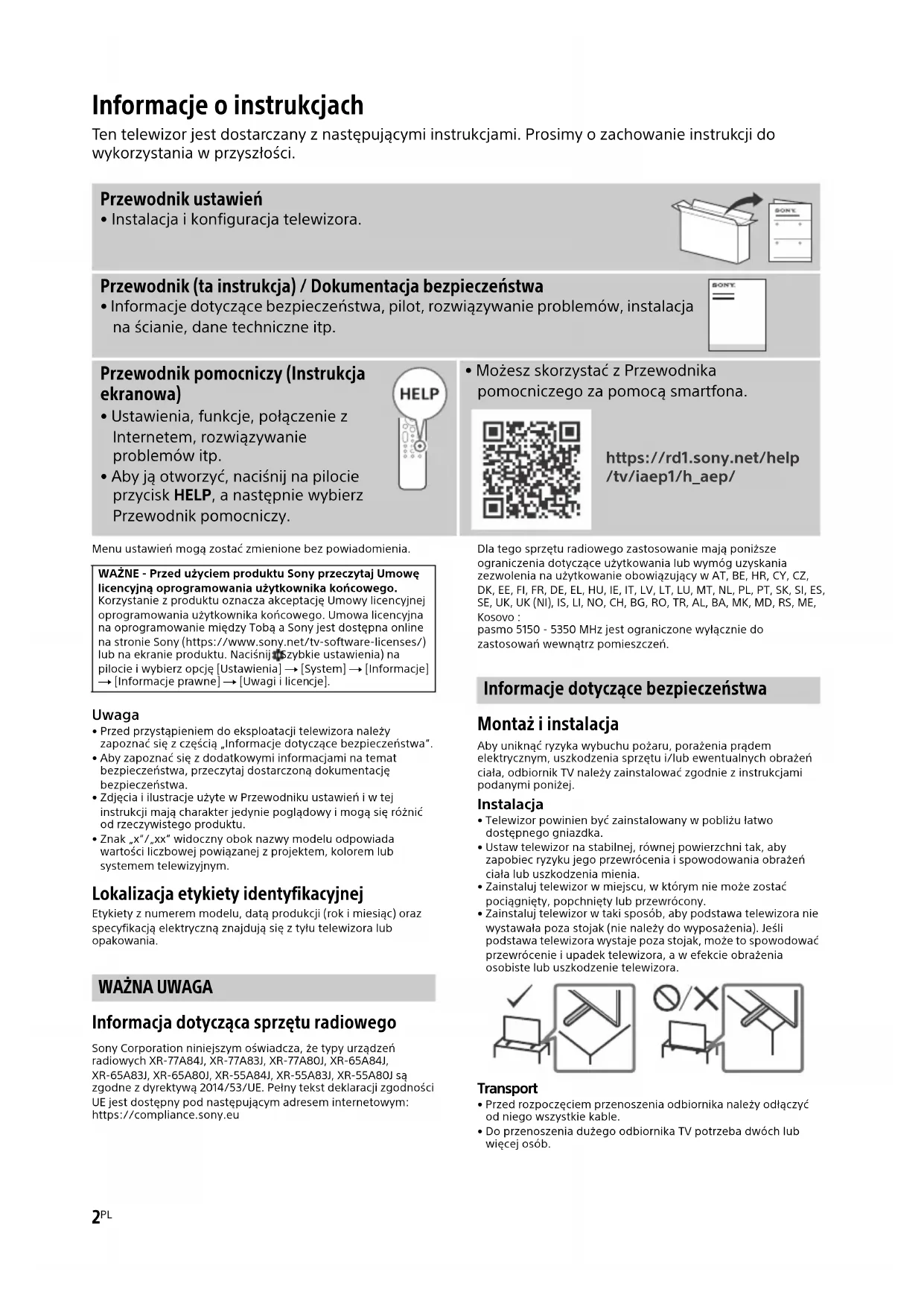 Informacja dotycząca sprzętu radiowego Sony Corporation niniejszym oświadcza, że typy urządzeń radiowych XR-77A84J, XR-77A83J, XR-77A80J, XR-65A84J, XR-65A83J, XR-65A80J, XR-55A84J, XR-55A83J, XR-55A80J są zgodne z dyrektywą 2014/53/UE. Pełny tekst deklaracji zgodności UE jest dostępny pod następującym adresem internetowym: https://compliance.sony.euDla tego sprzętu radiowego zastosowanie mają poniższe ograniczenia dotyczące użytkowania lub wymóg uzyskania zezwolenia na użytkowanie obowiązujący w AT, BE, HR, CY, CZ, DK, EE, FI, FR, DE, EL, HU, IE, IT, LV, LT, LU, MT, NL, PL, PT, SK, SI, ES, SE, UK, UK (NI), IS, LI, NO, CH, BG, RO, TR, AL, BA, MK, MD, RS, ME, Kosovo :pasmo 5150 - 5350 MHz jest ograniczone wyłącznie do zastosowań wewnątrz pomieszczeń. Informacje dotyczące bezpieczeństwa Montaż i instalacja Aby uniknąć ryzyka wybuchu pożaru, porażenia prądem elektrycznym, uszkodzenia sprzętu i/lub ewentualnych obrażeń ciała, odbiornik TV należy zainstalować zgodnie z instrukcjami podanymi poniżej. Instalacja