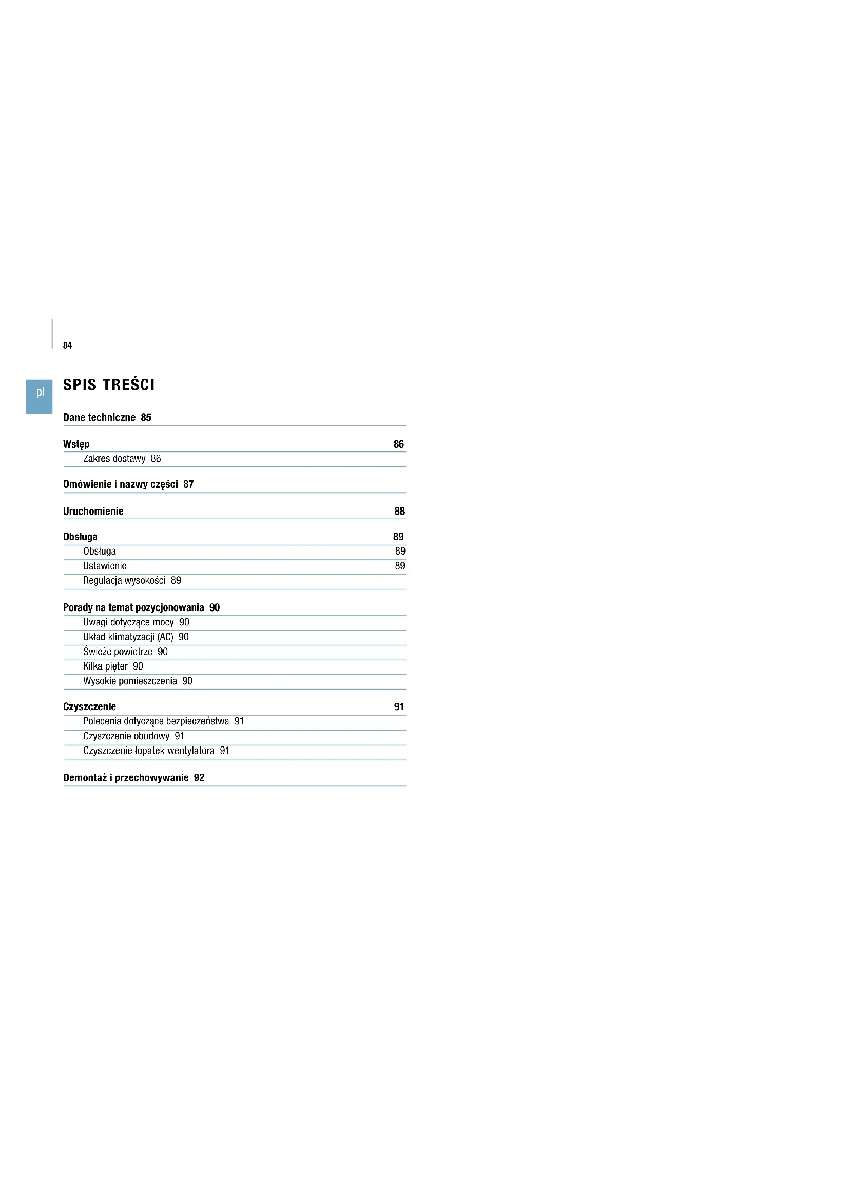 Dane techniczne 85 Wstęp 86 Zakres dostawy 86 Omówienie i nazwy części 87 Uruchomienie 88 Obsługa 89 Obsługa 89 Ustawienie 89 Regulacja wysokości 89 Porady na temat pozycjonowania 90 Uwagi dotyczące mocy 90 Układ klimatyzacji (AC) 90 Świeże powietrze 90 Kilka pięter 90 Wysokie pomieszczenia 90 Czyszczenie 91 Polecenia dotyczące bezpieczeństwa 91 Czyszczenie obudowy 91 Czyszczenie łopatek wentylatora 91 Demontaż i przechowywanie 9285