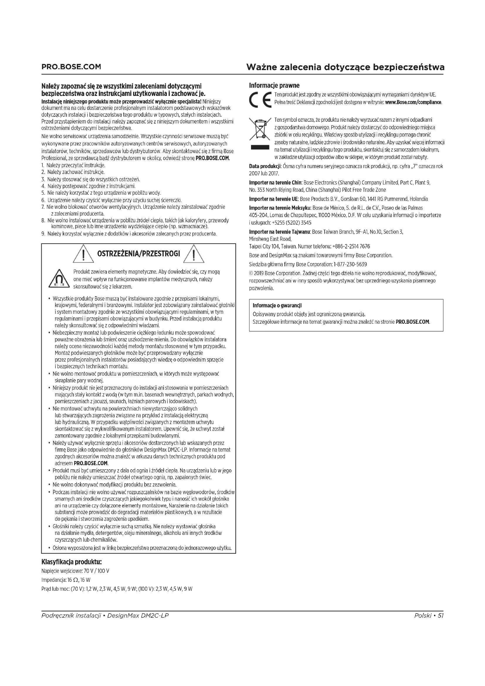 Informacje prawne Ten produkt jest zgodny zewszystkimi obowiązującymi wymaganiami dyrektyw UE. Pełna treść Deklaracji zgodności jest dostępna wwitrynie: www.Bose.com/compliance. Ten symbol oznacza, że produktu nie należy wyrzucać razem zinnymi odpadkami zgospodarstwa domowego. Produkt należy dostarczyć do odpowiedniego miejsca zbiórki wcelu recyklingu. Właściwy sposób utylizacji irecyklingu pomaga chronić zasoby naturalne, ludzkie zdrowie iśrodowisko naturalne. Aby uzyskać więcej informacji na temat utylizacji irecyklingu tego produktu, skontaktuj się zsamorządem lokalnym, wzakładzie utylizacji odpadów albo wsklepie, wktórym produkt został nabyty. Data produkcji: Ósma cyfra numeru seryjnego oznacza rok produkcji, np. cyfra „7” oznacza rok 2007 lub 2017. Importer na terenie Chin: Bose Electronics (Shanghai) Company Limited, Part C, Plant 9, No.353 North Riying Road, China (Shanghai) Pilot Free Trade Zone Importer na terenie UE: Bose Products B.V., Gorslaan 60, 1441 RG Purmerend, Holandia Importer na terenie Meksyku: Bose de México, S. de R.L. de C.V., Paseo de las Palmas 405-204, Lomas de Chapultepec, 11000 México, D.F. W celu uzyskania informacji oimporterze iusługach: +5255 (5202) 3545 Importer na terenie Tajwanu: Bose Taiwan Branch, 9F-A1, No.10, Section 3, MinshengEastRoad, Taipei City 104, Taiwan. Numer telefonu: +886-2-2514 7676 Bose and DesignMax są znakami towarowymi firmy Bose Corporation. Siedziba główna firmy Bose Corporation: 1-877-230-5639 © 2019 Bose Corporation. Żadnej części tego dzieła nie wolno reprodukować, modyfikować, rozpowszechniać ani winny sposób wykorzystywać bez uprzedniego uzyskania pisemnego pozwolenia. Informacje ogwarancji Opisywany produkt objęty jest ograniczoną gwarancją. Szczegółowe informacje na temat gwarancji można znaleźć na stronie PRO.BOSE.COM. Klasyfikacja produktu: Napięcie wejściowe: 70V / 100V Impedancja: 16 Ω, 16W Prąd lub moc: (70V): 1,2W, 2,3W, 4,5W, 9W; (100V): 2,3W, 4,5W, 9W