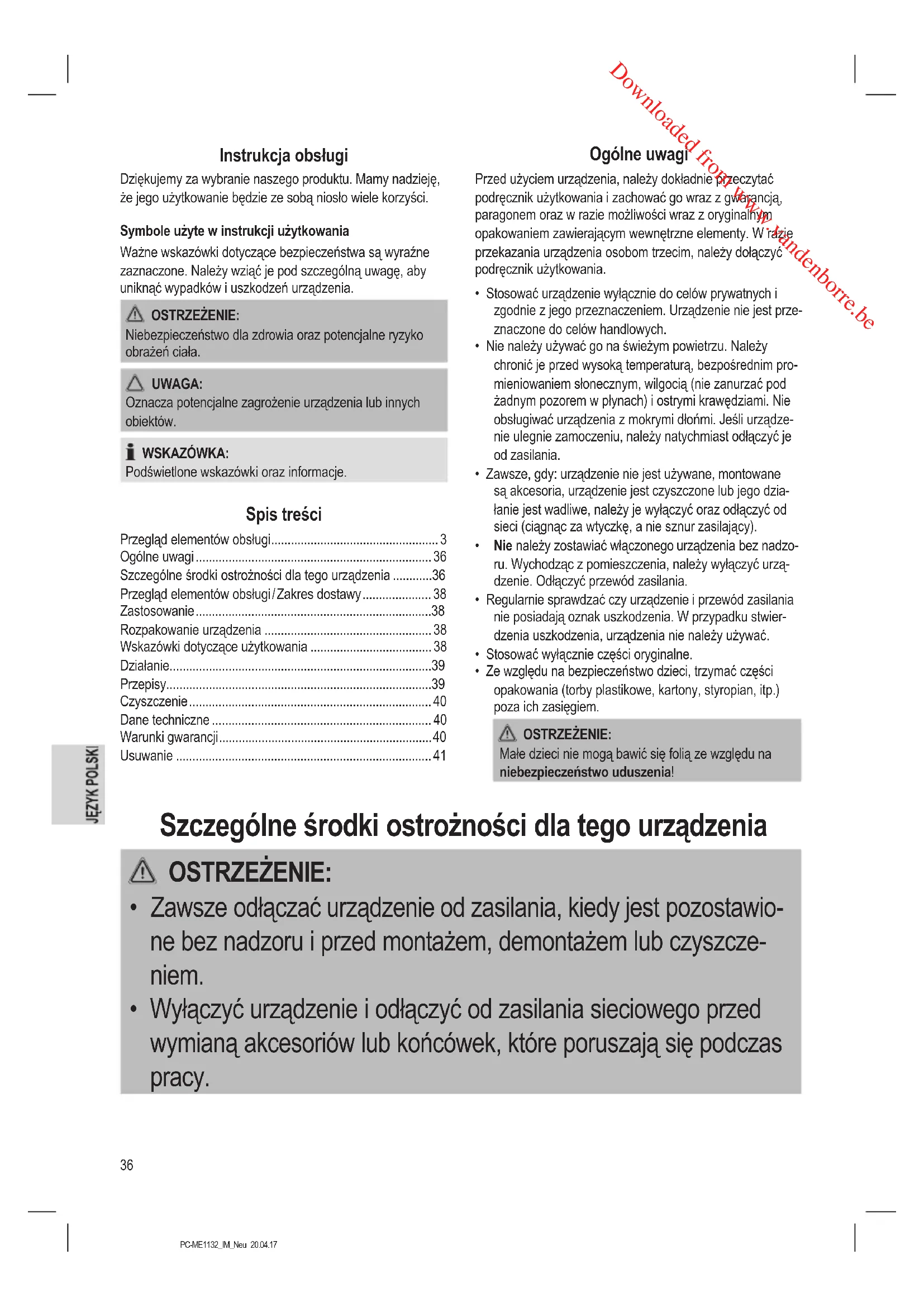 - Wyłączyć urządzenie i odłączyć od zasilania sieciowego przed wymianą akcesoriów lub końcówek, które poruszają się podczas pracy. Downloaded from www.vandenborre.be37 PC-ME1132_IM_Neu 20.04.17 OSTRZEŻENIE: