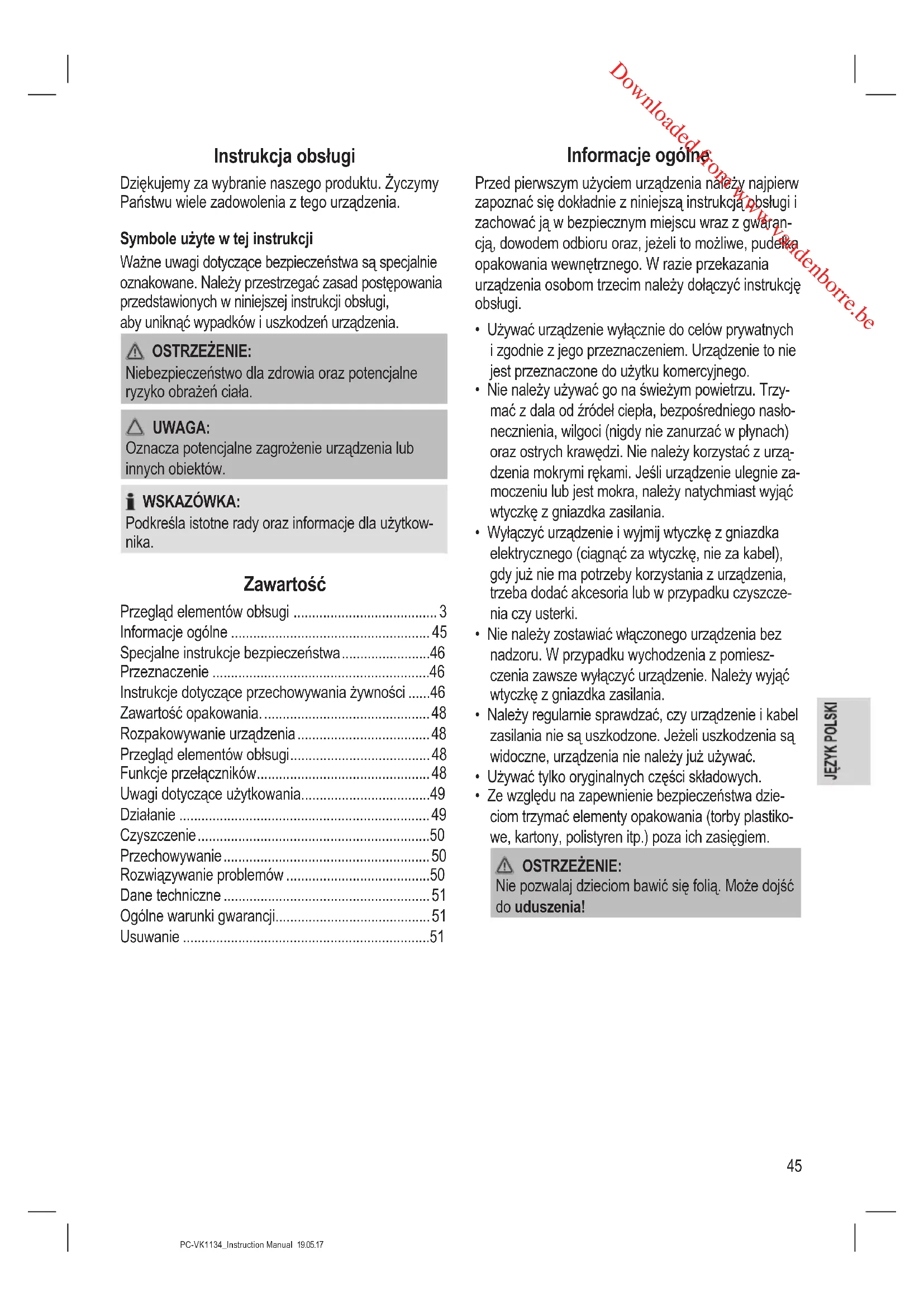- Always store the device in a well-ventilated and dry place, out of reach of children. Downloaded from www.vandenborre.be44 PC-VK1134_Instruction Manual 19.05.17 Troubleshooting Malfunction Possible Cause Solution The device is not working. No power is supplied to the device. Check the func- tion of the socket, using a different device. Insert the plug correctly. Check the main fuse. The device is faulty. Contact our service center or a specialist. The bag is not tight. There are faults in the seam. Straighten out the foil before- hand. Goods are clamped in the seam. Check the seams. The seam was damp. Keep the seam free and dry. The bag is dam- aged at the seam or elsewhere. If the bag is damaged, please replace it. The bag is not completely emptied. There was too much air in the bag which could not be sucked out in time. Squeeze out ex- cessive air from the bag before- hand. Choose the TURBO function. You have used foil without a structure. Use foil with a rib, honeycomb or di- amond structure for vacuuming. The bag is dam- aged. Use a new bag. Technical Data Model:........................................................ PC-VK 1134 Power supply:.......................... 220 - 240 V ~ 50/60 Hz Power consumption: ........................................... 120 W Protection category: .................................................... II Net weight: .......................................................... 2,4 kg The right to make technical and design modications in the course of continuous product development remains reserved. This device has been tested according to all relevant current CE guidelines, such as electromagnetic compatibility and low voltage directives, and has been constructed in accordance with the latest safety regulations. Disposal Meaning of the “Dustbin” Symbol Protect our environment: do not dispose of electrical equipment in the domestic waste. Protect our environment: do not dispose of electrical equipment in the domestic waste. This helps avoid the potential effects of incorrect disposal on the environment and human health. This will contribute to the recycling and other forms of re-utilisation of electrical and electronic equipment. Information concerning where the equipment can be dis-posed of can be obtained from your local authority. Downloaded from www.vandenborre.be45 PC-VK1134_Instruction Manual 19.05.17 Instrukcja obsługi Dziękujemy za wybranie naszego produktu. Życzymy Państwu wiele zadowolenia z tego urządzenia. Symbole użyte w tej instrukcji Ważne uwagi dotyczące bezpieczeństwa są specjalnie oznakowane. Należy przestrzegać zasad postępowania przedstawionych w niniejszej instrukcji obsługi, aby uniknąć wypadków i uszkodzeń urządzenia. OSTRZEŻENIE: Niebezpieczeństwo dla zdrowia oraz potencjalne ryzyko obrażeń ciała. UWAGA: Oznacza potencjalne zagrożenie urządzenia lub innych obiektów. WSKAZÓWKA: Podkreśla istotne rady oraz informacje dla użytkow- nika. Zawartość Przegląd elementów obłsugi .......................................3 Informacje ogólne ......................................................45 Specjalne instrukcje bezpieczeństwa ........................46 Przeznaczenie ...........................................................46 Instrukcje dotyczące przechowywania żywności ......46 Zawartość opakowania. ............................................. 48 Rozpakowywanie urządzenia .................................... 48 Przegląd elementów obłsugi ......................................48 Funkcje przełączników ...............................................48 Uwagi dotyczące użytkowania. ..................................49 Działanie ....................................................................49 Czyszczenie ...............................................................50 Przechowywanie ........................................................50 Rozwiązywanie problemów .......................................50 Dane techniczne ........................................................51 Ogólne warunki gwarancji ..........................................51 Usuwanie ...................................................................51 Informacje ogólne Przed pierwszym użyciem urządzenia należy najpierw zapoznać się dokładnie z niniejszą instrukcją obsługi i zachować ją w bezpiecznym miejscu wraz z gwaran- cją, dowodem odbioru oraz, jeżeli to możliwe, pudełka opakowania wewnętrznego. W razie przekazania urządzenia osobom trzecim należy dołączyć instrukcję obsługi.