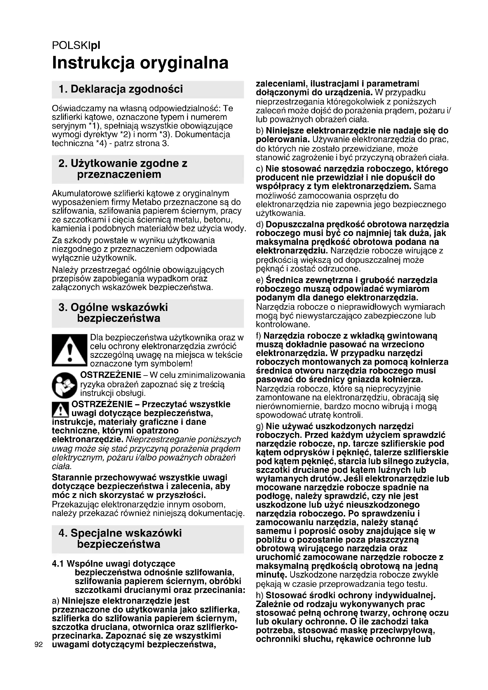 Instrukcja oryginalna Oświadczamy na własną odpowiedzialność: Te szlifierki kątowe, oznaczone typem i numerem seryjnym *1), spełniają wszystkie obowiązujące wymogi dyrektyw *2) i norm *3). Dokumentacja techniczna *4) - patrz strona 3. Akumulatorowe szlifierki kątowe z oryginalnym wyposażeniem firmy Metabo przeznaczone są do szlifowania, szlifowania papierem ściernym, pracy ze szczotkami i cięcia ściernicą metalu, betonu, kamienia i podobnych materiałów bez użycia wody. Za szkody powstałe w wyniku użytkowania niezgodnego z przeznaczeniem odpowiada wyłącznie użytkownik. Należy przestrzegać ogólnie obowiązujących przepisów zapobiegania wypadkom oraz załączonych wskazówek bezpieczeństwa. Dla bezpieczeństwa użytkownika oraz w celu ochrony elektronarzędzia zwrócić szczególną uwagę na miejsca w tekście oznaczone tym symbolem! OSTRZEŻENIE – W celu zminimalizowania ryzyka obrażeń zapoznać się z treś cią instrukcji obsługi. OSTRZEŻENIE – Przeczytać wszystkie uwagi dotyczące bezpieczeństwa, instrukcje, materiały graficzne i dane techniczne, którymi opatrzono elektronarzędzie. Nieprzestrzeganie poniższych uwag może się stać przyczyną porażenia prądem elektrycznym, pożaru i/albo poważnych obrażeń ciała. Starannie przechowywać wszystkie uwagi dotyczące bezpieczeństwa i zalecenia, aby móc z nich skorzystać w przyszłości. Przekazując elektronarzędzie innym osobom, należy przekazać również niniejszą dokumentację.