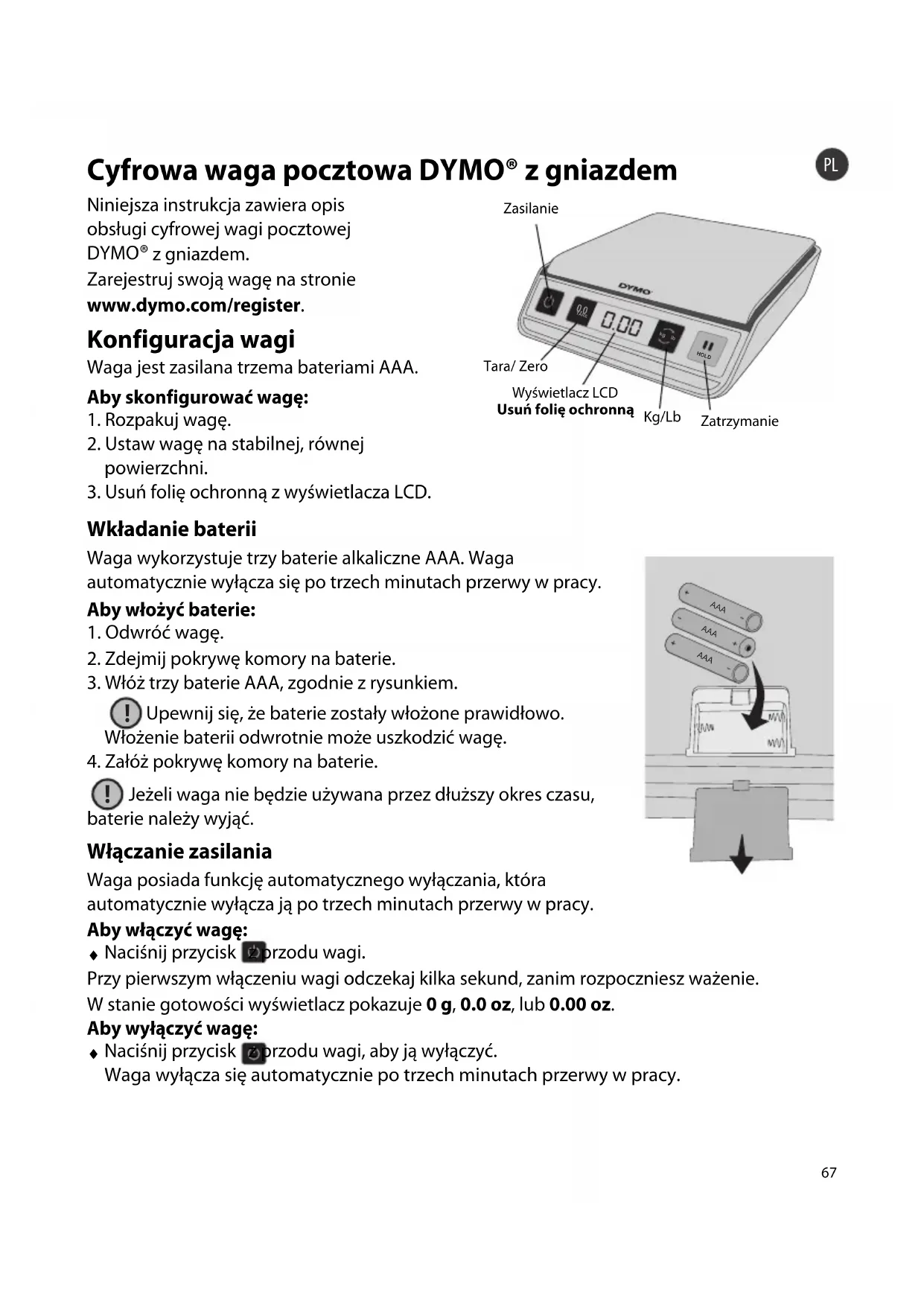 Cyfrowa waga pocztowa DYMO® z gniazdem Niniejsza instrukcja zawiera opis obsługi cyfrowej wagi pocztowej DYMO ® z gniazdem. Zarejestruj swoją wagę na stronie www.dymo.com/register. Konfiguracja wagi Waga jest zasilana trzema bateriami AAA. Aby skonfigurować wagę: