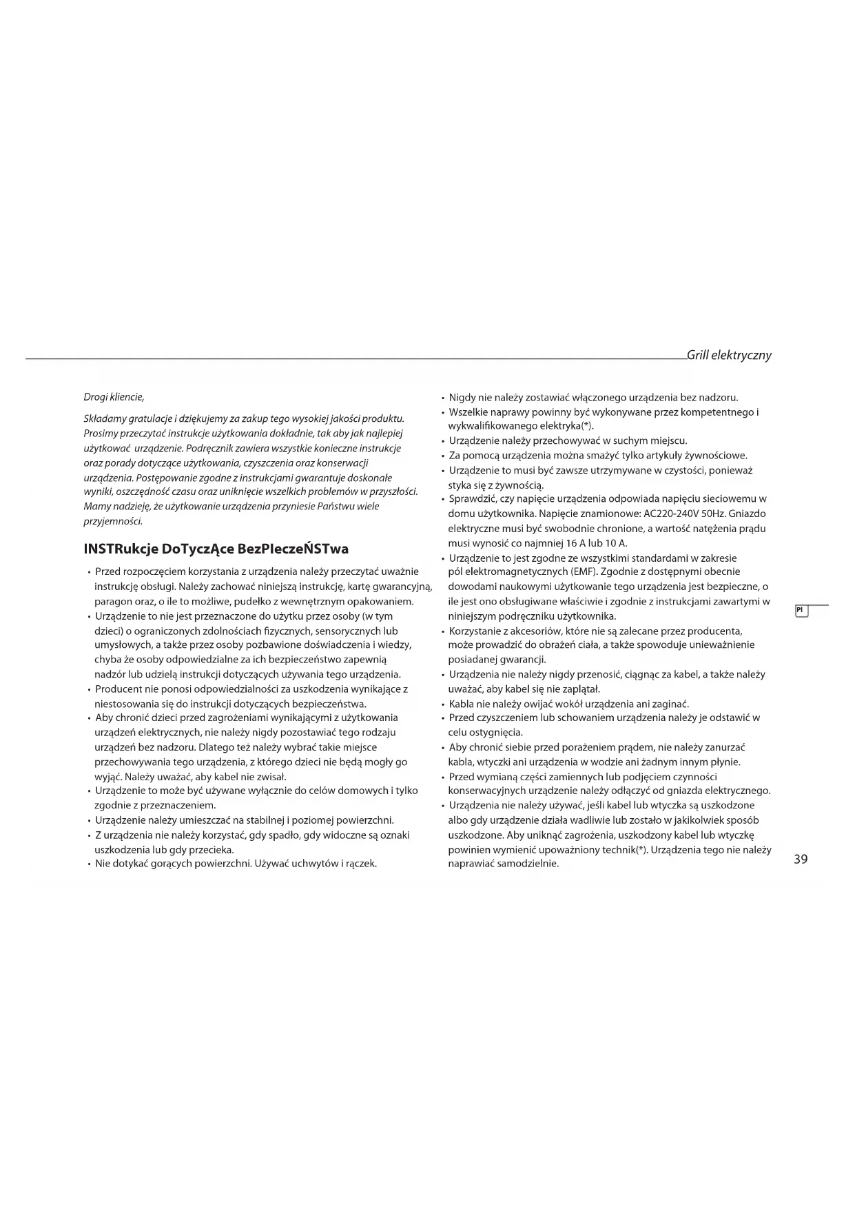 - W żadnym wypadku grilla nie należy rozpalać przy użyciu węgla drzewnego ani żadnego innego opału stałego lub płynnego. (*) Kompetentny i wykwalikowany elektryk: dział posprzedażny producenta, importer lub inna osoba, która jest wykwalikowana, zatwierdzona i kompetentna do wykonywania tego rodzaju napraw; korzystanie z usług tych osób ma na celu uniknięcie wszelkich zagrożeń. W każdym wymagającym tego przypadku urządzenie należy przekazać jednemu z wymienionych powyżej elektryków.