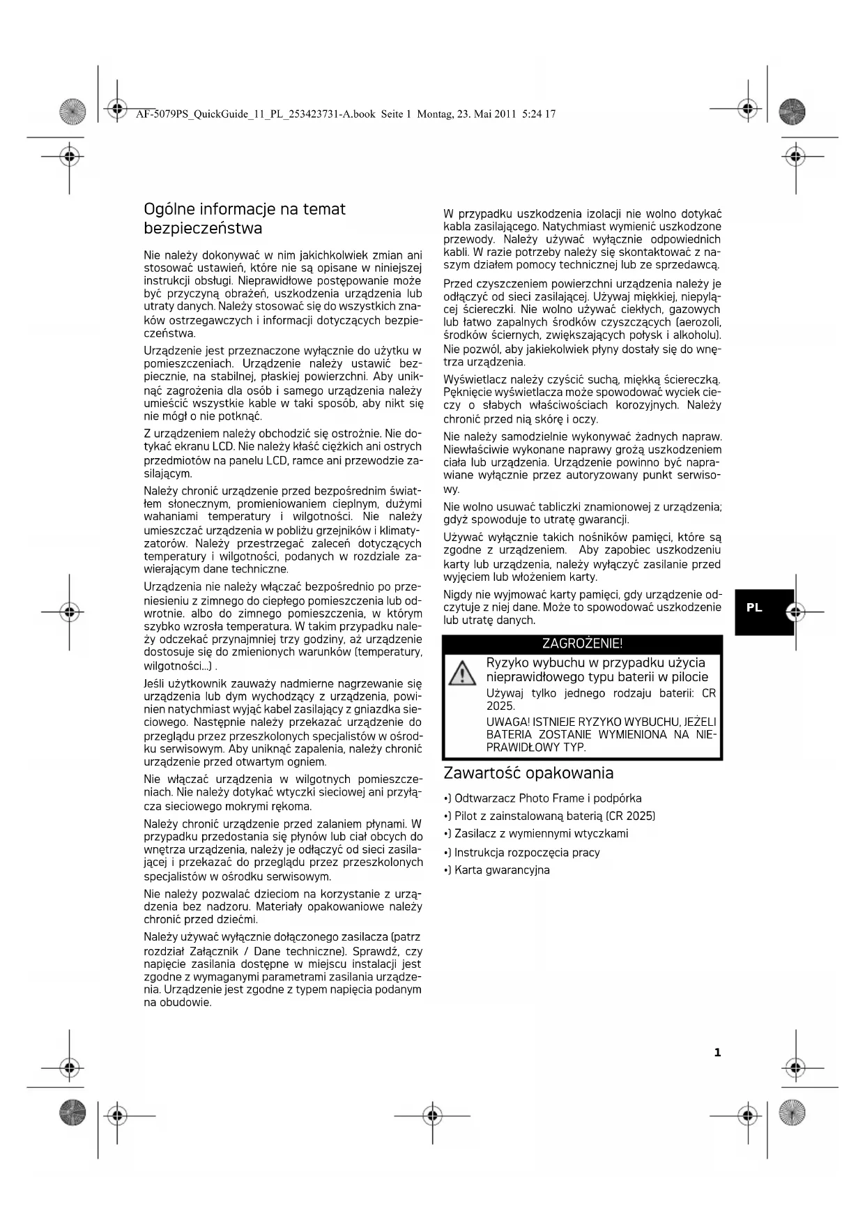 - ) Karta gwarancyjna ZAGROŻENIE! Ryzyko wybuchu w przypadku użycia nieprawidłowego typu baterii w pilocie Używaj tylko jednego rodzaju baterii: CR