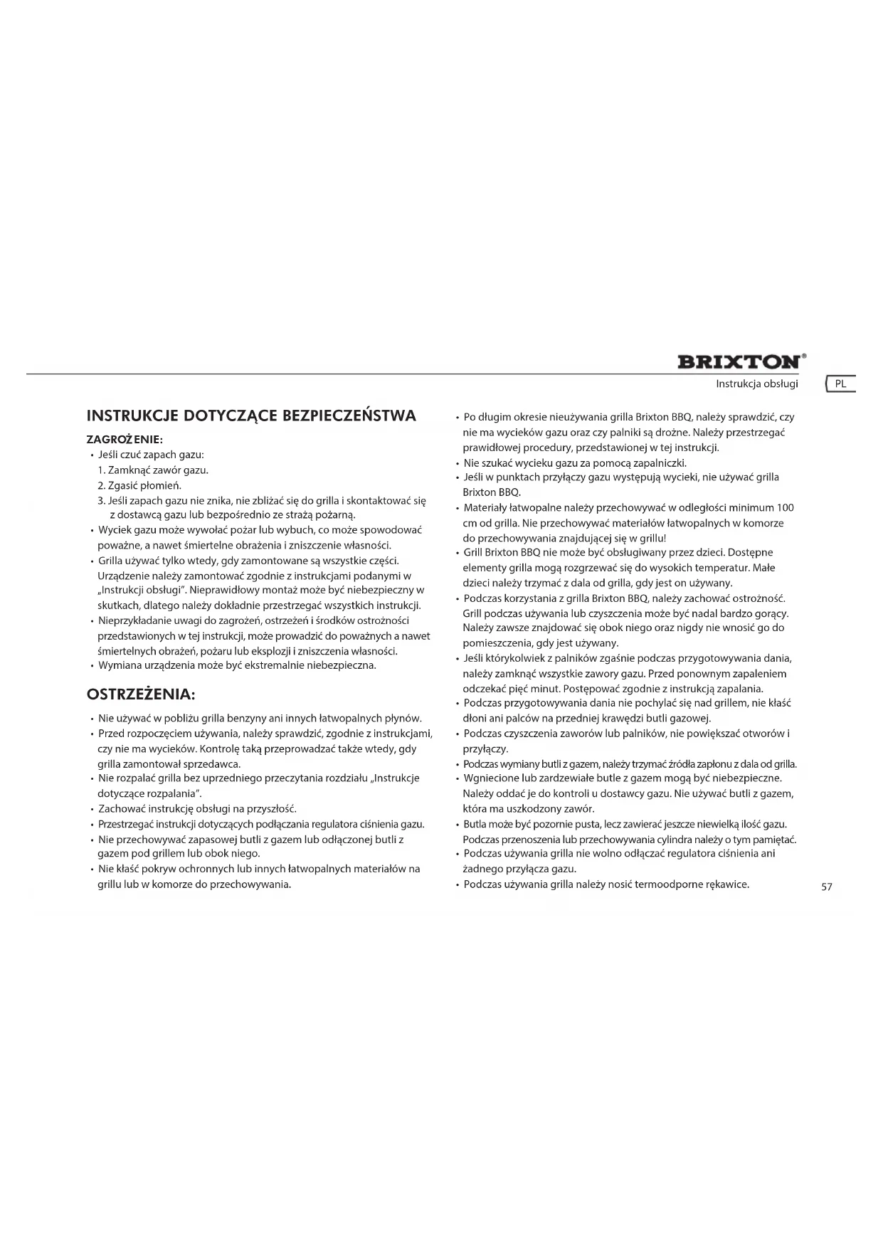 - Po długim okresie nieużywania grilla Brixton BBQ, należy sprawdzić, czy nie ma wycieków gazu oraz czy palniki są drożne. Należy przestrzegać prawidłowej procedury, przedstawionej w tej instrukcji.