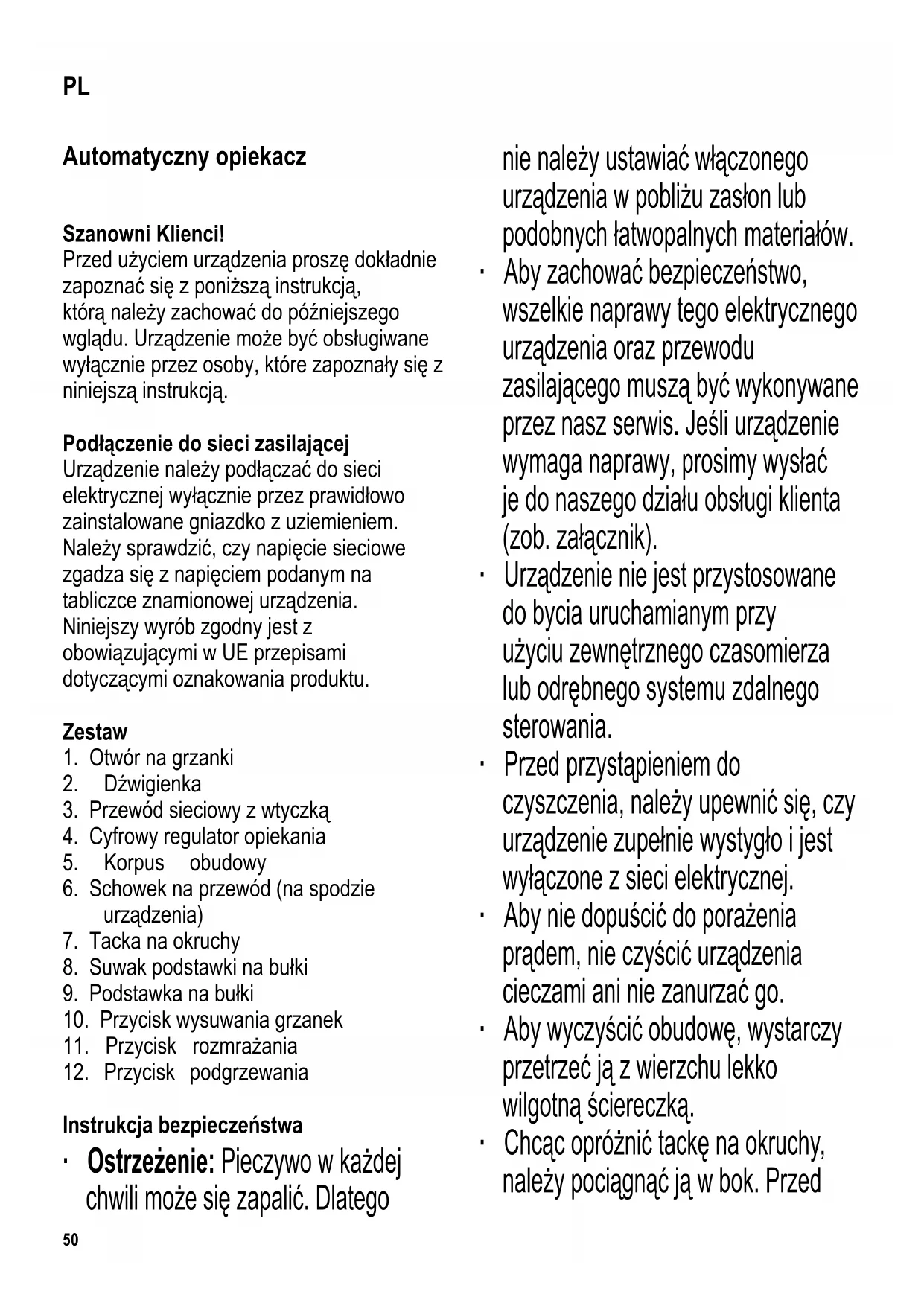 Instrukcja bezpieczeństwa ∙ Ostrzeżenie: Pieczywo w każdej chwili może się zapalić. Dlatego nie należy ustawiać włączonego urządzenia w pobliżu zasłon lub podobnych łatwopalnych materiałów. ∙ Aby zachować bezpieczeństwo, wszelkie naprawy tego elektrycznego urządzenia oraz przewodu zasilającego muszą być wykonywane przez nasz serwis. Jeśli urządzenie wymaga naprawy, prosimy wysłać je do naszego działu obsługi klienta (zob. załącznik). ∙ Urządzenie nie jest przystosowane do bycia uruchamianym przy użyciu zewnętrznego czasomierza lub odrębnego systemu zdalnego sterowania. ∙ Przed przystąpieniem do czyszczenia, należy upewnić się, czy urządzenie zupełnie wystygł o i jest wyłączone z sieci elektrycznej. ∙ Aby nie dopuścić do porażenia prądem, nie czyścić urządzenia cieczami ani nie zanurzać go. ∙ Aby wyczyścić obudowę, wystarczy przetrzeć ją z wierzchu lekko wilgotną ściereczką. ∙ Chcąc opróżnić tackę na okruchy, należy pociągnąć ją w bok. Przed PL51 ponownym włączeniem opiekacza należy wsunąć tackę z powrotem na swoje miejsce. ∙ Urządzenie przeznaczone jest do zastosowań domowych lub podobnych, jak np. w - kuchniach biurowych lub innych miejscach pracy; - agroturystyce; - hotelach, motelach itp. oraz innych podobnych lokalach (przez klientów); - pensjonatach. ∙ Osoby o ograniczonych zdolnościach fi zycznych, czuciowych lub psychicznych albo nieposiadające stosownego doświadczenia lub wiedzy, a także dzieci (w wieku co najmniej 8 lat), mogą korzystać z urządzenia, pod warunkiem że znajdują się pod nadzorem lub zostały poinstruowane, jak używać urządzenia i są w pełni świadome wszelkich zagrożeń i wymaganych środków ostrożności. ∙ Nie dopuszczać do używania urzą dzenia jako zabawki przez dzieci. ∙ Nie wolno pozwalać dzieciom na wykonywanie jakichkolwiek prac związanych bezpośrednio z konserwacją lub czyszczeniem urządzenia, a jeżeli już, to dziecko musi mieć co najmniej 8 lat i być nadzorowane przez osobę dorosłą. ∙ Nie dopuszczać do urządzenia i jego przewodu zasilającego dzieci poniżej 8 lat. ∙ Ostrzeżenie: Nie pozwalać, aby dzieci miały dostęp do elementów opakowania, ponieważ mogą one spowodować zagrożenie, np. uduszenia. ∙ Opiekacz należy stawiać na równej i odpornej na wysoką temperaturę powierzchni. ∙ Aby zapobiec uszkodzeniom obudowy, nie ustawiać urządzenia w pobliżu ognia (np. z palnika gazowego) czy gorących powierzchni (np. kuchenki). ∙ Ostrzeżenie: Niektóre części obudowy nagrzewają się do wysokiej temperatury. Dotykanie gorących elementów grozi oparzeniem. ∙ Przed użyciem należy dokładnie sprawdzić, czy główny korpus urządzenia i wszystkie elementy czynnościowe są sprawne i nie noszą śladów uszkodzenia. Jeżeli urządzenie np. spadło na twardą powierzchnię albo przewód zasilający został narażony na zbyt silne szarpnięcie, nie nadaje się ono do dalszego użytku: nawet najmniejsza, niewidoczna usterka powstała z tego powodu, może mieć ujemny wpływ na działanie urządzenia i bezpieczeństwo użytkownika.52 ∙ Należy uważać, aby przewód zasilający nie stykał się z gorącymi elementami. ∙ Nie należy pozostawiać przewodu zasilającego swobodnie zwisającego bez nadzoru. ∙ Nie zostawiać włączonego urządzenia bez nadzoru. ∙ Nie zakrywać otworu na grzanki. ∙ Nie wyjmować opiekanego pieczywa ręką, ani nie wkładać do otworu na grzanki żadnych przedmiotów, jak np. widelec czy nóż. Elementy grzewcze są pod napięciem. ∙ Wtyczkę należy wyjąć z gniazda elektrycznego: - po zakończeniu pracy; - w przypadku stwierdzenia usterki urządzenia; - i przed przystąpieniem do czyszczenia. ∙ Wyjmuj ąc wtyczkę z gniazdka nigdy nie należy szarpać za przewód. ∙ Za szkody wynikłe z nieprawidłowego używania sprzętu lub użytkowania niezgodnego z instrukcją obsługi odpowiedzialność ponosi wyłącznie użytkownik. Instrukcja obsługi Informacje ogólne ∙ Ostrzeżenie: Dźwigienkę można spuścić tylko wtedy, kiedy urządzenie jest podłączone do zasilania. ∙ Nie należy wkładać do opiekacza za dużych i za grubych kromek. Grozi to zaklinowaniem się pieczywa. Grubość kromki nie powinna przekraczać 14 mm. ∙ W przypadku stwierdzenia usterki oraz przed przystąpieniem do czyszczenia urządzenia należy zawsze je wyłączyć z sieci. ∙ Jeż eli w otworze zaklinuje się pieczywo, do wyjęcia go należy użyć tępego drewnianego przedmiotu (np. uchwytu szczoteczki). Nie należy dotykać metalowych części grzejnych urządzenia w trakcie pracy. Przed użyciem urządzenia po raz pierwszy ∙ Wyczyścić dokładnie opiekacz (zob. punkt Konserwacja i czyszczenie). ∙ W łączyć opiekacz na co najmniej pięć cykli opiekania, przy maksymalnym ustawieniu poziomu opiekania, bez wkładania pieczywa. ∙ Po każdym cyklu rozgrzania „na pusto” odczekać, aż urządzenie ostygnie i następnie ponownie je włączyć. ∙ Po pierwszym włączeniu opiekacza może wydzielać się z niego specyfi czny zapach (oraz niewielka ilość dymu). Jest to zjawisko normalne, które po chwili ustanie. Z tego względu należy zapewnić w pomieszczeniu odpowiednią wentylacj ę, otwierając okna lub drzwi balkonowe. Automatyczny wyłącznik Urządzenie wyposażone jest w automatyczny wyłącznik. W przypadku zaklinowania się pieczywa i uniemożliwienia podniesienia się dźwigni, po zakończeniu opiekania toster wyłączy się automatycznie. W takim przypadku odłączyć urządzenie od zasilania i wyjąć zablokowane pieczywo, postępując zgodnie z instrukcją zamieszczoną w punkcie Informacje ogólne.53 Ustawianie poziomu opiekania Żądany poziom opiekania można ustawić za pomocą cyfrowego regulatora po wciśnięciu w dół dźwigienki. Lekkie przypieczenie: poziom 1-3 Mocne przypieczenie: poziom 5-7 W przypadku krojonego pieczywa, przeznaczonego do toster