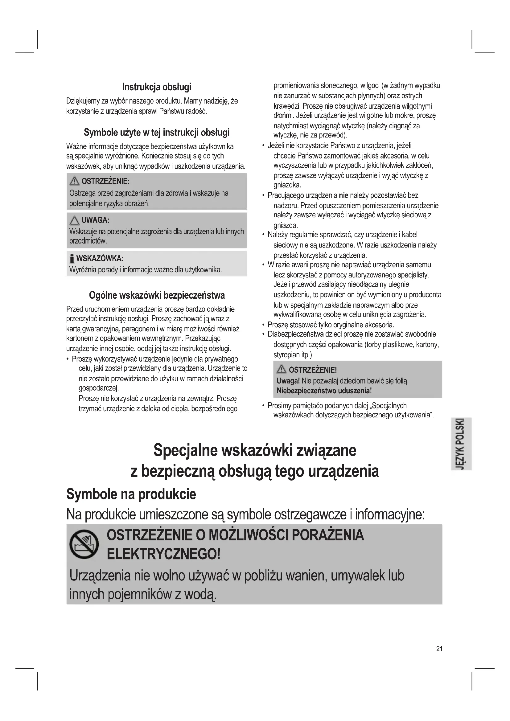 - Proszę wykorzystywać urządzenie jedynie dla prywatnego celu, jaki został przewidziany dla urządzenia. Urządzenie to nie zostało przewidziane do użytku w ramach działalności gospodarczej. Proszę nie korzystać z urządzenia na zewnątrz. Proszę trzymać urządzenie z daleka od ciepła, bezpośredniego Specjalne wskazówki związane z bezpieczną obsługą tego urządzenia Symbole na produkcie Na produkcie umieszczone są symbole ostrzegawcze i informacyjne: OSTRZEŻENIE O MOŻLIWOŚCI PORAŻENIA ELEKTRYCZNEGO! Urządzenia nie wolno używać w pobliżu wanien, umywalek lub innych pojemników z wodą.22 OSTRZEŻENIE: