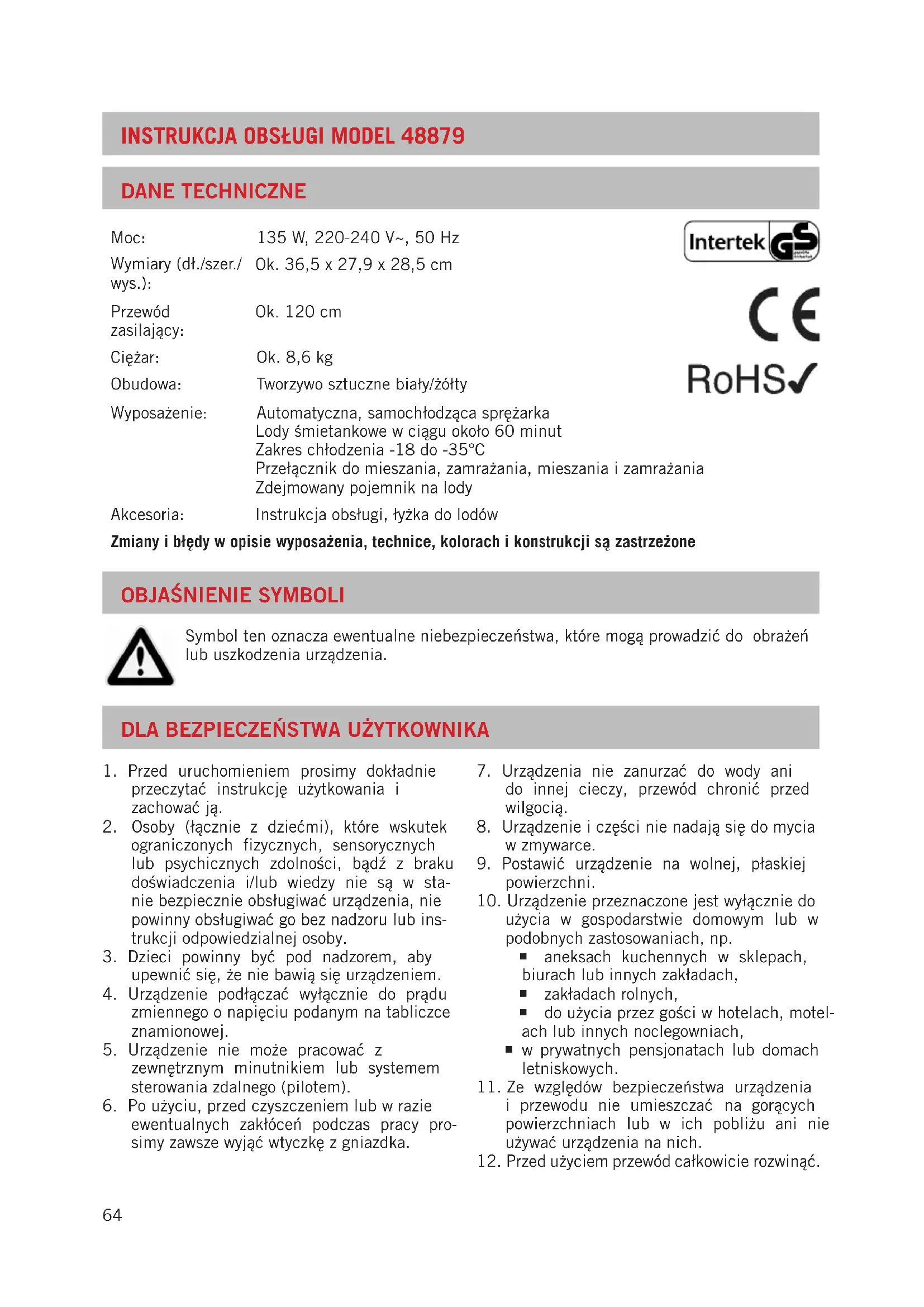 i pozostawić na ½ godziny. Zagotować cukier z pozostałym białym winem. Wino z bazylią przelać przez sito o drobnych oczkach, przygotować sorbet z ochłodzonym syropem cukrowym, szampanem, sokiem z cytryny i białkiem w maszynie do lodów i serwować jako przystawkę lub danie pośrednie. Porada: bez bazylii i z dodatkowym cukrem serwować jako odświeżający deser. sorbEt70 warunki gwarancJi Udzielamy na nasze produkty 24 miesięcznej gwarancji od daty zakupu (warunkiem jest zachowanie faktury zakupu lub para- gonu) na szkody, które przy użytkowaniu zgodnym z przeznaczeniem wskazują na wadę fabryczną. W czasie trwania gwarancji usuniemy wady materiałowe bądź fabryczne zgodnie z naszym osądem poprzez naprawę lub wymianę. Gwarancja udzielana jest na produkty sprzedawane na terenie Polski, Niemiec i Austrii. W innych krajach proszę zwrócić się do właściwego Importera. Urządzenia, w których wymagane jest usunięcie wady, proszę przesłać razem z kopią faktury zakupu, na której musi być widoczna data zakupu, z załączonym opisem wady, w oryginalnym pudełku, dobrze zapakowane i na własny koszt na adres serwisu.. Gwarancja nie obejmuje szkód wynikających ze zużycia, użytkowania niezgodnie z przeznaczeniem i nieprzestrzegania wskazówek dotyczących konserwacji i pielęgnacji. Roszczenie gwarancji wygasa, jeżeli naprawa bądź otwarcie przedmiotu będą przeprowadzone przez stronę trzecią. Ewentualne roszczenia użytkownika końcowego wobec sprze- dawcy/dealera nie są ograniczone tą gwarancją. utylizacja / ochrona środowiska Nasze urządzenia wyprodukowane zostały na wysokim poziomie do długiego użytkowania. Regularna kons- erwacja i fachowe naprawy poprzez nasz serwis mogą wydłużyć pracę urządzenia. W razie kiedy urządzenie jest uszkodzone i nie nadaje się do naprawy, proszę przestrzegać zaleceń: Ten produkt nie może być zutylizowany razem z normalnymi odpadami domowymi. Muszą Państwo dostarczyć ten produkt do zbiorczego punktu recyklingowego dla urządzeń elektrycznych i elektronicznych. Poprzez oddzielne zbieranie i recykling odpadów pomagają Państwo chronić naturalne zasoby i sprawiają, że ten produkt będzie zutylizowany w sposób bezpieczny dla zdrowia i środowiska naturalnego.71Aus dem Hause