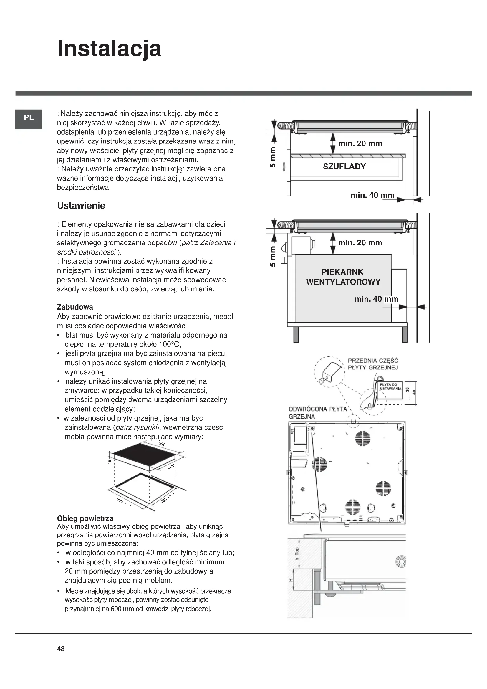 NaleĪy zachowaü niniejszą instrukcjĊ, aby móc z niej skorzystaü w kaĪdej chwili. W razie sprzedaĪy, odstąpienia lub przeniesienia urządzenia, naleĪy siĊ upewniü, czy instrukcja zostaáa przekazana wraz z nim, aby nowy wáaĞciciel páyty grzejnej mógá siĊ zapoznaü z jej dziaáaniem i z wáaĞciwymi ostrzeĪeniami. ! NaleĪy uwaĪnie przeczytaü instrukcjĊ: zawiera ona waĪne informacje dotyczące instalacji, uĪytkowania i bezpieczeĔstwa. Ustawienie ! Elementy opakowania nie sa zabawkami dla dzieci i nalezy je usunac zgodnie z normami dotyczacymi selektywnego gromadzenia odpadów (patrz Zalecenia i srodki ostroznosci ). ! Instalacja powinna zostaü wykonana zgodnie z niniejszymi instrukcjami przez wykwali¿ kowany personel. NiewáaĞciwa instalacja moĪe spowodowaü szkody w stosunku do osób, zwierząt lub mienia. Zabudowa Aby zapewniü prawidáowe dziaáanie urządzenia, mebel musi posiadaü odpowiednie wáaĞciwoĞci:
