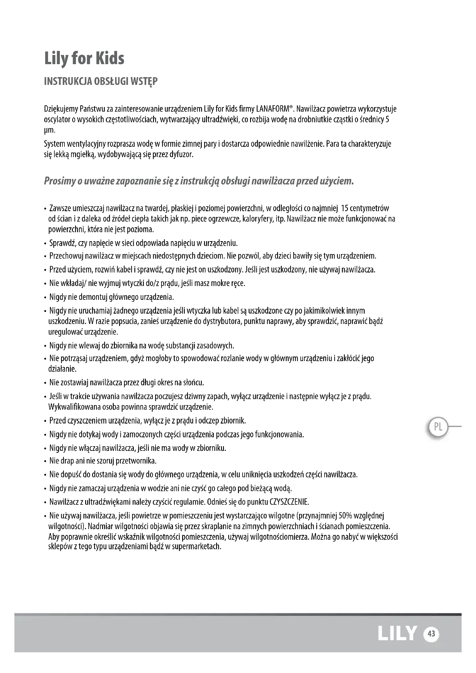 Dziękujemy Państwu za zainteresowanie urządzeniem Lily for Kids firmy LANAFORM®. Nawilżacz powietrza wykorzystuje oscylator o wysokich częstotliwościach, wytwarzający ultradźwięki, co rozbija wodę na drobniutkie cząstki o średnicy 5 µm. System wentylacyjny rozprasza wodę w formie zimnej pary i dostarcza odpowiednie nawilżenie. Para ta charakteryzuje się lekką mgiełką, wydobywającą się przez dyfuzor. Prosimy o uważne zapoznanie się z instrukcją obsługi nawilżacza przed użyciem.
