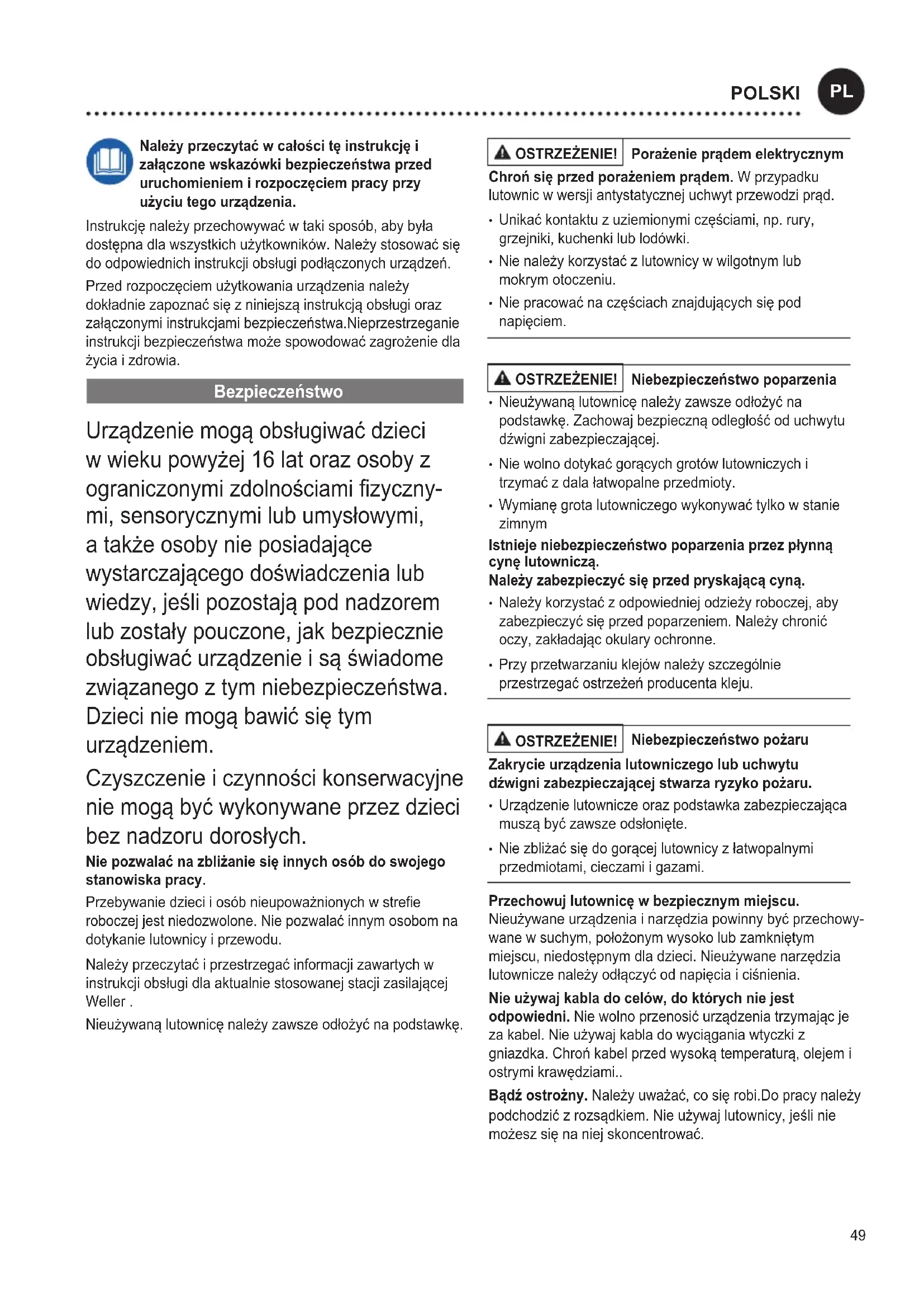 ČESKÝ49 Należy przeczytać w całości tę instrukcję i załączone wskazówki bezpieczeństwa przed uruchomieniem i rozpoczęciem pracy przy użyciu tego urządzenia. Instrukcję należy przechowywać w taki sposób, aby była dostępna dla wszystkich użytkowników. Należy stosować się do odpowiednich instrukcji obsługi podłączonych urządzeń. Przed rozpoczęciem użytkowania urządzenia należy dokładnie zapoznać się z niniejszą instrukcją obsługi oraz załączonymi instrukcjami bezpieczeństwa.Nieprzestrzeganie instrukcji bezpieczeństwa może spowodować zagrożenie dla życia i zdrowia. Bezpieczeństwo Urządzenie mogą obsługiwać dzieci w wieku powyżej 16 lat oraz osoby z ograniczonymi zdolnościami zyczny- mi, sensorycznymi lub umysłowymi, a także osoby nie posiadające wystarczającego doświadczenia lub wiedzy, jeśli pozostają pod nadzorem lub zostały pouczone, jak bezpiecznie obsługiwać urządzenie i są świadome związanego z tym niebezpieczeństwa. Dzieci nie mogą bawić się tym urządzeniem. Czyszczenie i czynności konserwacyjne nie mogą być wykonywane przez dzieci bez nadzoru dorosłych. Nie pozwalać na zbliżanie się innych osób do swojego stanowiska pracy. Przebywanie dzieci i osób nieupoważnionych w stree roboczej jest niedozwolone. Nie pozwalać innym osobom na dotykanie lutownicy i przewodu. Należy przeczytać i przestrzegać informacji zawartych w instrukcji obsługi dla aktualnie stosowanej stacji zasilającej Weller . Nieużywaną lutownicę należy zawsze odłożyć na podstawkę. OSTRZEENIE! Porażenie prądem elektrycznym Chroń się przed porażeniem prądem. W przypadku lutownic w wersji antystatycznej uchwyt przewodzi prąd.
