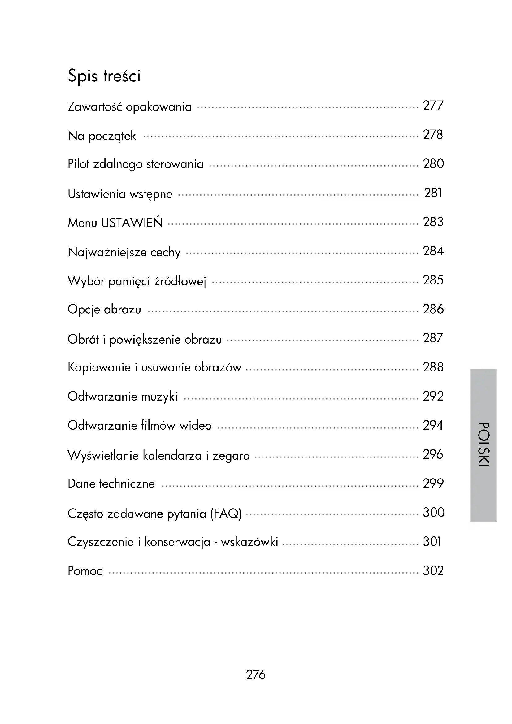 Spis treści Zawartość opakowania Na początek Pilot zdalnego sterowania Ustawienia wstępne Menu USTAWIEŃ Najważniejsze cechy Wybór pamięci źródłowej Opcje obrazu Obrót i powiększenie obrazu Kopiowanie i usuwanie obrazów Odtwarzanie muzyki Odtwarzanie filmów wideo Wyświetlanie kalendarza i zegara Dane techniczne Często zadawane pytania (FAQ) Czyszczenie i konserwacja - wskazówki Pomoc