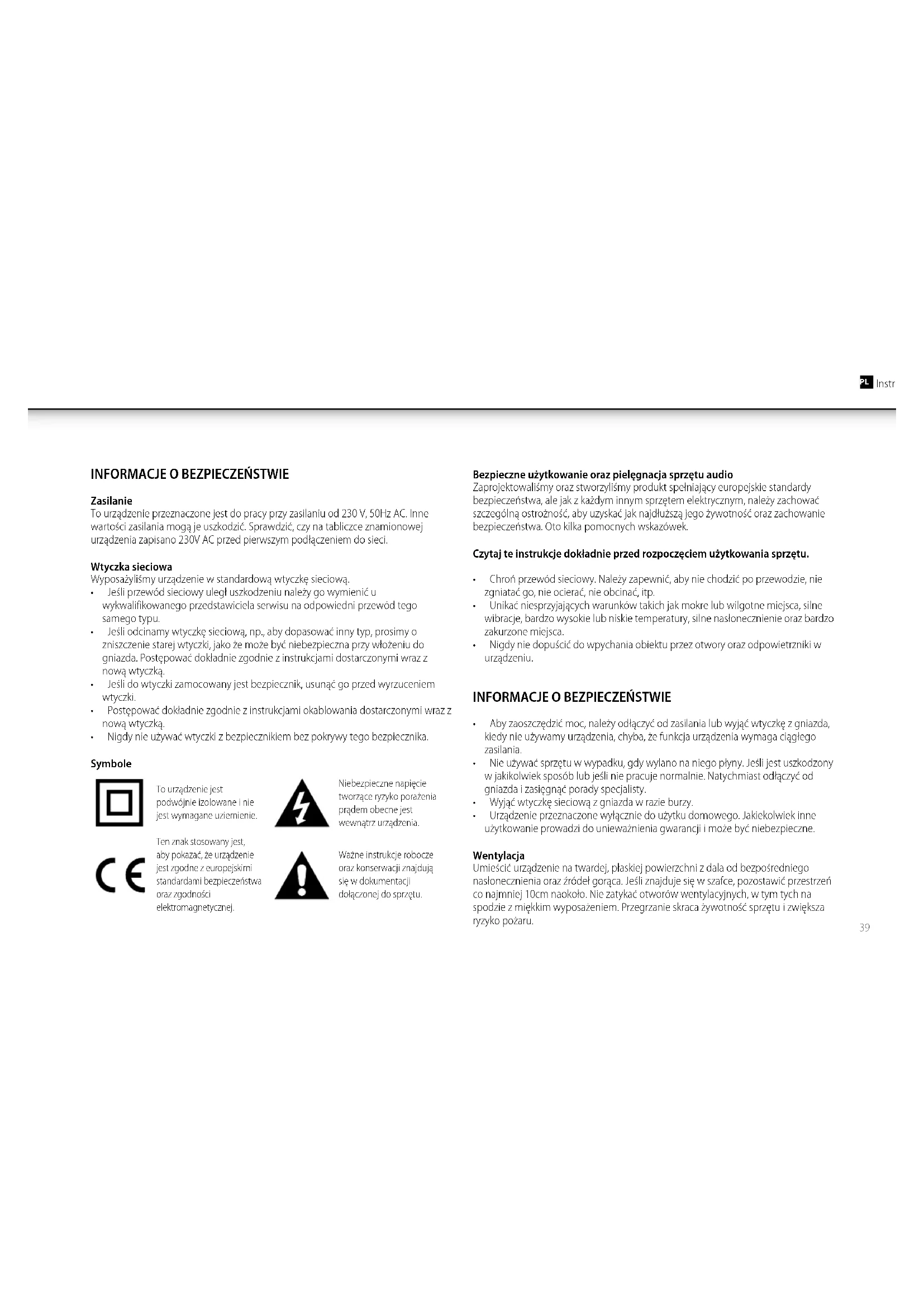 - Nigdy nie używać wtyczki z bezpiecznikiem bez pokrywy tego bezpiecznika. Symbole To urządzenie jest podwójnie izolowane i nie jest wymagane uziemienie. Niebezpieczne napięcie tworzące ryzyko porażenia prądem obecne jest wewnątrz urządzenia. Ten znak stosowany jest, aby pokazać, że urządzenie jest zgodne z europejskimi standardami bezpieczeństwa oraz zgodności elektromagnetycznej. Ważne instrukcje robocze oraz konserwacji znajdują się w dokumentacji dołączonej do sprzętu. Bezpieczne użytkowanie oraz pielęgnacja sprzętu audio Zaprojektowaliśmy oraz stworzyliśmy produkt spełniający europejskie standardy bezpieczeństwa, ale jak z każdym innym sprzętem elektrycznym, należy zachować szczególną ostrożność, aby uzyskać jak najdłuższą jego żywotność oraz zachowanie bezpieczeństwa. Oto kilka pomocnych wskazówek. Czytaj te instrukcje dokładnie przed rozpoczęciem użytkowania sprzętu.