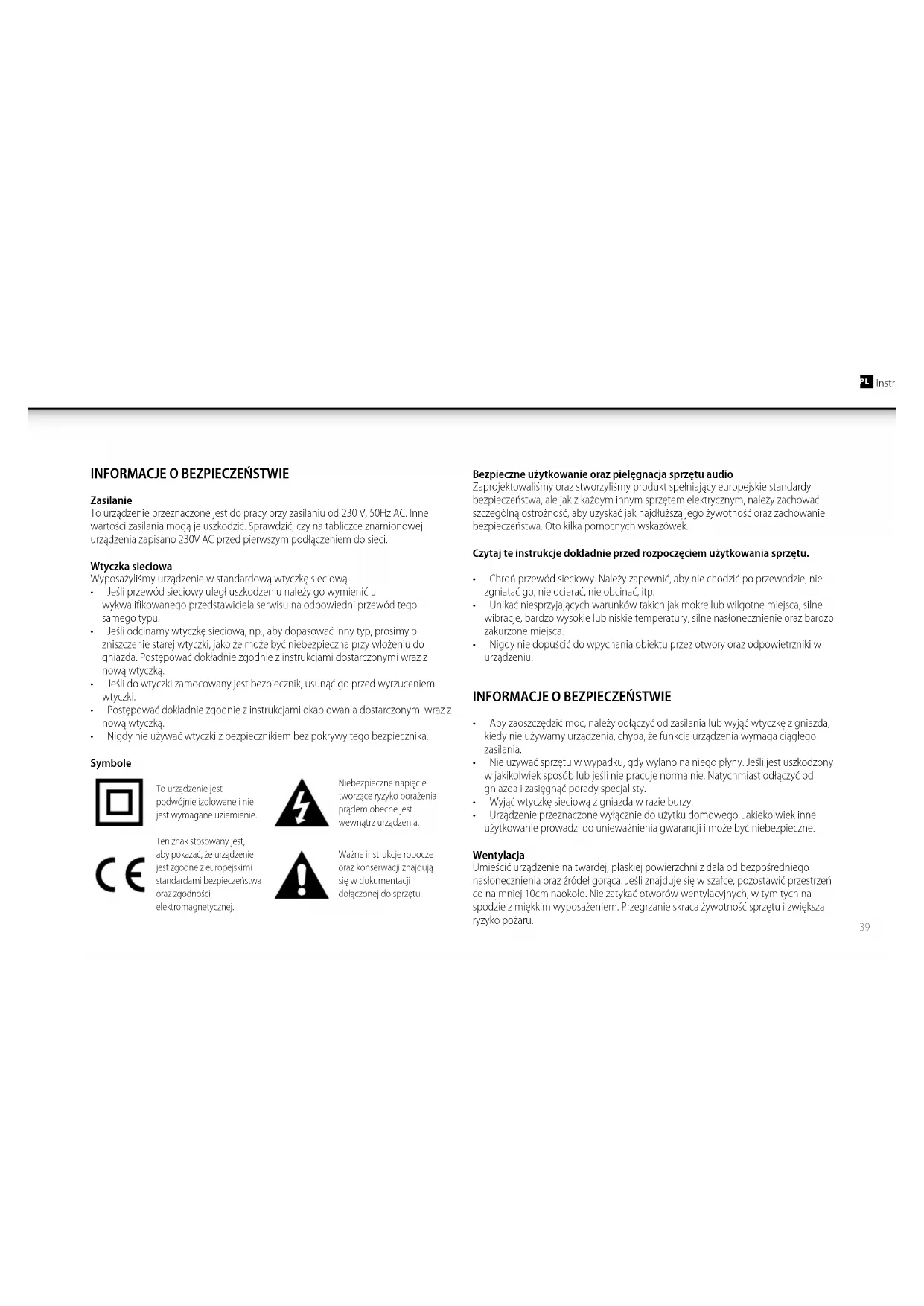 - Nigdy nie używać wtyczki z bezpiecznikiem bez pokrywy tego bezpiecznika. Symbole To urządzenie jest podwójnie izolowane i nie jest wymagane uziemienie. Niebezpieczne napięcie tworzące ryzyko porażenia prądem obecne jest wewnątrz urządzenia. Ten znak stosowany jest, aby pokazać, że urządzenie jest zgodne z europejskimi standardami bezpieczeństwa oraz zgodności elektromagnetycznej. Ważne instrukcje robocze oraz konserwacji znajdują się w dokumentacji dołączonej do sprzętu. Bezpieczne użytkowanie oraz pielęgnacja sprzętu audio Zaprojektowaliśmy oraz stworzyliśmy produkt spełniający europejskie standardy bezpieczeństwa, ale jak z każdym innym sprzętem elektrycznym, należy zachować szczególną ostrożność, aby uzyskać jak najdłuższą jego żywotność oraz zachowanie bezpieczeństwa. Oto kilka pomocnych wskazówek. Czytaj te instrukcje dokładnie przed rozpoczęciem użytkowania sprzętu.