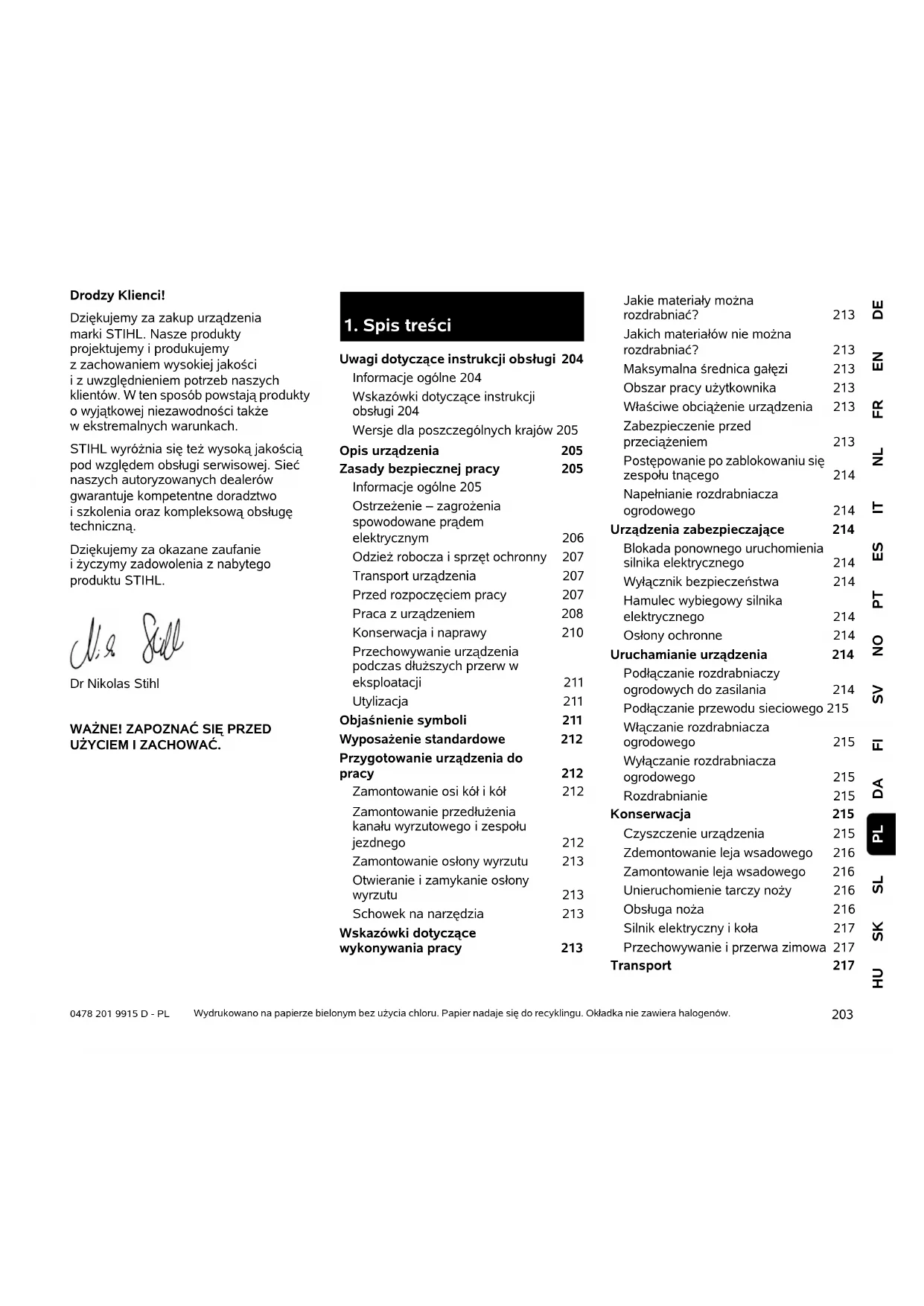 Uwagi dotyczące instrukcji obsługi 204 Informacje ogólne 204 Wskazówki dotyczące instrukcji obsługi 204 Wersje dla poszczególnych krajów 205 Opis urządzenia 205 Zasady bezpiecznej pracy 205 Informacje ogólne 205 Ostrzeżenie – zagrożenia spowodowane prądem elektrycznym 206 Odzież robocza i sprzęt ochronny 207 Transport urządzenia 207 Przed rozpoczęciem pracy 207 Praca z urządzeniem 208 Konserwacja i naprawy 210 Przechowywanie urządzenia podczas dłuższych przerw w eksploatacji 211 Utylizacja 211 Objaśnienie symboli 211 Wyposażenie standardowe 212 Przygotowanie urządzenia do pracy 212 Zamontowanie osi kół i kół 212 Zamontowanie przedłużenia kanału wyrzutowego i zespołu jezdnego 212 Zamontowanie osłony wyrzutu 213 Otwieranie i zamykanie osłony wyrzutu 213 Schowek na narzędzia 213 Wskazówki dotyczące wykonywania pracy 213 Jakie materiały można rozdrabniać?213 Jakich materiał ów nie można rozdrabniać?213 Maksymalna średnica gałęzi 213 Obszar pracy użytkownika 213 Właściwe obciążenie urządzenia 213 Zabezpieczenie przed przeciążeniem 213 Postępowanie po zablokowaniu się zespołu tnącego 214 Napełnianie rozdrabniacza ogrodowego 214 Urządzenia zabezpieczające 214 Blokada ponownego uruchomienia silnika elektrycznego 214 Wyłącznik bezpieczeństwa 214 Hamulec wybiegowy silnika elektrycznego 214 Osłony ochronne 214 Uruchamianie urządzenia 214 Podłączanie rozdrabniaczy ogrodowych do zasilania 214 Podłączanie przewodu sieciowego 215 Włączanie rozdrabniacza ogrodowego 215 Wyłączanie rozdrabniacza ogrodowego 215 Rozdrabnianie 215 Konserwacja 215 Czyszczenie urządzenia 215 Zdemontowanie leja wsadowego 216 Zamontowanie leja wsadowego 216 Unieruchomienie tarczy noży216 Obsługa noża216 Silnik elektryczny i koła217 Przechowywanie i przerwa zimowa 217 Transport 2170478 201 9915 D - PL