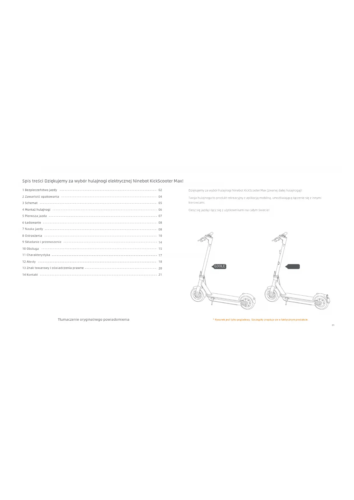 Inc. (firma Ninebot [Beijing] Tech Co., Ltd. Oraz jej spółki zależne i stowarzyszone) ani Segway Inc. nie ponoszą odpowiedzialności za obrażenia lub szkody spowodowane przez brak doświadczenia kierowcy lub nieprzestrzeganie instrukcji zawartych w tym dokumencie.