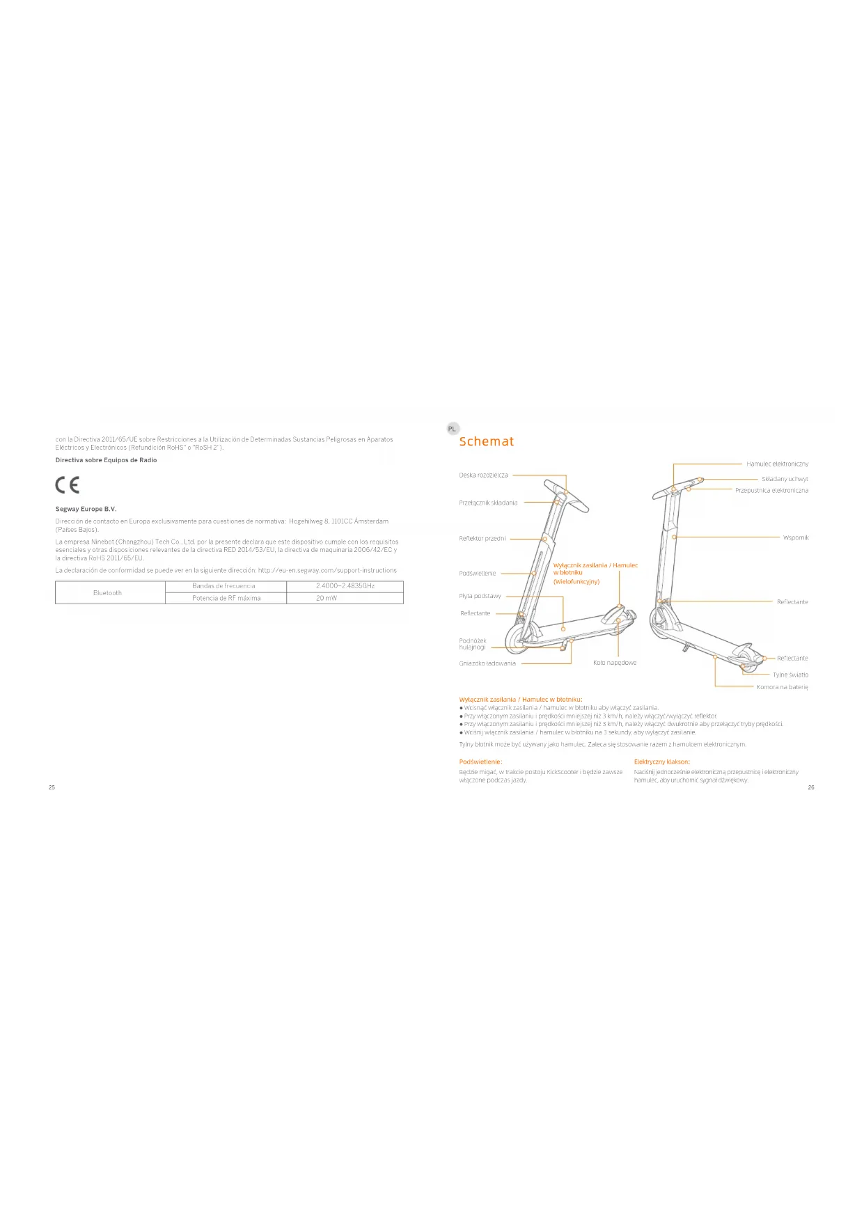 con la Directiva 2011/65/UE sobre Restricciones a la Utilización de Determinadas Sustancias Peligrosas en Aparatos Eléctricos y Electrónicos (Refundición RoHS" o "RoSH 2"). Directiva sobre Equipos de Radio Segway Europe B.V. Dirección de contacto en Europa exclusivamente para cuestiones de normativa: Hogehilweg 8, 1101CC Ámsterdam (Países Bajos). La empresa Ninebot (Changzhou) Tech Co., Ltd. por la presente declara que este dispositivo cumple con los requisitos esenciales y otras disposiciones relevantes de la directiva RED 2014/53/EU, la directiva de maquinaria 2006/42/EC y la directiva RoHS 2011/65/EU. La declaración de conformidad se puede ver en la siguiente dirección: http://eu-en.segway.com/support-instructions Bluetooth Potencia de RF máxima Bandas de frecuencia 20 mW 2.4000–2.4835GHz Schemat Wyłącznik zasilania / Hamulec w błotniku: ● Wcisnąć włącznik zasilania / hamulec w błotniku aby włączyć zasilania. ● Przy włączonym zasilaniu i prędkości mniejszej niż 3 km/h, należy włączyć/wyłączyć reflektor. ● Przy włączonym zasilaniu i prędkości mniejszej niż 3 km/h, należy włączyć dwukrotnie aby przełączyć tryby prędkości. ● Wciśnij włącznik zasilania / hamulec w błotniku na 3 sekundy, aby wyłączyć zasilanie. Tylny błotnik może być używany jako hamulec. Zaleca się stosowanie razem z hamulcem elektronicznym. Przepustnica elektroniczna Wyłącznik zasilania / Hamulec w błotniku (Wielofunkcyjny) Hamulec elektroniczny Deska rozdzielcza Składany uchwyt Wspornik Przełącznik składania Reflektor przedni Podświetlenie Płyta podstawy Reflectante Podnóżek hulajnogi Gniazdko ładowania Tylne światło Komora na baterię Koło napędowe Reflectante Reflectante Podświetlenie: Będzie migać, w trakcie postoju KickScooter i będzie zawsze włączone podczas jazdy. Elektryczny klakson: Naciśnij jednocześnie elektroniczną przepustnicę i elektroniczny hamulec, aby uruchomić sygnał dźwiękowy.2827 Deska rozdzielcza Prędkościomierz: wskazuje aktualną prędkość hulajnogi. Wyświetla również kody błędów. Błąd: ikona klucza wskazuje, że hulajnoga wykryła błąd. Bluetooth: ikona wskazuje, że hulajnoga została pomyślnie połączona z urządzeniem mobilnym. Wskaźnik temperatury: ikona wskazuje, że temperatura akumulatora osiągnęła 50ºC (122ºF) lub jest niższa niż 0ºC (32ºF) lub temperatura silnika osiągnęła 90ºC (194ºF).