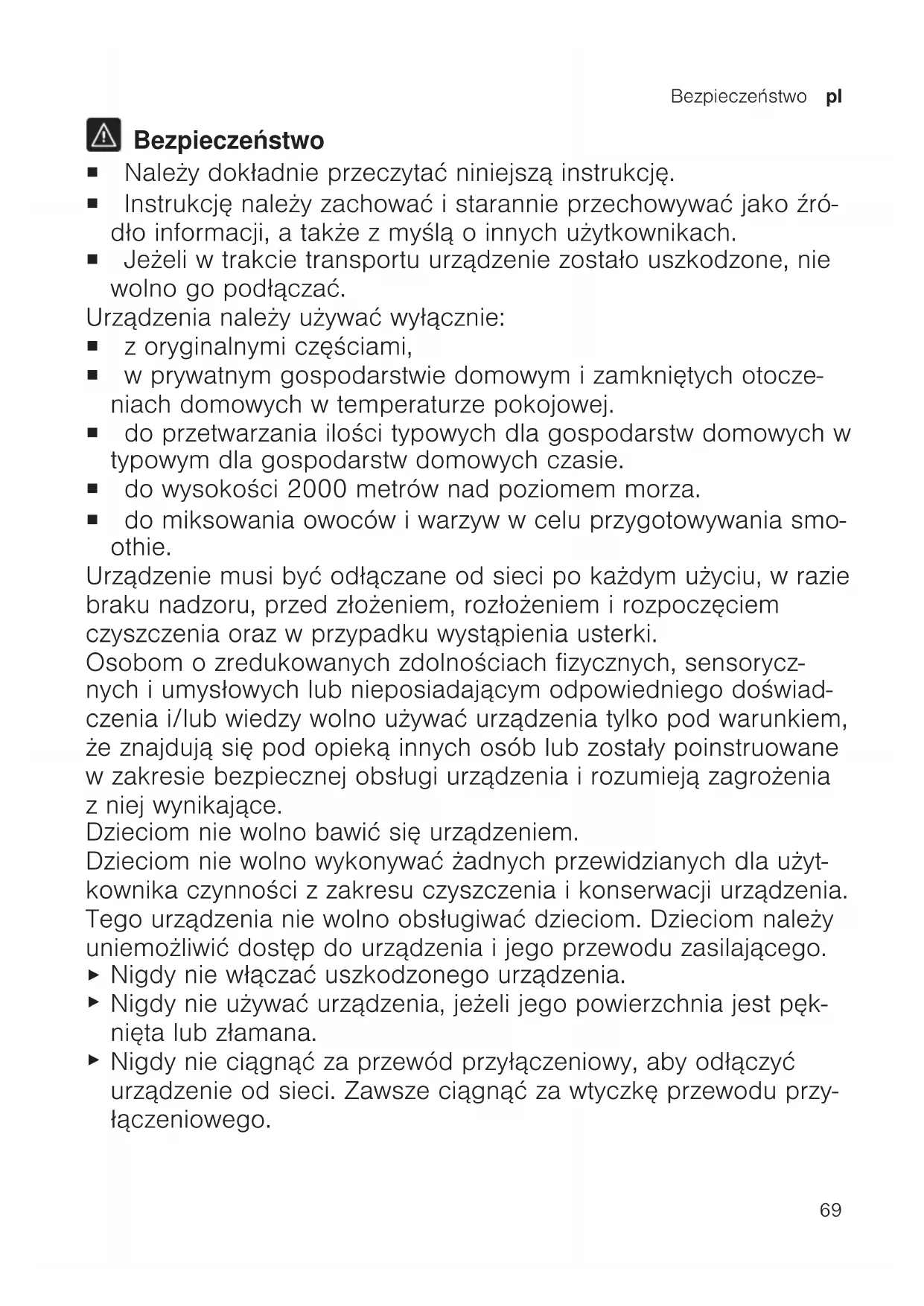 Bezpieczeństwo ¡ Należy dokładnie przeczytać niniejszą instrukcję. ¡ Instrukcję należy zachować i starannie przechowywać jako źró- dło informacji, a także z myślą o innych użytkownikach. ¡ Jeżeli w trakcie transportu urządzenie zostało uszkodzone, nie wolno go podłączać. Urządzenia należy używać wyłącznie: ¡ z oryginalnymi częściami, ¡ w prywatnym gospodarstwie domowym i zamkniętych otocze- niach domowych w temperaturze pokojowej. ¡ do przetwarzania ilości typowych dla gospodarstw domowych w typowym dla gospodarstw domowych czasie. ¡ do wysokości 2000 metrów nad poziomem morza. ¡ do miksowania owoców i warzyw w celu przygotowywania smo- othie. Urządzenie musi być odłączane od sieci po każdym użyciu, w razie braku nadzoru, przed złożeniem, rozłożeniem i rozpoczęciem czyszczenia oraz w przypadku wystąpienia usterki. Osobom o zredukowanych zdolnościach fizycznych, sensorycz- nych i umysłowych lub nieposiadającym odpowiedniego doświad- czenia i/lub wiedzy wolno używać urządzenia tylko pod warunkiem, że znajdują się pod opieką innych osób lub zostały poinstruowane w zakresie bezpiecznej obsługi urządzenia i rozumieją zagrożenia z niej wynikające. Dzieciom nie wolno bawić się urządzeniem. Dzieciom nie wolno wykonywać żadnych przewidzianych dla użyt- kownika czynności z zakresu czyszczenia i konserwacji urządzenia. Tego urządzenia nie wolno obsługiwać dzieciom. Dzieciom należy uniemożliwić dostęp do urządzenia i jego przewodu zasilającego.