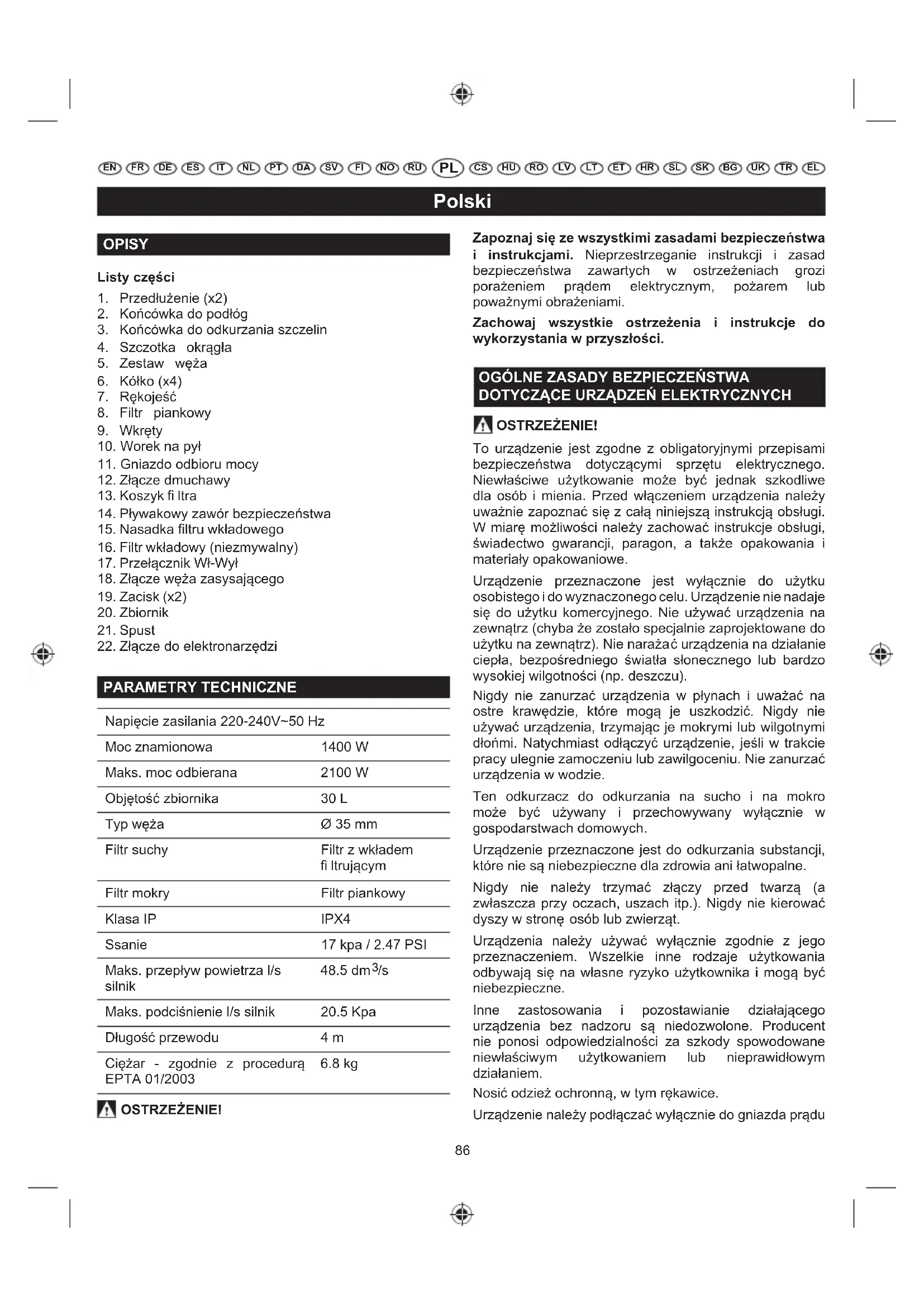 EN FR DE ES IT NL PT DA SV FI NO RU CS HU RO LV LT ET HR SL SK UKBG TR EL Aby chronić dzieci przed elektrycznymi urządzeniami gospodarstwa domowego, należy upewnić się, że nie mogą się one potknąć o przewód, a ponadto nie dawać dzieciom dostępu do urządzenia. Nigdy nie używać urządzenia pod wpływem leków, alkoholu lub narkotyków, w trakcie choroby lub w stanie zmęczenia. Regularnie sprawdzać urządzenie i przewód zasilający pod kątem ewentualnych uszkodzeń. Nie używać uszkodzonych urządzeń. Nie próbować naprawiać urządzenia samodzielnie. Naprawy należy zawsze powierzać wykwalifi kowanemu technikowi. Wymianę wadliwych przewodów zasilających należy niezwłocznie powierzać producentowi lub wykwalifi kowanemu serwisowi. Użyć tego samego typu kabla, aby zapobiec jakiemukolwiek niebezpieczeństwu porażenia prą dem i obrażeń. Stosować wyłącznie akcesoria i części zamienne. Niezatwierdzone części lub akcesoria innych producentów mogą stanowić źródło zagrożenia i spowodować utratę gwarancji. Często sprawdzać pływak. W przypadku zauważenia wycieku płynu z urządzenia należy je natychmiast wyłączyć i odłączyć od zasilania. Nie zanurzać urządzenia w wodzie. Upewnić się, że woda nie została rozlana na urządzenie. Podczas usuwania ścieków należy przestrzegać wszelkich przepisów prawa. Urządzenie należy przechowywać wyłącznie w bezpiecznym i suchym miejscu poza zasięgiem dzieci. Należy również zwrócić szczególną uwag ę na wymienione poniżej „Specjalne zasady bezpieczeństwa”. To urządzenie nie jest przeznaczone do użytkowania lub czyszczenia przez osoby o ograniczonej zdolności fi zycznej, czuciowej lub umysłowej, lub nieposiadające doświadczenia i wiedzy, chyba że zostały one poinstruowane w zakresie bezpiecznego użytkowania urządzenia przez osobę odpowiedzialną za ich bezpieczeństwo. Takie osoby powinny być nadzorowane podczas używania urządzenia. Dzieciom nie wolno używać, czyścić ani bawić się tym urządzeniem. Nieużywane urządzenie powinna być bezpiecznie schowane poza zasięgiem dzieci. Nie powinno się pozwalać dzieciom na zabawy z tym urządzeniem. Jeżeli przewód zasilający jest uszkodzony, musi zostać przemiennego 240 V. Przed użyciem urządzenia należy upewnić się, że właściwy worek na kurz został prawidłowo włożony do uchwytu. Niewłaściwy lub nieprawidłowo zamontowany worek na kurz może spowodować uszkodzenie urządzenia i unieważnienie gwarancji. Jeśli przewód zasilający jest uszkodzony, musi zostać w całości wymieniony wraz z osłoną przez autoryzowane centrum serwisowe lub inne wykwalifi kowane organizacje serwisowe. Nie odkurzać popiołów, gorących węgli itp., dużych fragmentów szkła ani ostrych przedmiotów. Nie odkurzać pyłu z tonera, stosowanego na przykład w drukarkach i kopiarkach, poniewa ż przewodzi on prąd elektryczny. Ponadto istnieje możliwość, że nie zostanie on całkowicie odfi ltrowany przez układ fi ltrujący odkurzacza i może zostać uwolniony do powietrza przez wentylator wydmuchowy. Nigdy nie odkurzać łatwopalnych lub trujących cieczy, takich jak benzyna, olej, kwasy lub inne lotne substancje. Nie odkurzać cieczy o temperaturze przekraczającej 60°C ani trujących lub łatwopalnych pyłów. Nigdy nie kłaść urządzenia na boku. Zwrócić szczególną uwagę na położenie poziome i odpowiednią stabilność na schodach. Zawsze odłączać urządzenie od zasilania po użyciu i przed czyszczeniem lub wymianą fi ltrów lub akcesoriów. Naprawy sprzętu elektrycznego mogą wykonywać wyłącznie przeszkoleni specjaliści. Niewłaściwe naprawy mogą spowodować poważne zagrożenie dla użytkownika. Nie przechowywać urządzenia bezpośrednio przy gorącym piekarniku lub grzejniku. Dzieci, osoby niepełnosprawne i osoby w podeszłym wieku często nie są świadome zagrożeń, które mogą wynikać z obsługi urządzeń elektrycznych. Wyżej wymienione osoby oraz osoby nieprzeszkolone nigdy nie mogą pracować z tym urządzeniem elektrycznym. Na czas czyszczenia lub przechowywania urządzenia należy je zawsze wyłączać. Wyjąć wtyczkę z gniazdka, jeśli nie zamierza się używać urządzenia przez dłuższy czas. Nigdy nie pociągać za kabel, aby odłączyć urządzenie — zamiast tego pociągn ąć za wtyczkę. Należy również wyjąć z urządzenia wszelkie akcesoria specjalne. Urządzenie należy zawsze utrzymywać w czystości. Nie należy używać rozpuszczalników ani środków czyszczących, które mogą uszkodzić urządzenie lub być szkodliwe dla użytkownika. Nigdy nie pozostawiać włączonego urządzenia bez nadzoru. Przed opuszczeniem obszaru roboczego należy wyłączyć urządzenie lub odłączyć je od gniazdka (ciągnąc za wtyczkę, a nie za przewód).88 Polski