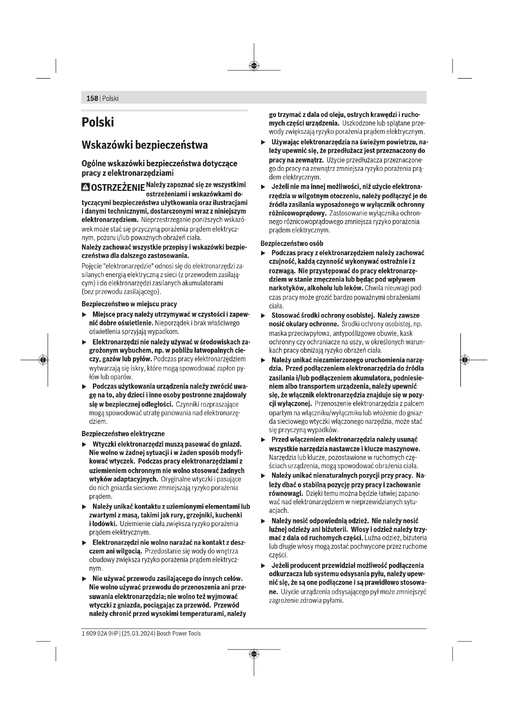Karasoku Mahallesi 28028. Sokak No:20/A Merkez / ADANA Tel.: +903223599710 -3521379 Fax: +903223591323 E-mail: isiklar@isiklarelektrik.com Diğer servis adreslerini şurada bulabilirsiniz: www.bosch-pt.com/serviceaddresses Tasfiye Elektrikli el aleti, aksesuar ve ambalaj malzemesi çevre dostu bir yöntemle tasfiye edilmek üzere tekrar kazanım merkezine gönderilmelidir. Elektrikli el aletlerini evsel çöplerin içine atmayın! Sadece AB ülkeleri için: Artık kullanılmayan elektrikli el aletleri ayrı olarak imha edilmelidir. Belirtilen toplama sistemlerini kullanın. Atık elektrikli ve elektronik ekipmanlar uygun şekilde imha edilmezse olası tehlikeli maddelerin varlığı nedeniyle çevre ve insan sağlığı üzerinde zararlı etkileri olabilir. Bosch Power Tools 1 609 92A 9HP | (25.03.2024)158 | Polski Polski Wskazówki bezpieczeństwa Ogólne wskazówki bezpieczeństwa dotyczące pracy z elektronarzędziami OSTRZEŻENIE Należy zapoznać się ze wszystkimi ostrzeżeniami i wskazówkami do- tyczącymi bezpieczeństwa użytkowania oraz ilustracjami i danymi technicznymi, dostarczonymi wraz z niniejszym elektronarzędziem. Nieprzestrzeganie poniższych wskazó- wek może stać się przyczyną porażenia prądem elektrycz- nym, pożaru i/lub poważnych obrażeń ciała. Należy zachować wszystkie przepisy i wskazówki bezpie- czeństwa dla dalszego zastosowania. Pojęcie "elektronarzędzie" odnosi się do elektronarzędzi za- silanych energią elektryczną z sieci (z przewodem zasilają- cym) i do elektronarzędzi zasilanych akumulatorami (bezprzewodu zasilającego). Bezpieczeństwo w miejscu pracy u Miejsce pracy należy utrzymywać w czystości i zapew- nić dobre oświetlenie. Nieporządek i brak właściwego oświetlenia sprzyjają wypadkom. u Elektronarzędzi nie należy używać w środowiskach za- grożonym wybuchem, np. w pobliżu łatwopalnych cie- czy, gazów lub pyłów. Podczas pracy elektronarzędziem wytwarzają się iskry, które mogą spowodować zapłon py- łów lub oparów. u Podczas użytkowania urządzenia należy zwrócić uwa- gę na to, aby dzieci i inne osoby postronne znajdowały się w bezpiecznej odległości. Czynniki rozpraszające mogą spowodować utratę panowania nad elektronarzę- dziem. Bezpieczeństwo elektryczne u Wtyczki elektronarzędzi muszą pasować do gniazd. Nie wolno w żadnej sytuacji i w żaden sposób modyfi- kować wtyczek. Podczas pracy elektronarzędziami z uziemieniem ochronnym nie wolno stosować żadnych wtyków adaptacyjnych. Oryginalne wtyczki i pasujące do nich gniazda sieciowe zmniejszają ryzyko porażenia prądem. u Należy unikać kontaktu z uziemionymi elementami lub zwartymi z masą, takimi jak rury, grzejniki, kuchenki ilodówki. Uziemienie ciała zwiększa ryzyko porażenia prądem elektrycznym. u Elektronarzędzi nie wolno narażać na kontakt z desz- czem ani wilgocią. Przedostanie się wody do wnętrza obudowy zwiększa ryzyko porażenia prądem elektrycz- nym. u Nie używać przewodu zasilającego do innych celów. Nie wolno używać przewodu do przenoszenia ani prze- suwania elektronarzędzia; nie wolno też wyjmować wtyczki z gniazda, pociągając za przewód. Przewód należy chronić przed wysokimi temperaturami, należy go trzymać zdala od oleju, ostrych krawędzi i rucho- mych części urządzenia. Uszkodzone lub splątane prze- wody zwiększają ryzyko porażenia prądem elektrycznym. u Używając elektronarzędzia na świeżym powietrzu, na- leży upewnić się, że przedłużacz jest przeznaczony do pracy na zewnątrz. Użycie przedłużacza przeznaczone- go do pracy na zewnątrz zmniejsza ryzyko porażenia prą- dem elektrycznym. u Jeżeli nie ma innej możliwości, niż użycie elektrona- rzędzia w wilgotnym otoczeniu, należy podłączyć je do źródła zasilania wyposażonego w wyłącznik ochronny różnicowoprądowy. Zastosowanie wyłącznika ochron- nego różnicowoprądowego zmniejsza ryzyko porażenia prądem elektrycznym. Bezpieczeństwo osób u Podczas pracy z elektronarzędziem należy zachować czujność, każdą czynność wykonywać ostrożnie i z rozwagą. Nie przystępować do pracy elektronarzę- dziem w stanie zmęczenia lub będąc pod wpływem narkotyków, alkoholu lub leków. Chwila nieuwagi pod- czas pracy może grozić bardzo poważnymi obrażeniami ciała. u Stosować środki ochrony osobistej. Należy zawsze nosić okulary ochronne. Środki ochrony osobistej, np. maska przeciwpyłowa, antypoślizgowe obuwie, kask ochronny czy ochraniacze na uszy, w określonych warun- kach pracy obniżają ryzyko obrażeń ciała. u Należy unikać niezamierzonego uruchomienia narzę- dzia. Przed podłączeniem elektronarzędzia do źródła zasilania i/lub podłączeniem akumulatora, podniesie- niem albo transportem urządzenia, należy upewnić się, że włącznik elektronarzędzia znajduje się w pozy- cji wyłączonej. Przenoszenie elektronarzędzia z palcem opartym na włączniku/wyłączniku lub włożenie do gniaz- da sieciowego wtyczki włączonego narzędzia, może stać się przyczyną wypadków. u Przed włączeniem elektronarzędzia należy usunąć wszystkie narzędzia nastawcze i klucze maszynowe. Narzędzia lub klucze, pozostawione wruchomych czę- ściach urządzenia, mogą spowodować obrażenia ciała. u Należy unikać nienaturalnych pozycji przy pracy. Na- leży dbać o stabilną pozycję przy pracy i zachowanie równowagi. Dzięki temu można będzie łatwiej zapano- wać nad elektronarzędziem w nieprzewidzianych sytu- acjach. u Należy nosić odpowiednią odzież. Nie należy nosić luźnej odzieży ani biżuterii. Włosy i odzież należy trzy- mać z dala od ruchomych części. Luźna odzież, biżuteria lub długie włosy mogą zostać pochwycone przez ruchome części. u Jeżeli producent przewidział możliwość podłączenia odkurzacza lub systemu odsysania pyłu, należy upew- nić się, że są one podłączone i są prawidłowo stosowa- ne. Użycie u