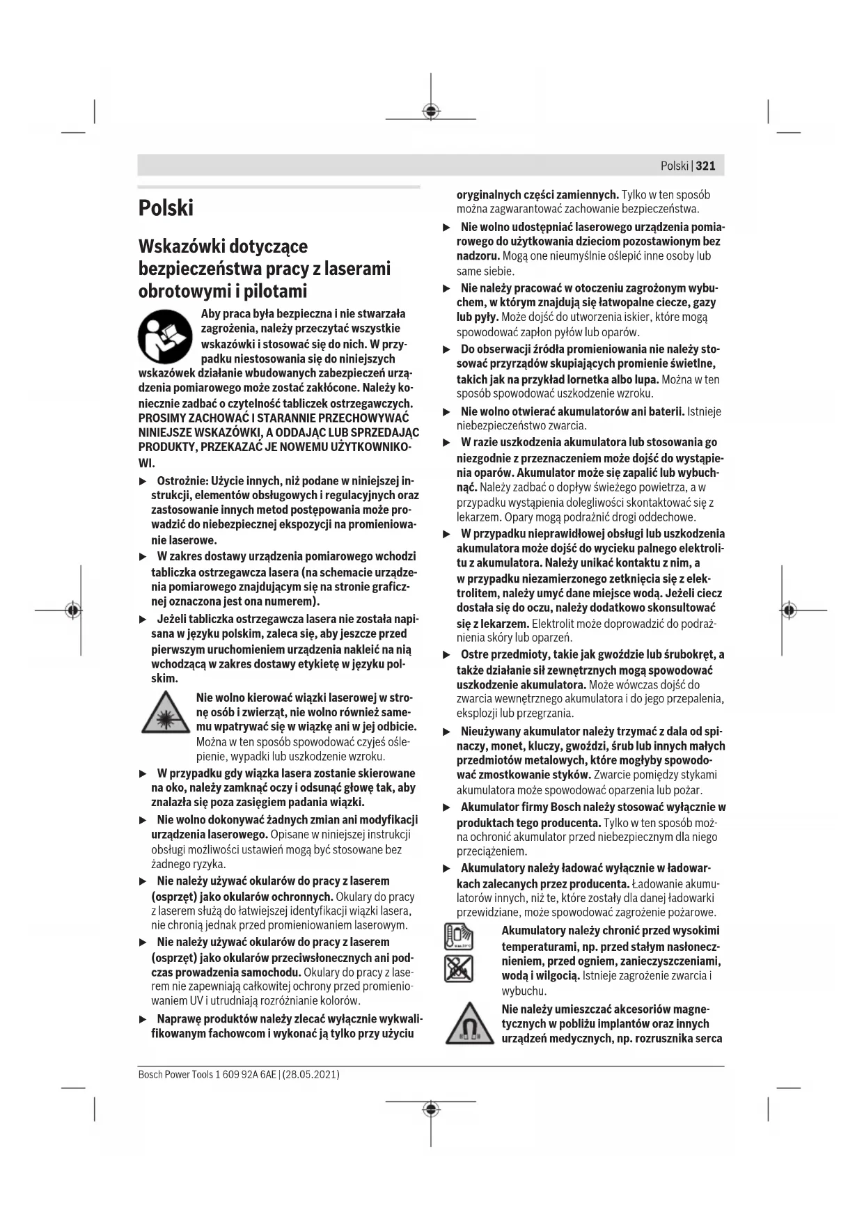 WI. u Ostrożnie: Użycie innych, niż podane w niniejszej in- strukcji, elementów obsługowych iregulacyjnych oraz zastosowanie innych metod postępowania może pro- wadzić do niebezpiecznej ekspozycji na promieniowa- nie laserowe. u W zakres dostawy urządzenia pomiarowego wchodzi tabliczka ostrzegawcza lasera (na schemacie urządze- nia pomiarowego znajdującym się na stronie graficz- nej oznaczona jest ona numerem). u Jeżeli tabliczka ostrzegawcza lasera nie została napi- sana w języku polskim, zaleca się, aby jeszcze przed pierwszym uruchomieniem urządzenia nakleić na nią wchodzącą w zakres dostawy etykietę w języku pol- skim. Nie wolno kierować wiązki laserowej wstro- nę osób i zwierząt, nie wolno również same- mu wpatrywać się w wiązkę ani w jej odbicie. Można w ten sposób spowodować czyjeś ośle- pienie, wypadki lub uszkodzenie wzroku. u W przypadku gdy wiązka lasera zostanie skierowane na oko, należy zamknąć oczy i odsunąć głowę tak, aby znalazła się poza zasięgiem padania wiązki. u Nie wolno dokonywać żadnych zmian ani modyfikacji urządzenia laserowego. Opisane w niniejszej instrukcji obsługi możliwości ustawień mogą być stosowane bez żadnego ryzyka. u Nie należy używać okularów do pracy z laserem (osprzęt) jako okularów ochronnych. Okulary do pracy z laserem służą do łatwiejszej identyfikacji wiązki lasera, nie chronią jednak przed promieniowaniem laserowym. u Nie należy używać okularów do pracy z laserem (osprzęt) jako okularów przeciwsłonecznych ani pod- czas prowadzenia samochodu. Okulary do pracy z lase- rem nie zapewniają całkowitej ochrony przed promienio- waniem UV i utrudniają rozróżnianie kolorów. u Naprawę produktów należy zlecać wyłącznie wykwali- fikowanym fachowcom i wykonać ją tylko przy użyciu oryginalnych części zamiennych. Tylko w ten sposób można zagwarantować zachowanie bezpieczeństwa. u Nie wolno udostępniać laserowego urządzenia pomia- rowego do użytkowania dzieciom pozostawionym bez nadzoru. Mogą one nieumyślnie oślepić inne osoby lub same siebie. u Nie należy pracować w otoczeniu zagrożonym wybu- chem, w którym znajdują się łatwopalne ciecze, gazy lub pyły. Może dojść do utworzenia iskier, które mogą spowodować zapłon pyłów lub oparów. u Do obserwacji źródła promieniowania nie należy sto- sować przyrządów skupiających promienie świetlne, takich jak na przykład lornetka albo lupa. Można w ten sposób spowodować uszkodzenie wzroku. u Nie wolno otwierać akumulatorów ani baterii. Istnieje niebezpieczeństwo zwarcia. u W razie uszkodzenia akumulatora lub stosowania go niezgodnie z przeznaczeniem może dojść do wystąpie- nia oparów. Akumulator może się zapalić lub wybuch- nąć. Należy zadbać o dopływ świeżego powietrza, a w przypadku wystąpienia dolegliwości skontaktować się z lekarzem. Opary mogą podrażnić drogi oddechowe. u W przypadku nieprawidłowej obsługi lub uszkodzenia akumulatora może dojść do wycieku palnego elektroli- tu z akumulatora. Należy unikać kontaktu z nim, a wprzypadku niezamierzonego zetknięcia się z elek- trolitem, należy umyć dane miejsce wodą. Jeżeli ciecz dostała się do oczu, należy dodatkowo skonsultować się z lekarzem. Elektrolit może doprowadzić do podraż- nienia skóry lub oparzeń. u Ostre przedmioty, takie jak gwoździe lub śrubokręt, a także działanie sił zewnętrznych mogą spowodować uszkodzenie akumulatora. Może wówczas dojść do zwarcia wewnętrznego akumulatora i do jego przepalenia, eksplozji lub przegrzania. u Nieużywany akumulator należy trzymać z dala od spi- naczy, monet, kluczy, gwoździ, śrub lub innych małych przedmiotów metalowych, które mogłyby spowodo- wać zmostkowanie styków. Zwarcie pomiędzy stykami akumulatora może spowodować oparzenia lub pożar. u Akumulator firmy Bosch należy stosować wyłącznie w produktach tego producenta. Tylko w ten sposób moż- na ochronić akumulator przed niebezpiecznym dla niego przeciążeniem. u Akumulatory należy ładować wyłącznie władowar- kach zalecanych przez producenta. Ładowanie akumu- latorów innych, niż te, które zostały dla danej ładowarki przewidziane, może spowodować zagrożenie pożarowe. Akumulatory należy chronić przed wysokimi temperaturami, np. przed stałym nasłonecz- nieniem, przed ogniem, zanieczyszczeniami, wodą i wilgocią. Istnieje zagrożenie zwarcia i wybuchu. Nie należy umieszczać akcesoriów magne- tycznych w pobliżu implantów oraz innych urządzeń medycznych, np. rozrusznika serca Bosch Power Tools 1 609 92A 6AE | (28.05.2021)322 | Polski lub pompy insulinowej. Magnesy akcesoriów wytwarzają pole, które może zakłócić działanie implantów i urządzeń medycznych. u Akcesoria magnetyczne należy przechowywać z dala od magnetycznych nośników danych oraz urządzeń wrażliwych magnetycznie. Pod wpływem działania ma- gnesów akcesoriów może dojść do nieodwracalnej utraty danych. u OSTROŻNIE! Podczas pracy z urządzeniami pomiaro- wymi z funkcją Bluetooth® może dojść do zakłócenia działania innych urządzeń i instalacji, samolotów i urządzeń medycznych (np. rozruszników serca, apara- tów słuchowych. Nie można także całkowicie wyklu- czyć potencjalnie szkodliwego wpływu na ludzi i zwie- rzęta, przebywające w bezpośredniej bliskości. Nie należy stosować urządzenia pomiarowego z funkcją Bluetooth® w pobliżu urządzeń medycznych, stacji ben- zynowych, zakładów chemicznych ani w rejonach za- grożonych wybuchem. Nie wolno użytkować urządze- nia pomiarowego z funkcją Bluetooth® w samolotach. Należy unikać długotrwałego użytkowania urządzenia, jeżeli znajduje się ono w bezpośredniej bliskości ciała. Znak słowny Bluetooth® oraz znaki graficzne (logo) są za- rejestrowanymi znakami towarowymi i stanowią wła- sność Bluetooth SIG, Inc. Wszelkie wykorzystanie tych znaków przez firmę 