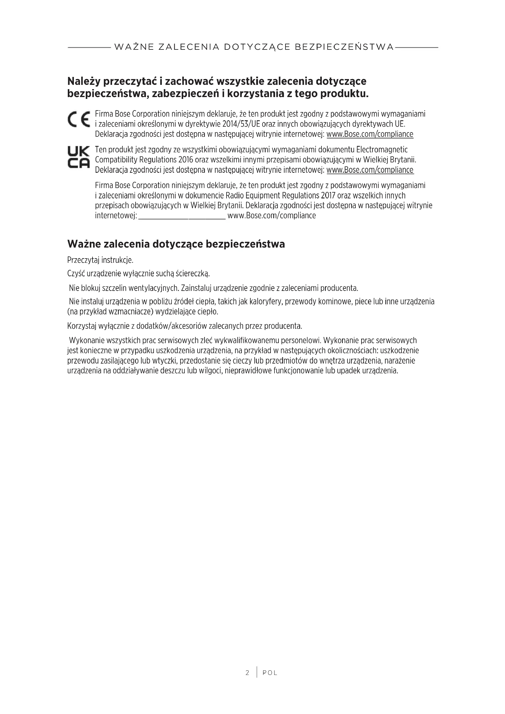 POL Należy przeczytać izachować wszystkie zalecenia dotyczące bezpieczeństwa, zabezpieczeń ikorzystania ztego produktu. Firma Bose Corporation niniejszym deklaruje, żeten produkt jest zgodny zpodstawowymi wymaganiami izaleceniami określonymi wdyrektywie 2014/53/UE oraz innych obowiązujących dyrektywachUE. Deklaracjazgodności jest dostępna wnastępującej witrynie internetowej: www.Bose.com/compliancewww.Bose.com/compliance Ten produkt jest zgodny zewszystkimi obowiązującymi wymaganiami dokumentu Electromagnetic Compatibility Regulations 2016 oraz wszelkimi innymi przepisami obowiązującymi wWielkiej Brytanii. Deklaracja zgodności jest dostępna wnastępującej witrynie internetowej: www.Bose.com/compliancewww.Bose.com/compliance Firma Bose Corporation niniejszym deklaruje, że ten produkt jest zgodny zpodstawowymi wymaganiami izaleceniami określonymi wdokumencie Radio Equipment Regulations 2017 oraz wszelkich innych przepisach obowiązujących wWielkiej Brytanii. Deklaracja zgodności jest dostępna wnastępującej witrynie internetowej: www.Bose.com/compliancewww.Bose.com/compliance Ważne zalecenia dotyczące bezpieczeństwa Przeczytaj instrukcje. Czyść urządzenie wyłącznie suchą ściereczką. Nieblokuj szczelin wentylacyjnych. Zainstaluj urządzenie zgodnie zzaleceniami producenta. Nieinstaluj urządzenia wpobliżu źródeł ciepła, takich jak kaloryfery, przewody kominowe, piece lub inne urządzenia (naprzykład wzmacniacze) wydzielające ciepło. Korzystaj wyłącznie zdodatków/akcesoriów zalecanych przez producenta. Wykonanie wszystkich prac serwisowych zleć wykwalifikowanemu personelowi. Wykonanie prac serwisowych jest konieczne wprzypadku uszkodzenia urządzenia, naprzykład wnastępujących okolicznościach: uszkodzenie przewodu zasilającego lub wtyczki, przedostaniesię cieczy lub przedmiotów downętrza urządzenia, narażenie urządzenia naoddziaływanie deszczu lubwilgoci, nieprawidłowe funkcjonowanie lub upadek urządzenia.WAŻNE ZALECENIA DOTYCZĄCE BEZPIECZEŃSTWA