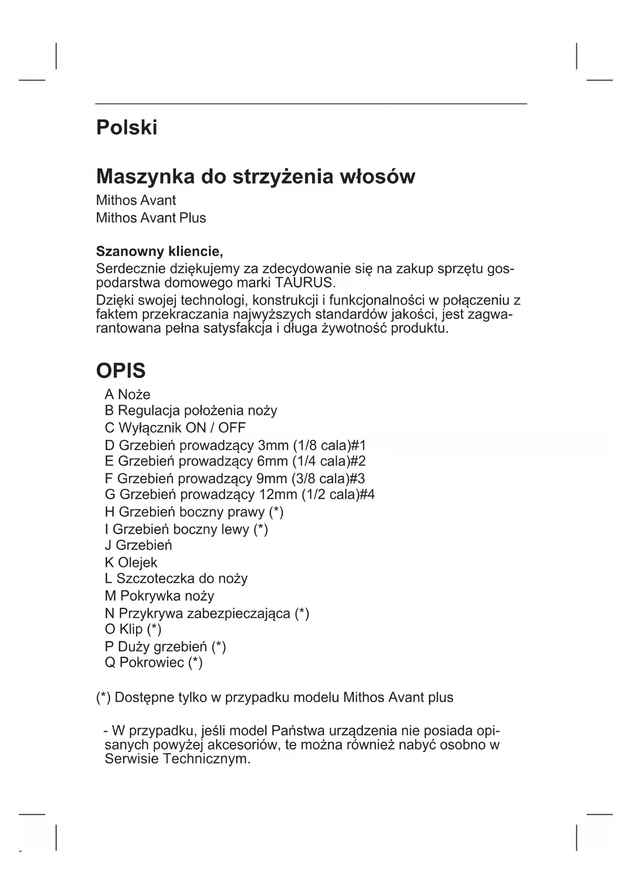 HET PRODUCT - De verpakking van dit apparaat bestaat uit gerecycleerd mate- riaal. Als u zich van dit materiaal wenst te ontdoen, kunt u gebruik maken van de openbare containers die voor ieder type materiaal geschikt zijn. - Het product bevat geen concentraties materialen die schadelijk zijn voor het milieu. Dit symbool betekent dat indien u zich van dit product wilt ontdoen als het eenmaal versleten is, het product naar een erkende afvalverwerker dient te brengen die voor de selectieve ophaling van Afgedankte Elektrische en Elektro- nische Apparatuur (AEEA).Dit apparaat voldoet aan de laagspanningsrichtlijn 2014/35/EU, de richtlijn 2014/30/EU met betrekking tot elektromagnetische compati- biliteit, de richtlijn 2011/65/EU met betrekking tot beperkingen in de toepassing van bepaalde gevaarlijke stoffen in elektrische en elektro- nische apparaten en de richtlijn 2009/125/EC met betrekking tot de eisen inzake het ecologisch ontwerp van energiegerelateerPolski Maszynka do strzyżenia włosów Mithos Avant Mithos Avant Plus Szanowny kliencie, Serdecznie dziękujemy za zdecydowanie się na zakup sprzętu gos- podarstwa domowego marki TAURUS. Dzięki swojej technologi, konstrukcji i funkcjonalności w połączeniu z faktem przekraczania najwyższych standardów jakości, jest zagwa- rantowana pełna satysfakcja i długa żywotność produktu. OPIS A Noże B Regulacja położenia noży C Wyłącznik ON / OFF D Grzebień prowadzący 3mm (1/8 cala)#1 E Grzebień prowadzący 6mm (1/4 cala)#2 F Grzebień prowadzący 9mm (3/8 cala)#3 G Grzebień prowadzący 12mm (1/2 cala)#4 H Grzebień boczny prawy (*) I Grzebień boczny lewy (*) J Grzebień K Olejek L Szczoteczka do noży M Pokrywka noży N Przykrywa zabezpieczająca (*) O Klip (*) P Duży grzebień (*) Q Pokrowiec (*) (*) Dostępne tylko w przypadku modelu Mithos Avant plus - W przypadku, jeśli model Państwa urządzenia nie posiada opi- sanych powyżej akcesoriów, te można również nabyć osobno w Serwisie Technicznym.- Przeczytaj uważnie te instrukcje przed włączeniem urządzenia i zachowaj je do późniejszych konsultacji. Nie przestrzeganie tych instrukcji może spowodować wypadek. PORADY I OSTRZEŻENIA DOT. BEZPIECZEŃSTWA - To urządzenie może być używane przez dzieci od 3 roku życia pod nadzorem. - Urządzenie może być używane przez osoby niezapoznane z tego typu produktem, osoby niepełnosprawne lub dzieci od 8 roku życia, tylko i wyłącznie pod kontrolą dorosłych zapoznanym z tego typu sprzętem. - To urządzenie nie jest zabawką. Dzieci powinny pozostać pod czujną opieką w celu zagwarantowania iż nie bawią się urządzeniem. - Czyszczenie i konserwacja urządzenia nie powinny być wykonywane przez dzieci bez nadzoru dorosłych. - OSTRZEŻENIE: Nie należy używać tego aparatu w pobliżu umywalek, zlewów, wanny lub innych zbiorników zawierających wodę. - Ten symbol oznacza, że nie należy używać tego urządzenia w pobliżu wody. - Jeśli połączenie zasilające jest uszkodzonenależy je wymienić. Zanieść urządzenie do autoryzowanego centrum serwisowego. Nie próbować rozbierać urządzenia ani go naprawiać, ponieważ może to być niebezpieczne. - Przed podłączeniem maszyny do sieci, sprawdzić czy napięcie wskazane na tabliczce znamionowej odpowiada napięciu sieci. - Podłączyć urządzenie do gniazdka z uziemieniem, które może utrzymać 10 amperów. - Wtyczka urządzenia powinna być zgodna z podstawą elektryczną gniazdka. Nie zmieniać nigdy wtyczki. Nie używać przejściówek dla wtyczki. - Nie ciągnąć na siłę kabla zasilającego. Nie używać nigdy kabla elektrycznego do podnoszenia, przenoszenia ani wyłączania urządzenia. - Nie zwijać kabla wokół urządzenia. - Nie dopuszczać, by kabel elektryczny podłączenia zwisał ze stołu ani by był w kontakcie z gorącymi powierzchniami urządzenia. - Sprawdzać stan elektrycznego kabla połączeń. Uszkodzone czy zaplątane kable zwiększają ryzyko porażenia prądem. - Nie dotykać wtyczki mokrymi rękoma. - Nie używać urządzenia, gdy kabel elektryczny lub wtyczka jest uszkodzona. - Jeśli popęka jakiś element obudowy urządzenia, natychmiast wyłączyć urządzenie z prądu, aby uniknąć porażenia prądem. - Nie używać urządzenia, jeśli upadło lub jeśli występują widoczne oznaki uszkodzenia lub wycieki. - Nie wystawiać urządzenia na deszcz ani narażać na warunki wilgotności. Kontakt urządzenia z wodą powoduje zwiększenie ryzyka porażenia prądem. - OSTRZEŻENIE: Utrzymać suche urządzenie. - Nie używać urządzenia mając wilgotne ręce czy stopy, ani będąc boso. - Nie dotykać ruchomych części urządzenia, kiedy jest ono w trakcie działania. UŻYWANIE I KONSERWACJA: - Nie używać urządzenia jeśli jego akcesoria nie są odpowiednio zamontowane lub są uszkodzone. Należy je wówczas natych- miast wymienić.- Nie należy używać urządzenia na mokrych włosach. - Nie używać urządzenia, jeśli nie działa przycisk włączania ON/ OFF. - Jeśli urządzenie jest używane w łazience lub podobnym miejscu, wyłączać urządzenie z prądu, kiedy nie jest ono używane, nawet jeśli ma to miejsce na krótki okres czasu, ponieważ bliskość wody stanowi zagrożenie, nawet jeśli urządzenie jest wyłączone. - Wyłączać urządzenie z prądu, jeśli nie jest ono używane i przed przystąpieniem do jakiegokolwiek czyszczenia. - Urządzenie to zaprojektowane zostało wyłącznie do użytku do- mowego, a nie do użytku profesjonalnego czy przemysłowego. - Przechowywać urządzenie w miejsce niedostępnym dla dzieci i/ lub osób o ograniczonych zdolnościach zycznych, dotykowych lub mentalnych oraz nie posiadających doświadczenia lub znajomości tego typu urządzeń. - Nie pozostawiać urządzenia włączonego leżącego na jakiejś powierzchni. - Utrzymywać urządzenie w dobrym stanie. Sprawdzać, czy rucho- me części nie są poprzestawiane względem siebie czy zaklesz- czone, czy nie ma zep
