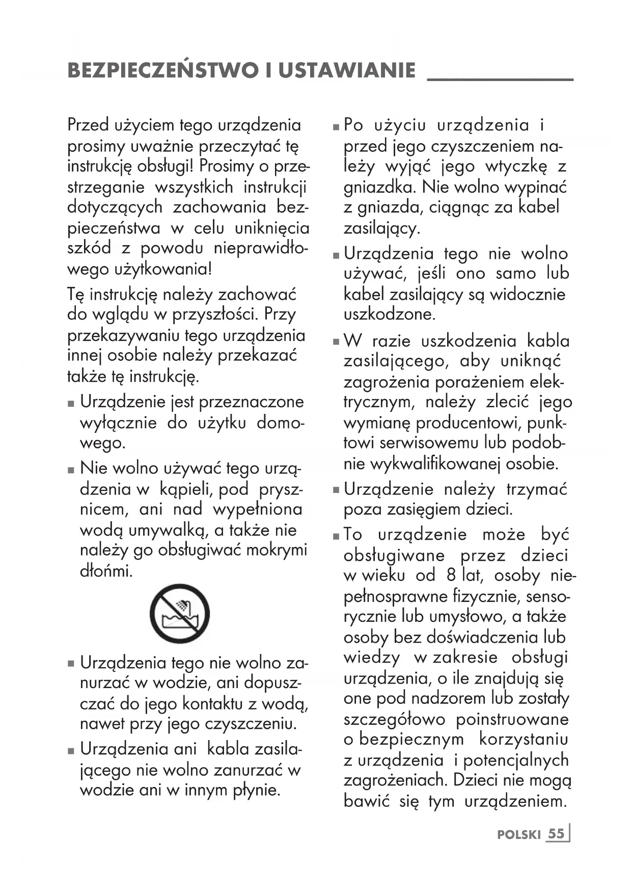 Nie wolno używać tego urzą- dzenia w kąpieli, pod prysz- nicem, ani nad wypełniona wodą umywalką, a także nie należy go obsługiwać mokrymi dłońmi.