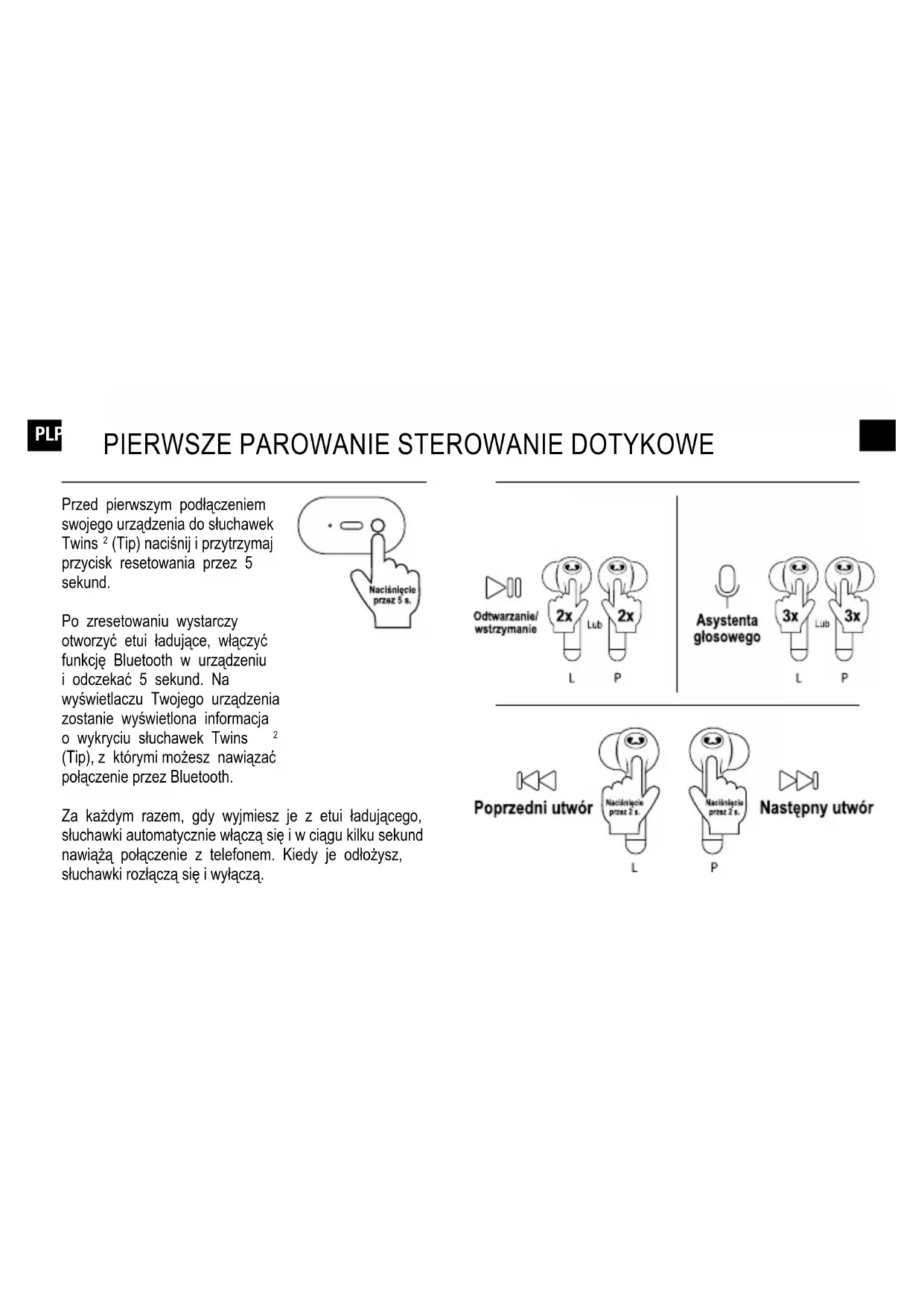 (Tip) naciśnij i przytrzymaj przycisk resetowania przez 5 sekund. Po zresetowaniu wystarczy otworzyć etui ładujące, włączyć funkcję Bluetooth w urządzeniu i odczekać 5 sekund. Na wyświetlaczu Twojego urządzenia zostanie wyświetlona informacja o wykryciu słuchawek Twins