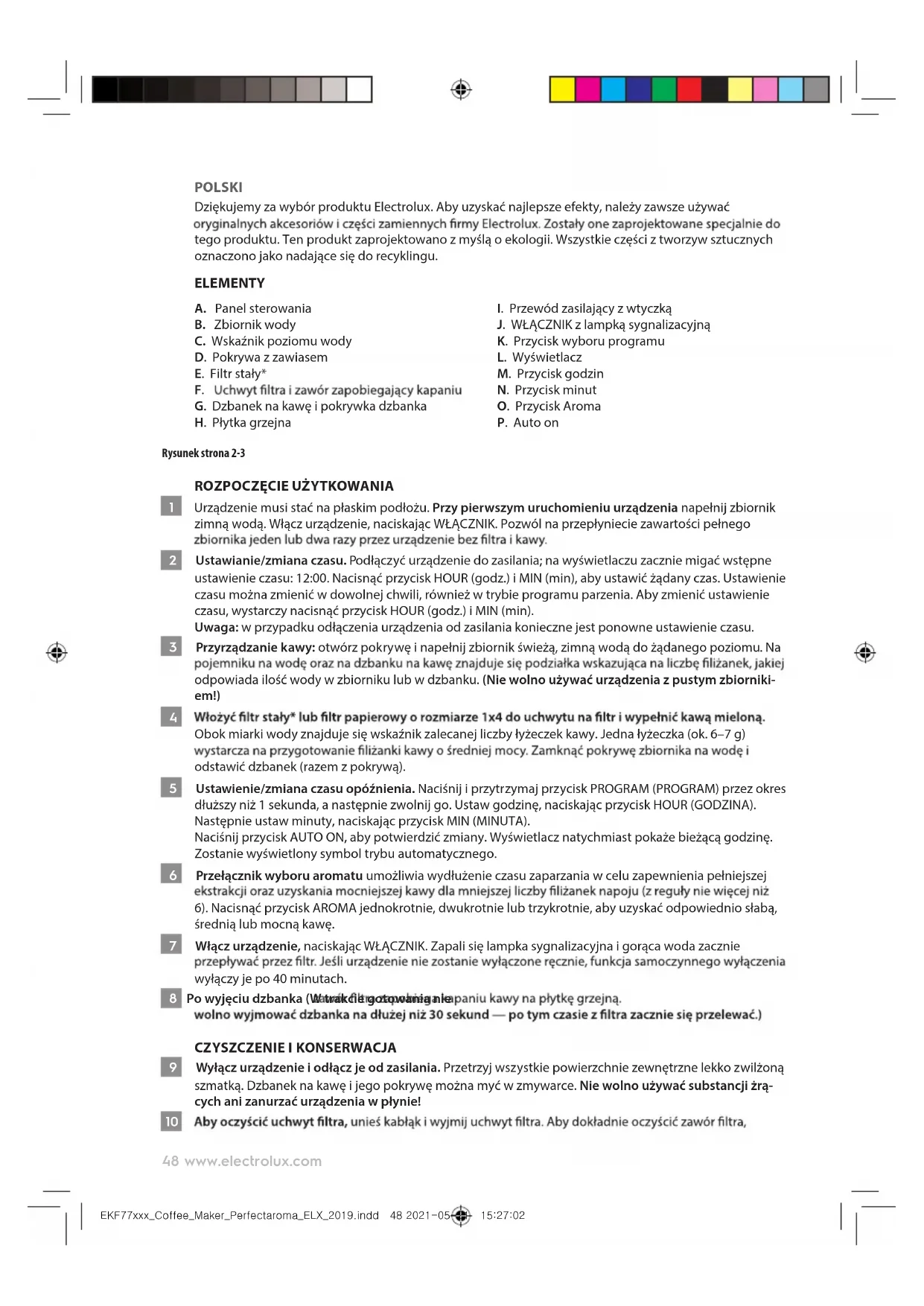 - Advarsel: Unngå å søle på koblingen. 2021-05-21 15:27:0248 www.electrolux.com POLSKI Dziękujemy za wybór produktu Electrolux. Aby uzyskać najlepsze efekty, należy zawsze używać tego produktu. Ten produkt zaprojektowano z myślą o ekologii. Wszystkie części z tworzyw sztucznych oznaczono jako nadające się do recyklingu. ELEMENTY A. Panel sterowania B. Zbiornik wody C. Wskaźnik poziomu wody D. Pokrywa z zawiasem E. Filtr stały*