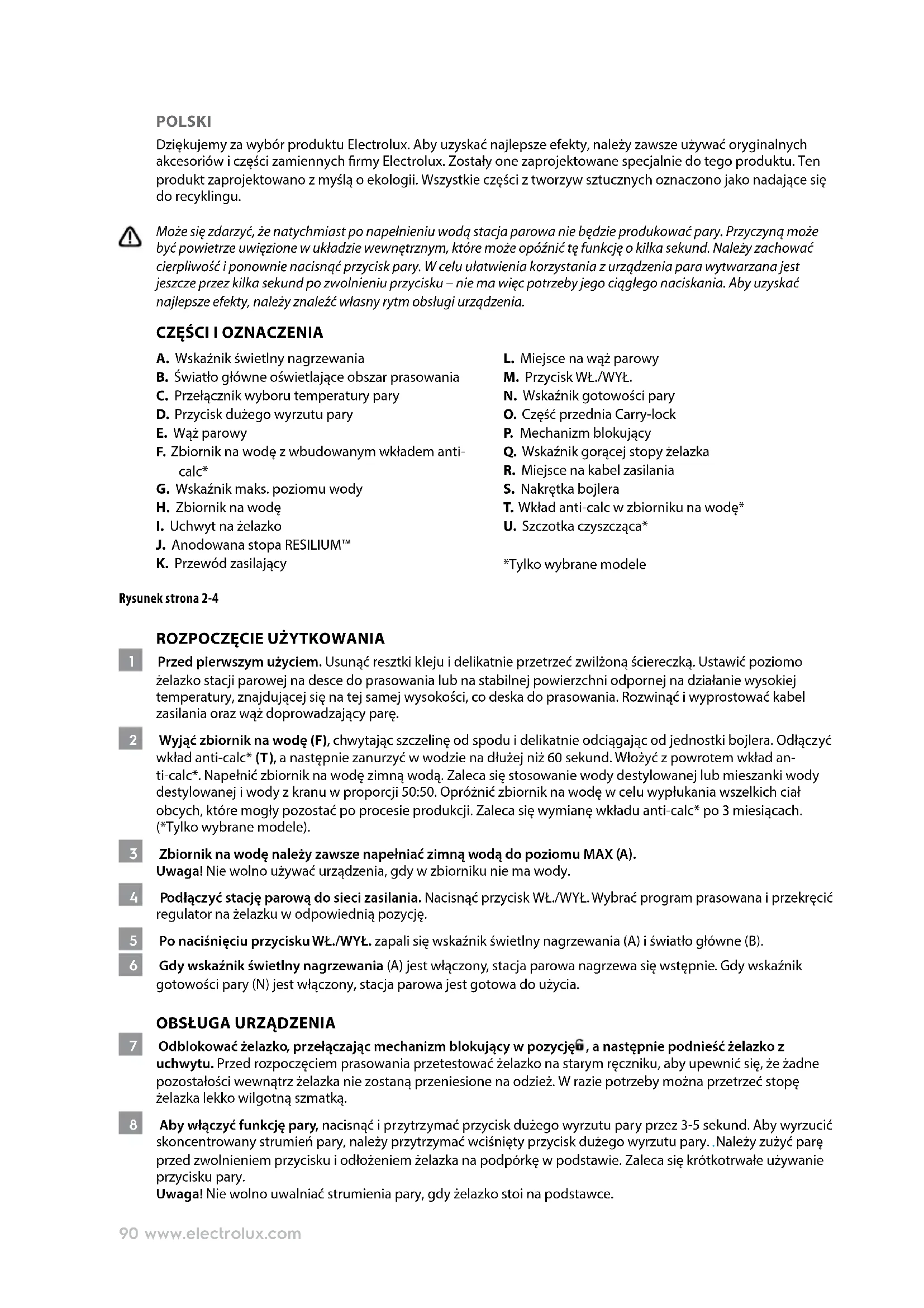 9 Wyłączyć urządzenie, naciskając przycisk WŁ./WYŁ. (światło zgaśnie). 10 Przed odłożeniem należy zawsze całkowicie schłodzić żelazko. Gdy żelazko jest chłodne, opróżnić zbiornik na wodę. Żelazko stacji parowej przechowywać w uchwycie. 11 Po zakończeniu korzystania z urządzenia należy je wyłączyć, naciskając przycisk WŁ./WYŁ. Odłożyć żelazko na uchwyt, a następnie przestawić mechanizm blokujący w pozycję , aby zabezpieczyć żelazko. 12 Kabel zasilania należy zawsze przechowywać w miejscu na kabel (R), a wąż parowy w miejscu na wąż (L) w podstawie stacji parowej. Ostrzeżenie! NIE WOLNO owijać kabla zasilania wokół żelazka. CZYSZCZENIE 13 Obrócić podstawę stacji na bok tak, aby nakrętka bojlera znajdowała się najwyżej. Odkręcić nakrętkę bojlera. Obrócić urządzenie na drugą stronę nad zlewem/umywalką i całkowicie opróżnić bojler. 14 Przygotować co najmniej 300 ml roztworu. Zachować zalecane proporcje składników. (Należy stosować zalecane proporcje mieszanki. Przy dużej ilości kamienia należy odpowiednio zwiększyć zawartość odkamieniacza). Uwaga: zalecamy środek do usuwania kamienia EUD5 rmyElectrolux. Należy przestrzegać instrukcji dotyczą- cych rozcieńczania środka w wodzie podanych na butelce.Zaleca się czyszczenie produktu co 2 miesiące. 15 Wylać powstałąmieszankę. Napełnić zbiornik czystą wodą, a następnie wylać zawartość. Powtórzyć tę czynność kilkakrotnie, aż do usunięcia kamienia i do momentu, kiedy zapach odkamieniacza nie będzie już wyczuwalny. Wlać jedną miarkę czystej wody do zbiornika, zakręcić pokrywkę i założyć zaślepkę. GWARANCJA NIE OBEJMUJE ZATKANIA SPOWODOWANEGO OSADZENIEM SIĘ KAMIENIA. Po zakończeniu czyszczenia nie należy całkowicie opróżniać pojemnika na wodę (generatora pary), lecz zostawić jej trochę w środku (przed ponownym zamknięciem). 16 Umieścić szczotkę czyszczącą* w otworze bojlera i oczyścić resztki wody oraz pozostałości osadu, trzymając jednocześnie urządzenie nad zlewem/umywalką. (*Tylko wybrane modele). 17 Delikatnie wyczyścić urządzenie zwilżoną ściereczką. Aby usunąć uporczywe plamy, można zastosować niew- ielką ilość nieściernego środka czyszczącego. Życzymy udanego użytkowania produktu Electrolux! BEZPIECZEŃSTWO Przeczytaj uważnie poniższe zalecenia przed pierwszym użyciem urządzenia.