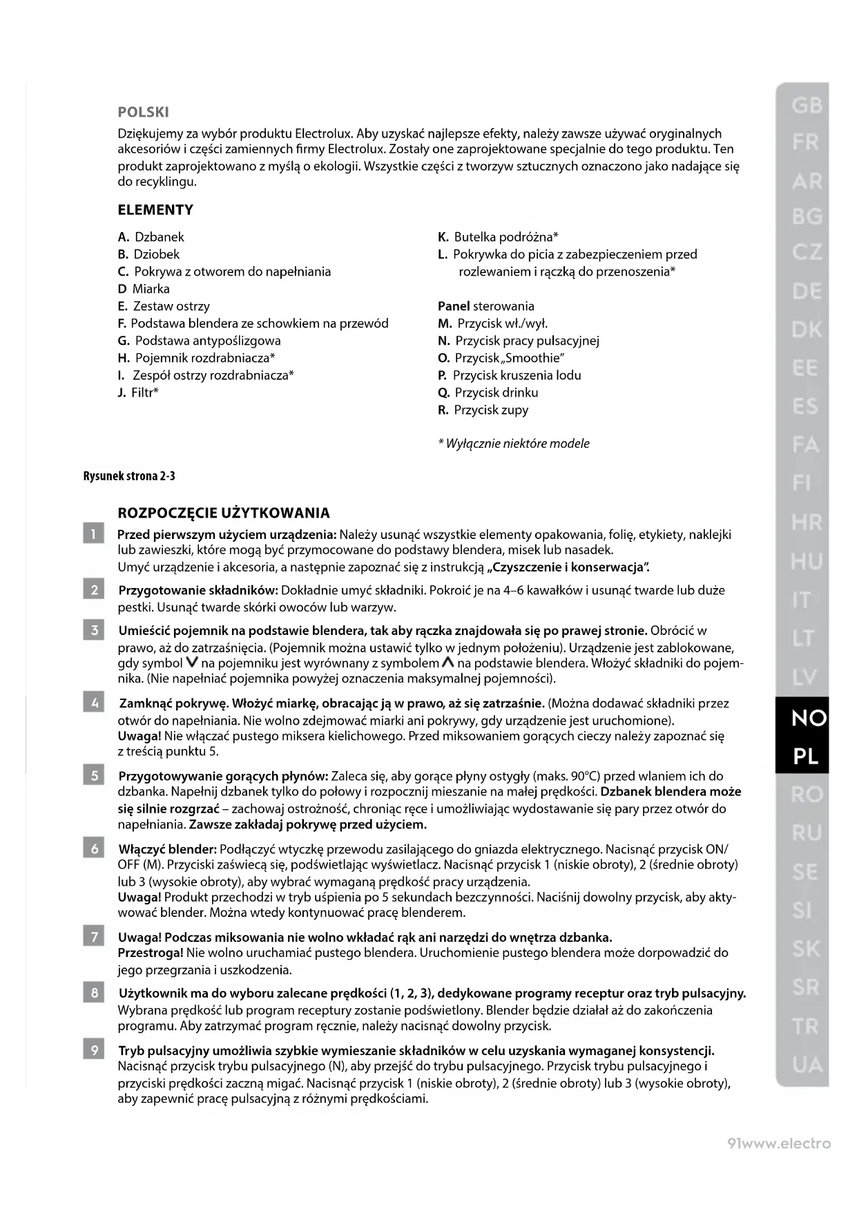 1 Przed pierwszym użyciem urządzenia: Należy usunąć wszystkie elementy opakowania, folię, etykiety, naklejki lub zawieszki, które mogą być przymocowane do podstawy blendera, misek lub nasadek. Umyć urządzenie i akcesoria, a następnie zapoznać się z instrukcją „Czyszczenie i konserwacja”. 2 Przygotowanie składników: Dokładnie umyć składniki. Pokroić je na 4–6 kawałków i usunąć twarde lub duże pestki. Usunąć twarde skórki owoców lub warzyw. 3 Umieścić pojemnik na podstawie blendera, tak aby rączka znajdowała się po prawej stronie. Obrócić w prawo, aż do zatrzaśnięcia. (Pojemnik można ustawić tylko w jednym położeniu). Urządzenie jest zablokowane, gdy symbol na pojemniku jest wyrównany zsymbolem na podstawie blendera. Włożyć składniki do pojem- nika. (Nie napełniać pojemnika powyżej oznaczenia maksymalnej pojemności). 4 Zamknąć pokrywę. Włożyć miarkę, obracając ją w prawo, aż się zatrzaśnie. (Można dodawać składniki przez otwór do napełniania. Nie wolno zdejmować miarki ani pokrywy, gdy urządzenie jest uruchomione). Uwaga! Nie włączać pustego miksera kielichowego. Przed miksowaniem gorących cieczy należy zapoznać się ztreścią punktu 5. 5 Przygotowywanie gorących płynów: Zaleca się, aby gorące płyny ostygły (maks. 90°C) przed wlaniem ich do dzbanka. Napełnij dzbanek tylko do połowy i rozpocznij mieszanie na małej prędkości. Dzbanek blendera może się silnie rozgrzać – zachowaj ostrożność, chroniąc ręce i umożliwiając wydostawanie się pary przez otwór do napełniania. Zawsze zakładaj pokrywę przed użyciem. 6 Włączyć blender: Podłączyć wtyczkę przewodu zasilającego do gniazda elektrycznego. Nacisnąć przycisk ON/ OFF (M). Przyciski zaświecą się, podświetlając wyświetlacz. Nacisnąć przycisk 1 (niskie obroty), 2 (średnie obroty) lub 3 (wysokie obroty), aby wybrać wymaganą prędkość pracy urządzenia. Uwaga! Produkt przechodzi w tryb uśpienia po 5 sekundach bezczynności. Naciśnij dowolny przycisk, aby akty- wować blender. Można wtedy kontynuować pracę blenderem. 7 Uwaga! Podczas miksowania nie wolno wkładać rąk ani narzędzi do wnętrza dzbanka. Przestroga! Nie wolno uruchamiać pustego blendera. Uruchomienie pustego blendera może dorpowadzić do jego przegrzania i uszkodzenia. 8 Użytkownik ma do wyboru zalecane prędkości (1, 2, 3), dedykowane programy receptur oraz tryb pulsacyjny. Wybrana prędkość lub program receptury zostanie podświetlony. Blender będzie działał aż do zakończenia programu. Aby zatrzymać program ręcznie, należy nacisnąć dowolny przycisk. 9 Tryb pulsacyjny umożliwia szybkie wymieszanie składników w celu uzyskania wymaganej konsystencji. Nacisnąć przycisk trybu pulsacyjnego (N), aby przejść do trybu pulsacyjnego. Przycisk trybu pulsacyjnego i przyciski prędkości zaczną migać. Nacisnąć przycisk 1 (niskie obroty), 2 (średnie obroty) lub 3 (wysokie obroty), aby zapewnić pracę pulsacyjną z różnymi prędkościami.92 www.electrolux.com 10 W urządzeniu można wybrać różne programy. Do wyboru jest kilka programów, jak kruszenie lodu (P), napój* (Q), smoothie (O) i zupa (R) (*w zależności od modelu). Blender wyłączy się automatycznie po zakończeniu programu. Uwaga! Produkt przechodzi w tryb uśpienia po 5 sekundach bezczynności. Naciśnij dowolny przycisk, aby akty- wować blender. Można wtedy kontynuować pracę blenderem. KORZYSTANIE Z UNIWERSALNEJ FUNKCJI ROZDRABNIANIA* * TYLKO NIEKTÓRE MODELE 11 Należy umieścić składniki w pojemniku rozdrabniacza (H). Umocować zespół z ostrzami rozdrabniacza (I) na ot- wartej stronie butelki, obracając go w lewo. Obrócić pojemnik rozdrabniacza. Docisnąć pojemnik rozdrabniacza do podstawy blendera (F) i zatrzasnąć go, obracając w prawo. Uwaga: Urządzenie jest zablokowane, gdy symbol na zespole noża młynka jest wyrównany zsymbolem na podstawie blendera. Przestroga! Ostrza są bardzo ostre! UŻYWANIE FILTRA* * TYLKO NIEKTÓRE MODELE 12 Przyrządzanie soku: Włożyć ltr (J) do pojemnika. Umieścić ltr wpojemniku tak, by jego szersza część była ski- erowana do góry. Wyrównać krawędź wewnątrz pojemnika blendera z wycięciem na dole ltra, tak aby dobrze było ono dopasowane do ltra. Umieścić owoce wewnątrz ltra (nie używać blendera do rozdrabniania owoców z dużymi pestkami, np. śliwki lub awokado). Zamocować pokrywę z miarką i rozpocząć mieszanie.