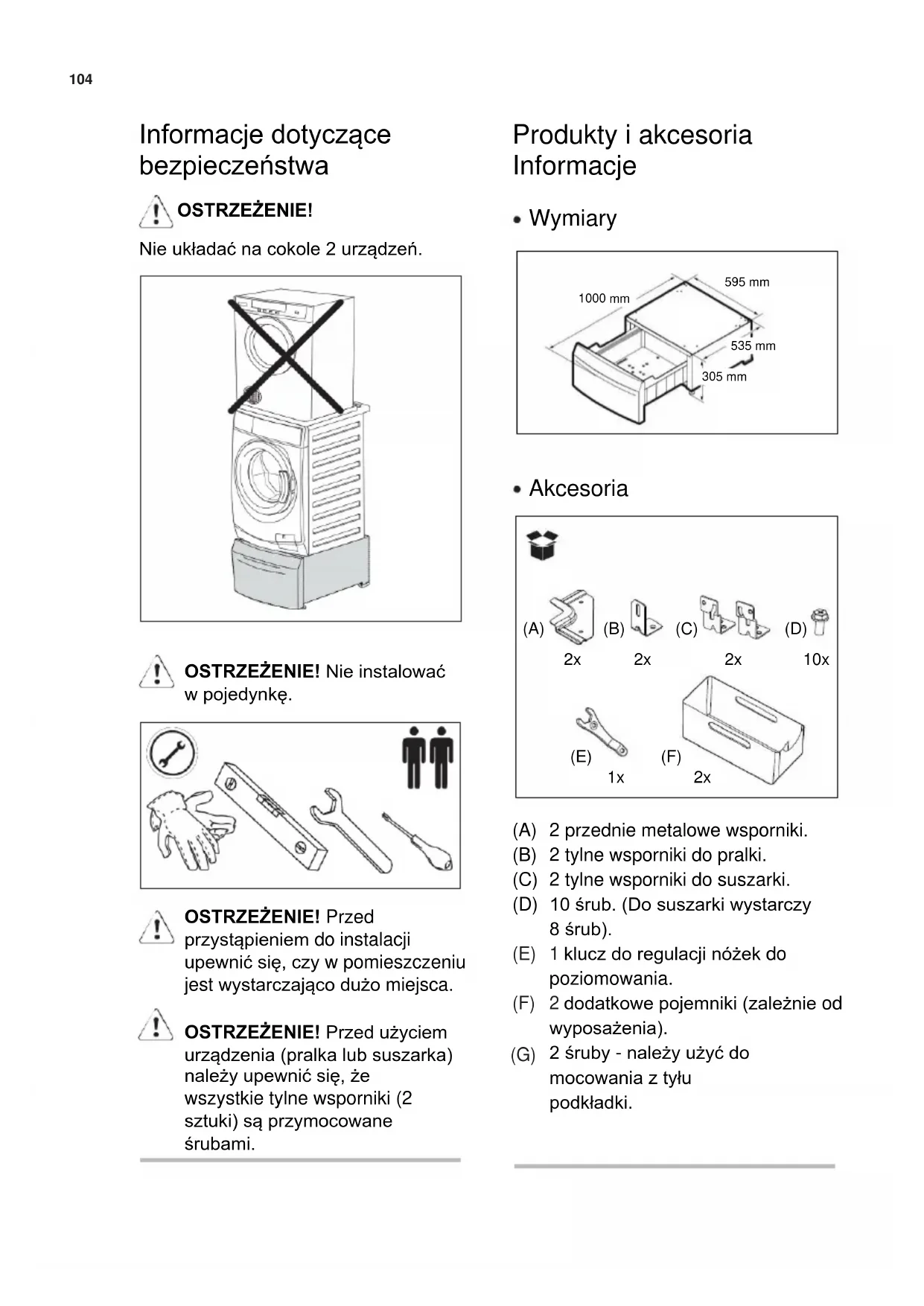 OSTRZEŻENIE! Przed przystąpieniem do instalacji upewnić się, czy w pomieszczeniu jest wystarczająco dużo miejsca. OSTRZEŻENIE! Przed użyciem urządzenia (pralka lub suszarka) należy upewnić się, że wszystkie tylne wsporniki (2 sztuki) są przymocowane śrubami.