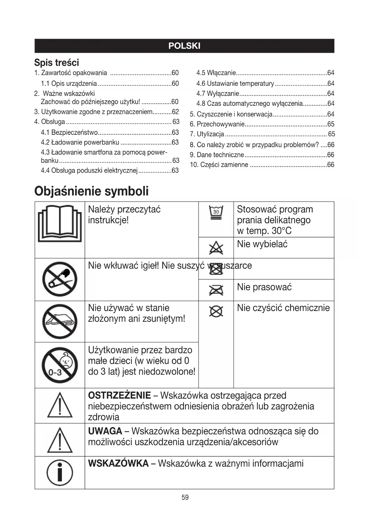 Objaśnienie symboli Należy przeczytać instrukcje! Stosować program prania delikatnego wtemp. 30°C Nie wybielać Nie wkłuwać igieł! Nie suszyć wsuszarce Nie prasować Nie używać wstanie złożonym ani zsuniętym! Nie czyścić chemicznie Użytkowanie przez bardzo małe dzieci (wwieku od 0 do 3lat) jest niedozwolone! OSTRZEŻENIE – Wskazówka ostrzegająca przed niebezpieczeństwem odniesienia obrażeń lub zagrożenia zdrowia UWAGA – Wskazówka bezpieczeństwa odnosząca się do możliwości uszkodzenia urządzenia/akcesoriów WSKAZÓWKA – Wskazówka zważnymi informacjami Spis treści60