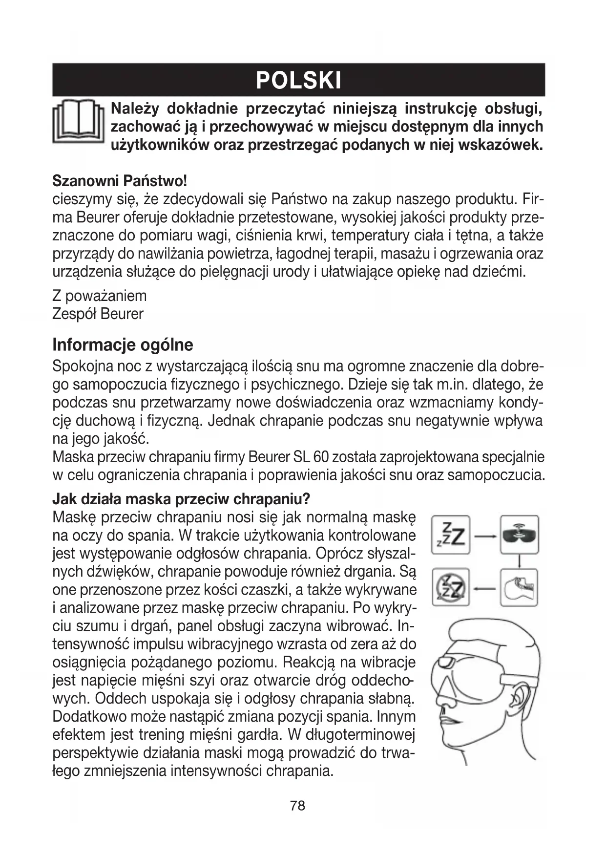 Более подробная информация погарантии/сервису находится вга- рантийном/сервисном талоне, который входит вкомплект поставки.78 POLSKI Szanowni Państwo! cieszymy się, że zdecydowali się Państwo na zakup naszego produktu. Fir- ma Beurer oferuje dokładnie przetestowane, wysokiej jakości produkty prze- znaczone do pomiaru wagi, ciśnienia krwi, temperatury ciała i tętna, a także przyrządy do nawilżania powietrza, łagodnej terapii, masażu i ogrzewania oraz urządzenia służące do pielęgnacji urody i ułatwiające opiekę nad dziećmi. Zpoważaniem Zespół Beurer Informacje ogólne Spokojna noc zwystarczającą ilością snu ma ogromne znaczenie dla dobre- go samopoczucia fizycznego ipsychicznego. Dzieje się tak m.in. dlatego, że podczas snu przetwarzamy nowe doświadczenia oraz wzmacniamy kondy- cję duchową ifizyczną. Jednak chrapanie podczas snu negatywnie wpływa na jego jakość. Maska przeciw chrapaniu firmy Beurer SL 60 została zaprojektowana specjalnie wcelu ograniczenia chrapania ipoprawienia jakości snu oraz samopoczucia. Jak działa maska przeciw chrapaniu? Maskę przeciw chrapaniu nosi się jak normalną maskę na oczy do spania. Wtrakcie użytkowania kontrolowane jest występowanie odgłosów chrapania. Oprócz słyszal- nych dźwięków, chrapanie powoduje również drgania. Są one przenoszone przez kości czaszki, atakże wykrywane ianalizowane przez maskę przeciw chrapaniu. Po wykry- ciu szumu idrgań, panel obsługi zaczyna wibrować. In- tensywność impulsu wibracyjnego wzrasta od zera aż do osiągnięcia pożądanego poziomu. Reakcją na wibracje jest napięcie mięśni szyi oraz otwarcie dróg oddecho