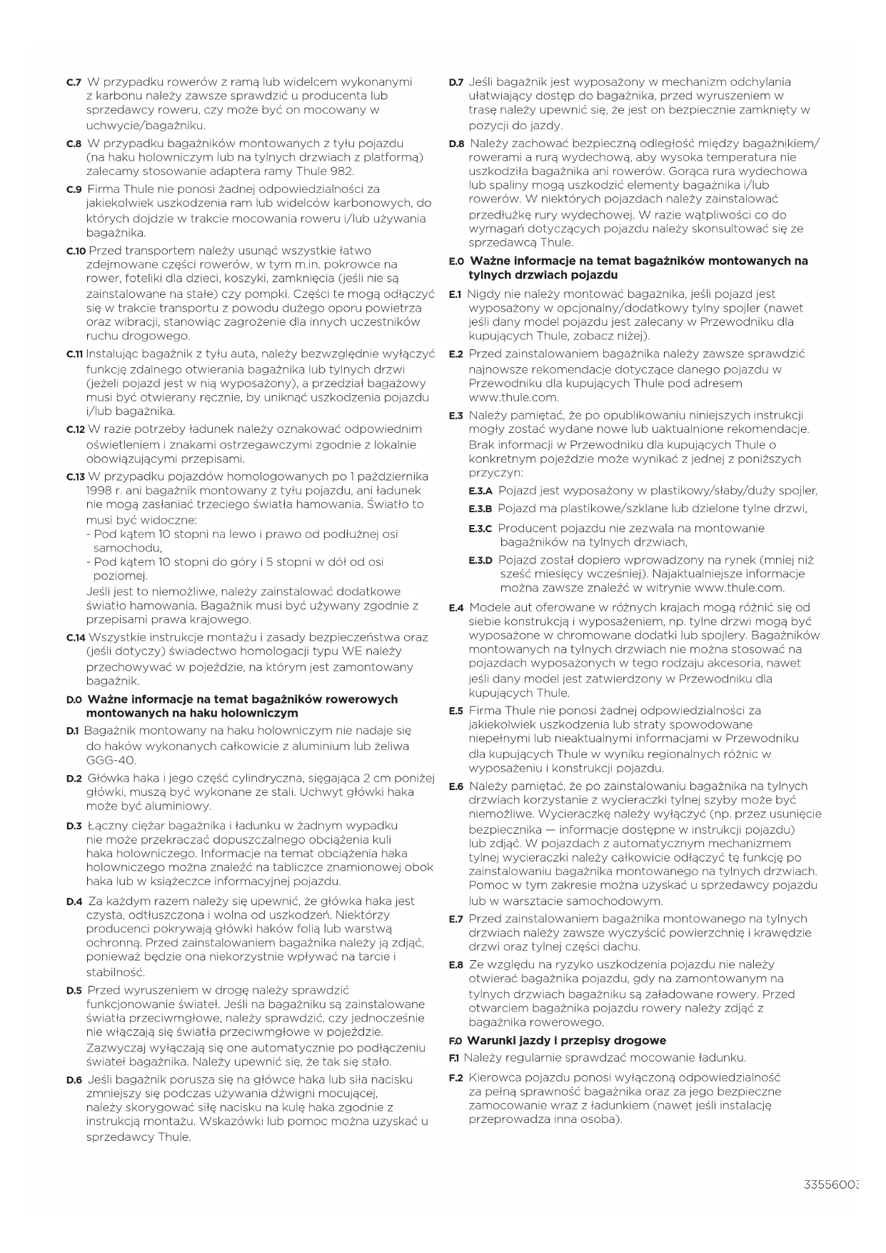 A.0 Uwagi ogólne A.1 Firma Thule nie ponosi żadnej odpowiedzialności za obrażenia ciała, uszkodzenia mienia ruchomego i nieruchomego, utratę zysków ani inne straty lub szkody spowodowane przez nieprawidłową instalację bagażnika lub korzystanie z niego wniewłaściwy sposób, w tym instalację lub korzystanie niezgodne z instrukcją montażu i mocowania bądź innymi instrukcjami udostępnionymi użytkownikowi w formie pisemnej lub ustnej przez firmę Thule lub sprzedawcę Thule. A.2 Bagażnik ani jego części nie mogą być w żaden sposób modyfikowane. A.3 Wszystkie pytania dotyczące obsługi, używania i ograniczeń w użytkowaniu bagażnika należy kierować do sprzedawcy Thule. Przed montażem i rozpoczęciem używania bagażnika należy uważnie przeczytać wszystkie instrukcje oraz informacje dotyczące gwarancji. B.0 Montaż B.1 W instrukcji montażu należy sprawdzić, czy w komplecie znajdują się wszystkie potrzebne części. B.2 Należy uważnie przeczytać instrukcję montażu i listę rekomendacyjną – jeśli jest dołączona – i postępować zgodnie z zawartymi w nich zaleceniami. Montaż zestawu należy przeprowadzić w kolejności przedstawionej w instrukcji (1,2,3...). B.3 Nie należy podejmować prób mocowania bagażnika w jakikolwiek inny sposób niż przedstawiony w instrukcji montażu. C.0 Ładowanie C.1 Nie wolno obciążać bagażnika powyżej maksymalnej ładowności określonej w instrukcji montażu. Ponadto pierwszeństwo nad ładownością podaną w instrukcji bagażnika ma maksymalna ładowność określona dla danego modelu samochodu. Najważniejsza jest zawsze niższa z podanych ładowności iwżadnym wypadku nie wolno jej przekraczać. C.2 Maksymalne obciążenie bagażnika według instrukcji obsługi dotyczy zarówno pojazdów w ruchu, jak i nieruchomych. C.3 Ładunek musi być starannie zabezpieczony. Nie wolno używać elastycznych gum mocujących. C.4 Należy sprawdzić i nie przekraczać maksymalnego ciężaru pojedynczego roweru podanego w instrukcji montażu. C.5 Ładując rowery na bagażniku montowanym na tylnych drzwiach pojazdu lub na haku holowniczym, należy zawsze umieścić największy i najcięższy rower najbliżej samochodu, a dalej kolejno mniejsze i lżejsze. C.6 Bagażnik jest przeznaczony do przewożenia wyłącznie rowerów o standardowych ramach. Nie wolno przewozić na bagażniku rowerów typu tandem. Za każdym razem należy sprawdzać maksymalny wymiar ramy roweru (średnicę) określony w instrukcji montażu i nie przekraczać tej wartości.335560032001 C.7 W przypadku rowerów z ramą lub widelcem wykonanymi zkarbonu należy zawsze sprawdzić u producenta lub sprzedawcy roweru, czy może być on mocowany w uchwycie/bagażniku. C.8 W przypadku bagażników montowanych z tyłu pojazdu (nahaku holowniczym lub na tylnych drzwiach z platformą) zalecamy stosowanie adaptera ramy Thule 982. C.9 Firma Thule nie ponosi żadnej odpowiedzialności za jakiekolwiek uszkodzenia ram lub widelców karbonowych, do których dojdzie w trakcie mocowania roweru i/lub używania bagażnika. C.10 Przed transportem należy usunąć wszystkie łatwo zdejmowane części rowerów, w tym m.in. pokrowce na rower, foteliki dla dzieci, koszyki, zamknięcia (jeśli nie są zainstalowane na stałe) czy pompki. Części te mogą odłączyć się w trakcie transportu z powodu dużego oporu powietrza oraz wibracji, stanowiąc zagrożenie dla innych uczestników ruchu drogowego. C.11 Instalując bagażnik z tyłu auta, należy bezwzględnie wyłączyć funkcję zdalnego otwierania bagażnika lub tylnych drzwi (jeżeli pojazd jest w nią wyposażony), a przedział bagażowy musi być otwierany ręcznie, by uniknąć uszkodzenia pojazdu i/lub bagażnika. C.12 W razie potrzeby ładunek należy oznakować odpowiednim oświetleniem i znakami ostrzegawczymi zgodnie z lokalnie obowiązującymi przepisami. C.13 W przypadku pojazdów homologowanych po 1 października 1998 r. ani bagażnik montowany z tyłu pojazdu, ani ładunek nie mogą zasłaniać trzeciego światła hamowania. Światło to musi być widoczne: - Pod kątem 10 stopni na lewo i prawo od podłużnej osi samochodu, - Pod kątem 10 stopni do góry i 5 stopni w dół od osi poziomej. Jeśli jest to niemożliwe, należy zainstalować dodatkowe światło hamowania. Bagażnik musi być używany zgodnie z przepisami prawa krajowego. C.14 Wszystkie instrukcje montażu i zasady bezpieczeństwa oraz (jeśli dotyczy) świadectwo homologacji typu WE należy przechowywać w pojeździe, na którym jest zamontowany bagażnik. D.0 Ważne informacje na temat bagażników rowerowych montowanych na haku holowniczym D.1 Bagażnik montowany na haku holowniczym nie nadaje się do haków wykonanych całkowicie z aluminium lub żeliwa GGG-40. D.2 Główka haka i jego część cylindryczna, sięgająca 2cm poniżej główki, muszą być wykonane ze stali. Uchwyt główki haka może być aluminiowy. D.3 Łączny ciężar bagażnika i ładunku w żadnym wypadku nie może przekraczać dopuszczalnego obciążenia kuli haka holowniczego. Informacje na temat obciążenia haka holowniczego można znaleźć na tabliczce znamionowej obok haka lub w książeczce informacyjnej pojazdu. D.4 Za każdym razem należy się upewnić, że główka haka jest czysta, odtłuszczona i wolna od uszkodzeń. Niektórzy producenci pokrywają główki haków folią lub warstwą ochronną. Przed zainstalowaniem bagażnika należy ją zdjąć, ponieważ będzie ona niekorzystnie wpływać na tarcie i stabilność. D.5 Przed wyruszeniem w drogę należy sprawdzić funkcjonowanie świateł. Jeśli na bagażniku są zainstalowane światła przeciwmgłowe, należy sprawdzić, czy jednocześnie nie włączają się światła przeciwmgłowe w pojeździe. Zazwyczaj wyłączają się one automatycznie po podłączeniu świateł bagażnika. Należy upewnić się, że tak się stało. D.6 Jeśli bagażnik porusza się na główce haka lub siła nacisk