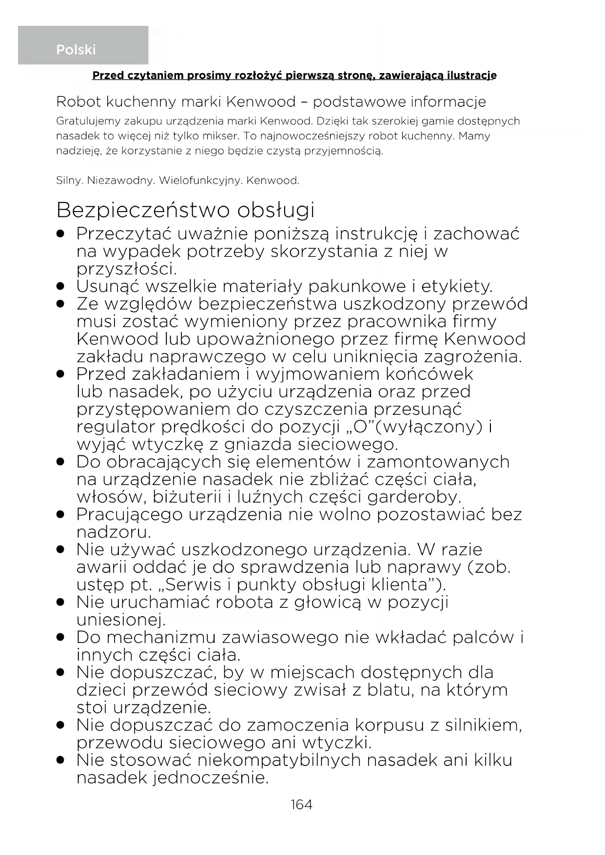 Urządzenie jest przeznaczone wyłącznie do zgodnego z przeznaczeniem użytku domowego. Firma Kenwood nie ponosi odpowiedzialności za wypadki i uszkodzenia powstałe podczas niewłaściwej eksploatacji urządzenia lub w wyniku nieprzestrzegania niniejszej instrukcji. Przed podłączeniem do sieci