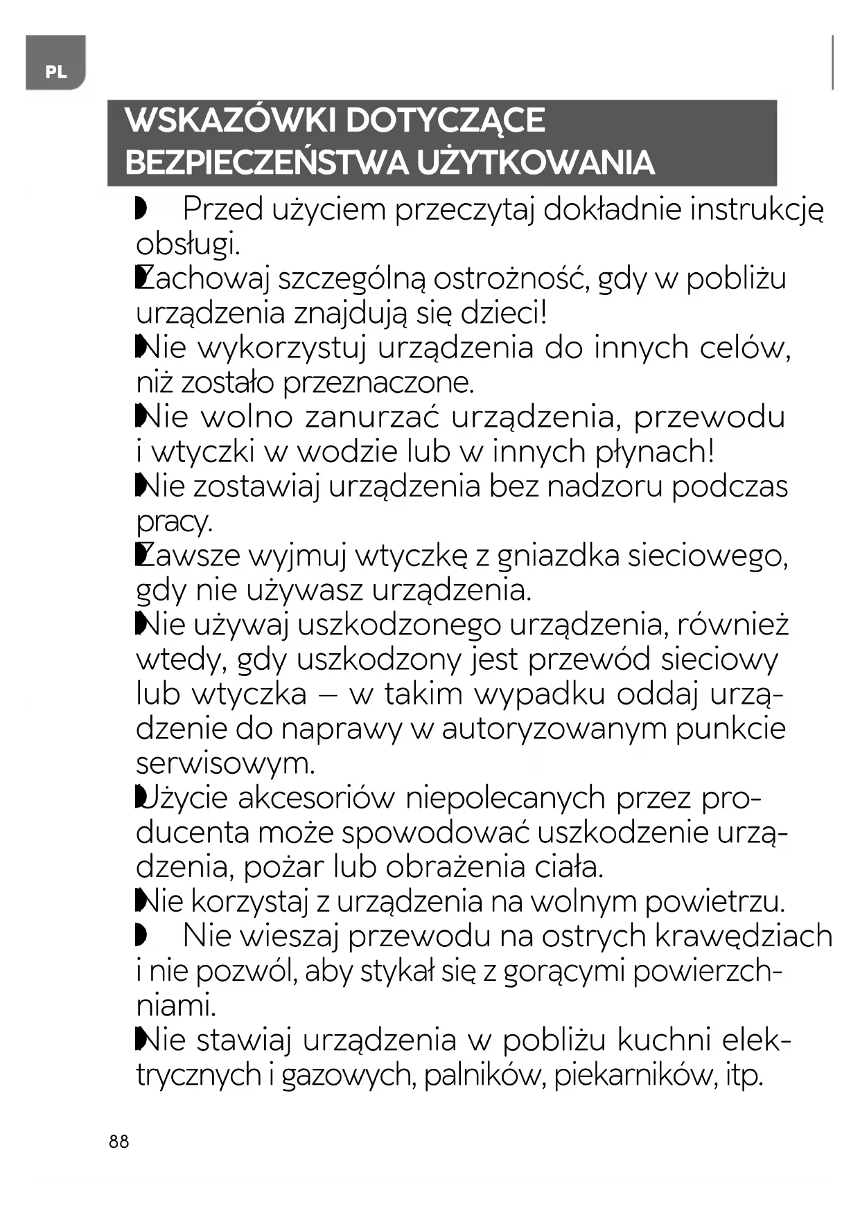 Przechowuj urządzenie i jego przewód w miejscu niedostępnym dla dzieci poniżej 8 lat. Dzieci nie mogą bawić się urządzeniem.90