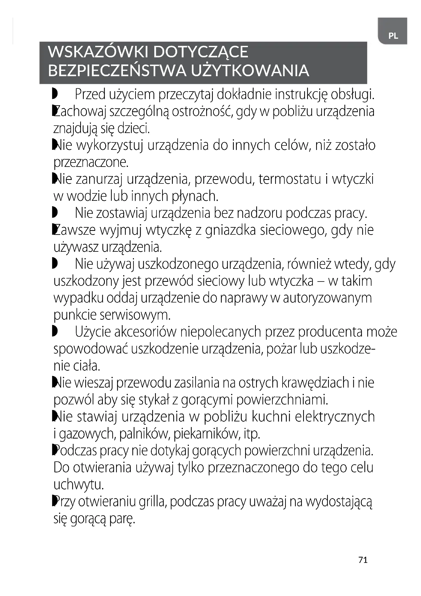 Przy otwieraniu grilla, podczas pracy uważaj na wydostającą się gorącą parę.72