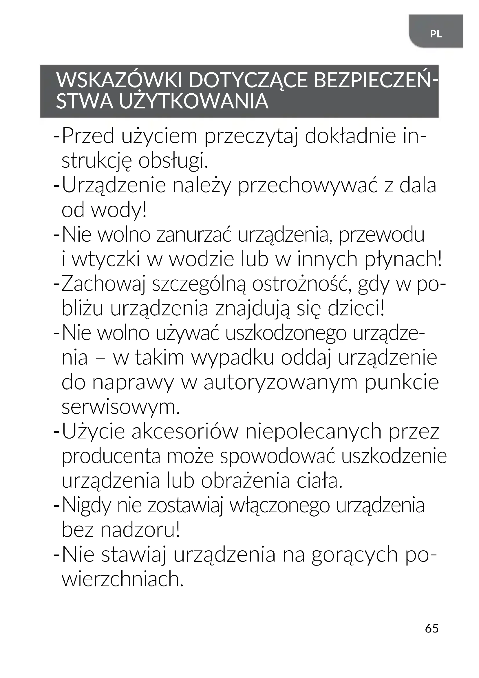 Nie wolno zanurzać urządzenia, przewodu i wtyczki w wodzie lub w innych płynach!