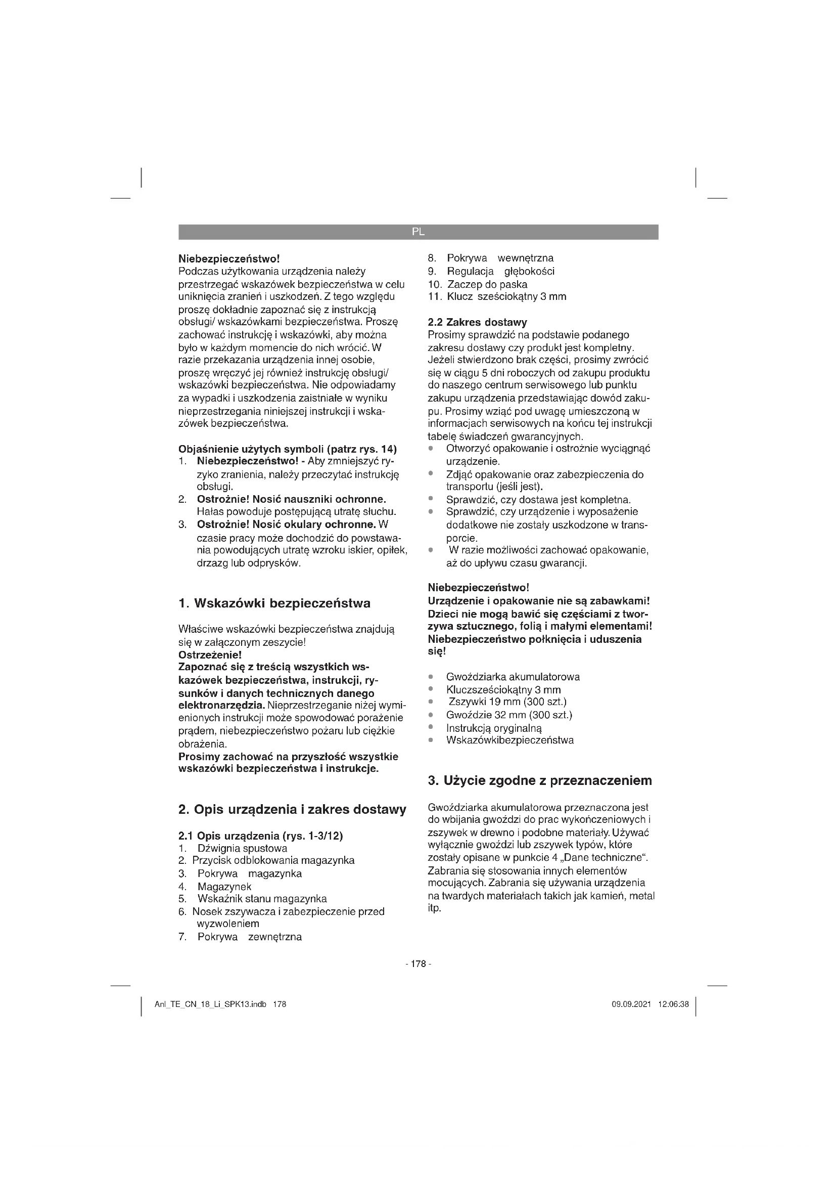 Gwoździarka akumulatorowa przeznaczona jest do wbijania gwoździ do prac wykończeniowych i zszywek w drewno i podobne materiały. Używać wyłącznie gwoździ lub zszywek typów, które zostały opisane w punkcie 4 „Dane techniczne“. Zabrania się stosowania innych elementów mocujących. Zabrania się używania urządzenia na twardych materiałach takich jak kamień, metal itp. Anl_TE_CN_18_Li_SPK13.indb 178Anl_TE_CN_18_Li_SPK13.indb 178 09.09.2021 12:06:3809.09.2021 12:06:38PL